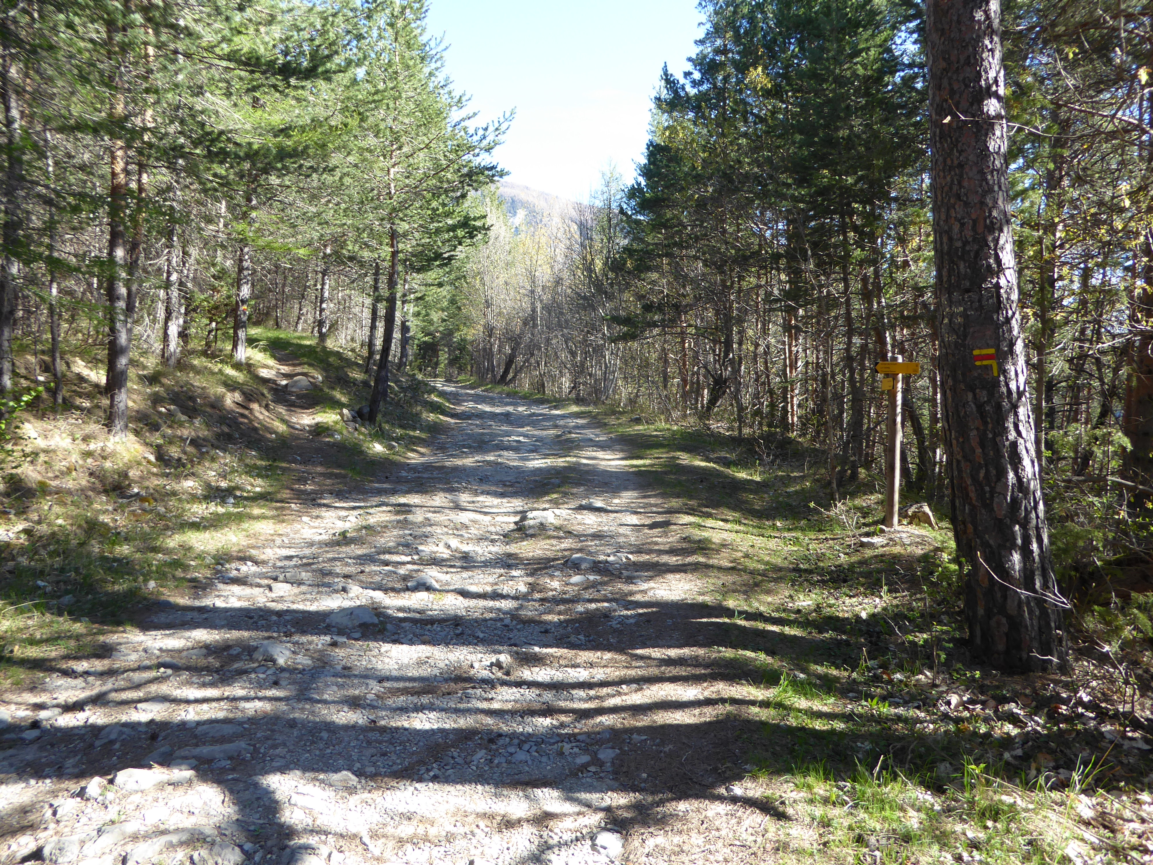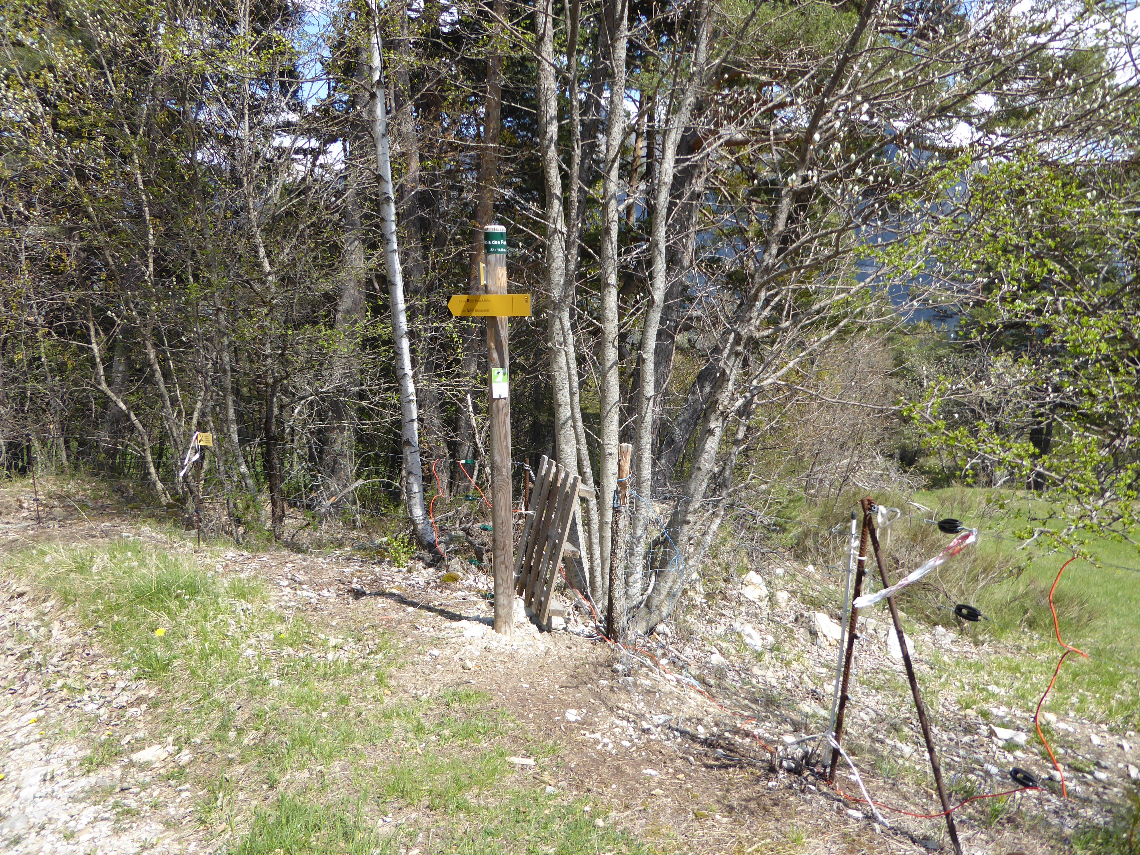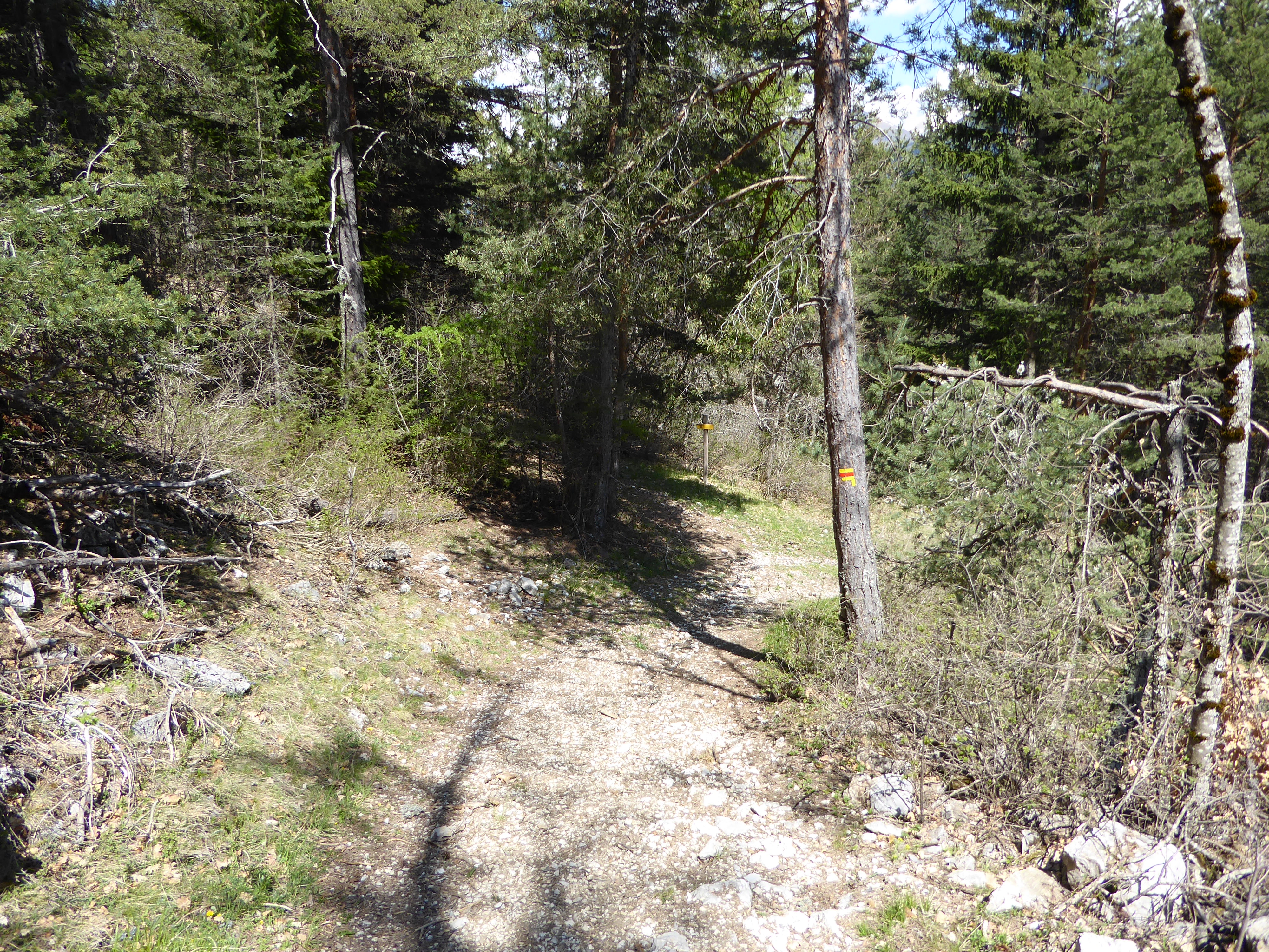 Bois des Fabres (1410 m) : tourner à droite direction Beauvezer, balisé en jaune et rouge