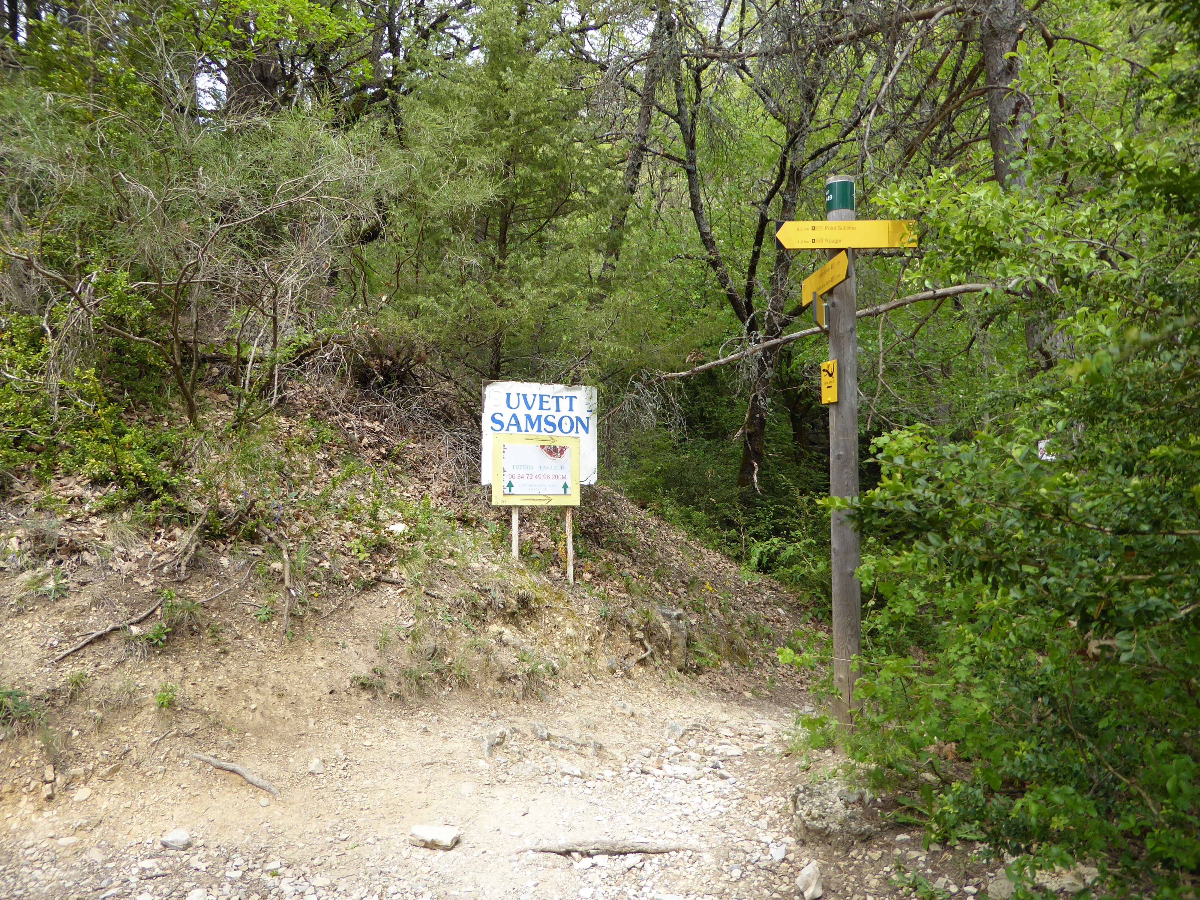A ce croisement muni de panneaux directionnels (600 mètres après le lieu-dit "Pas d'Issane"), suivre le chemin partant légèrement sur la gauche direction Point Sublime, balisé en rouge et blanc