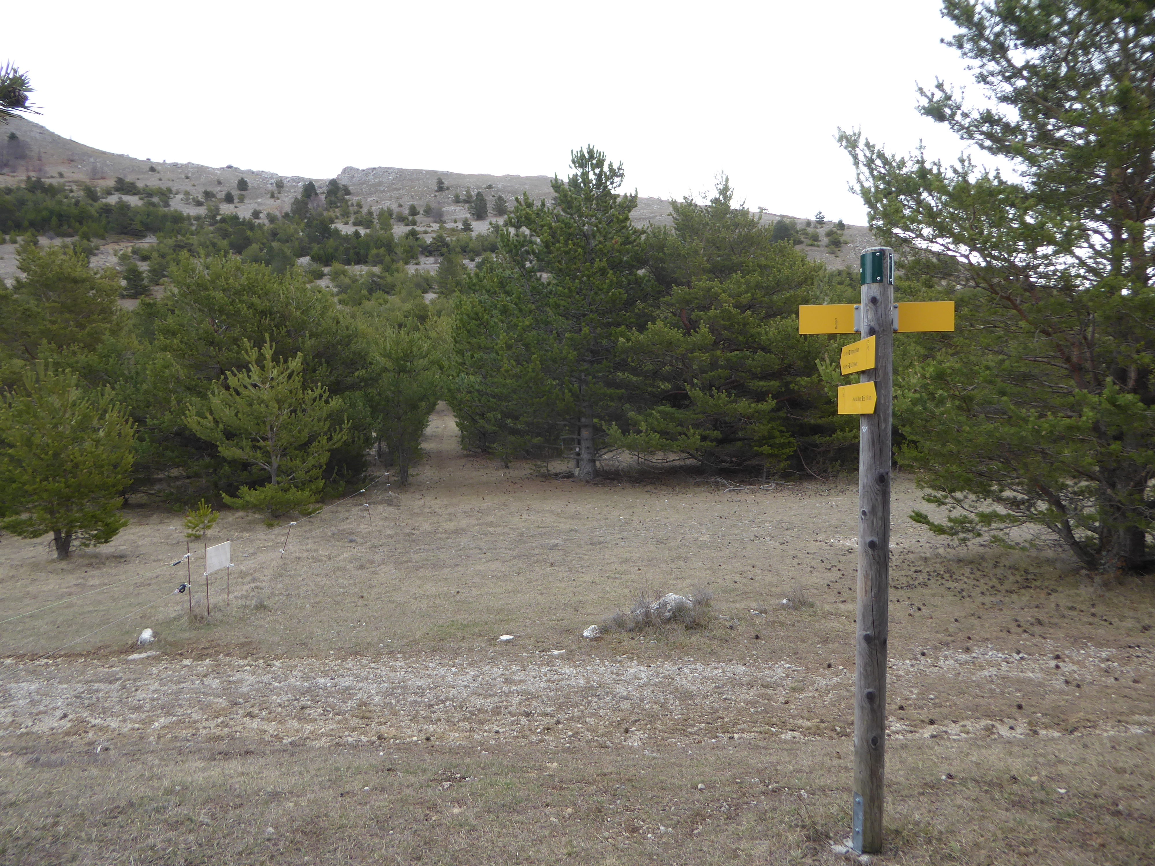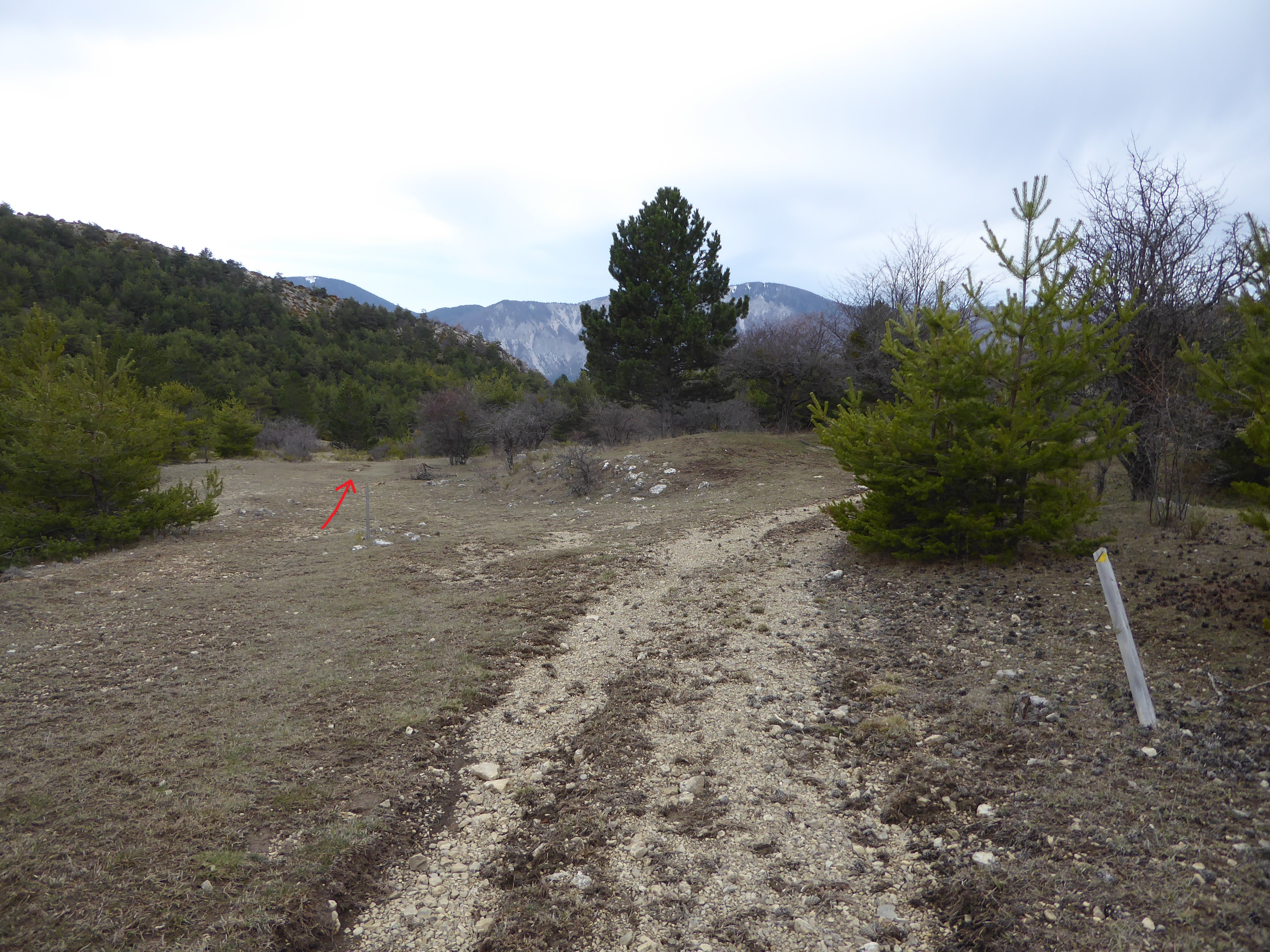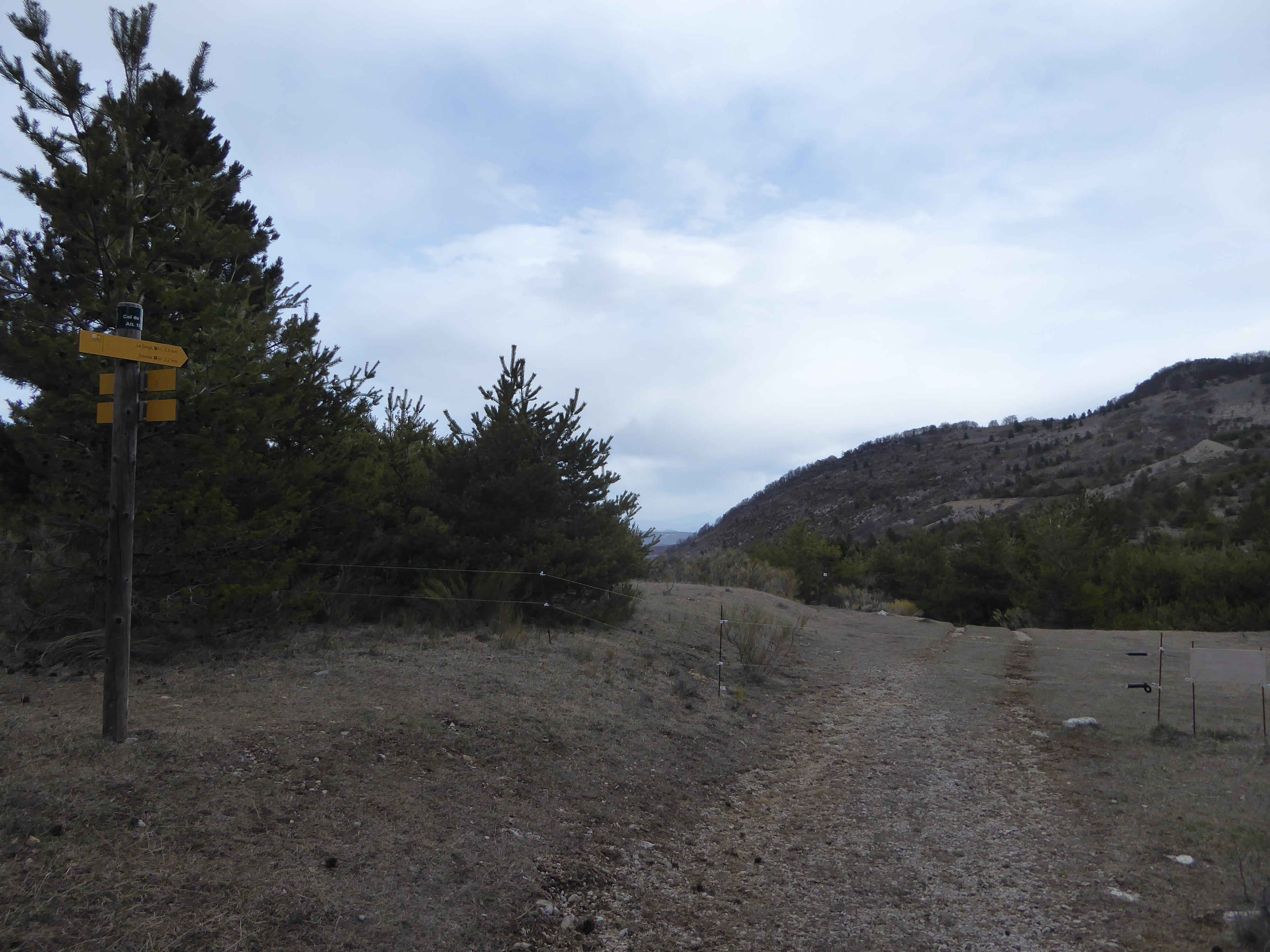 Peu après le Col de Verdun, au niveau de ces piquets marqués d'une balise jaune, suivre le chemin peu marqué partant de biais sur la gauche direction Saint-Vincent-sur-Jabron, balisé en jaune