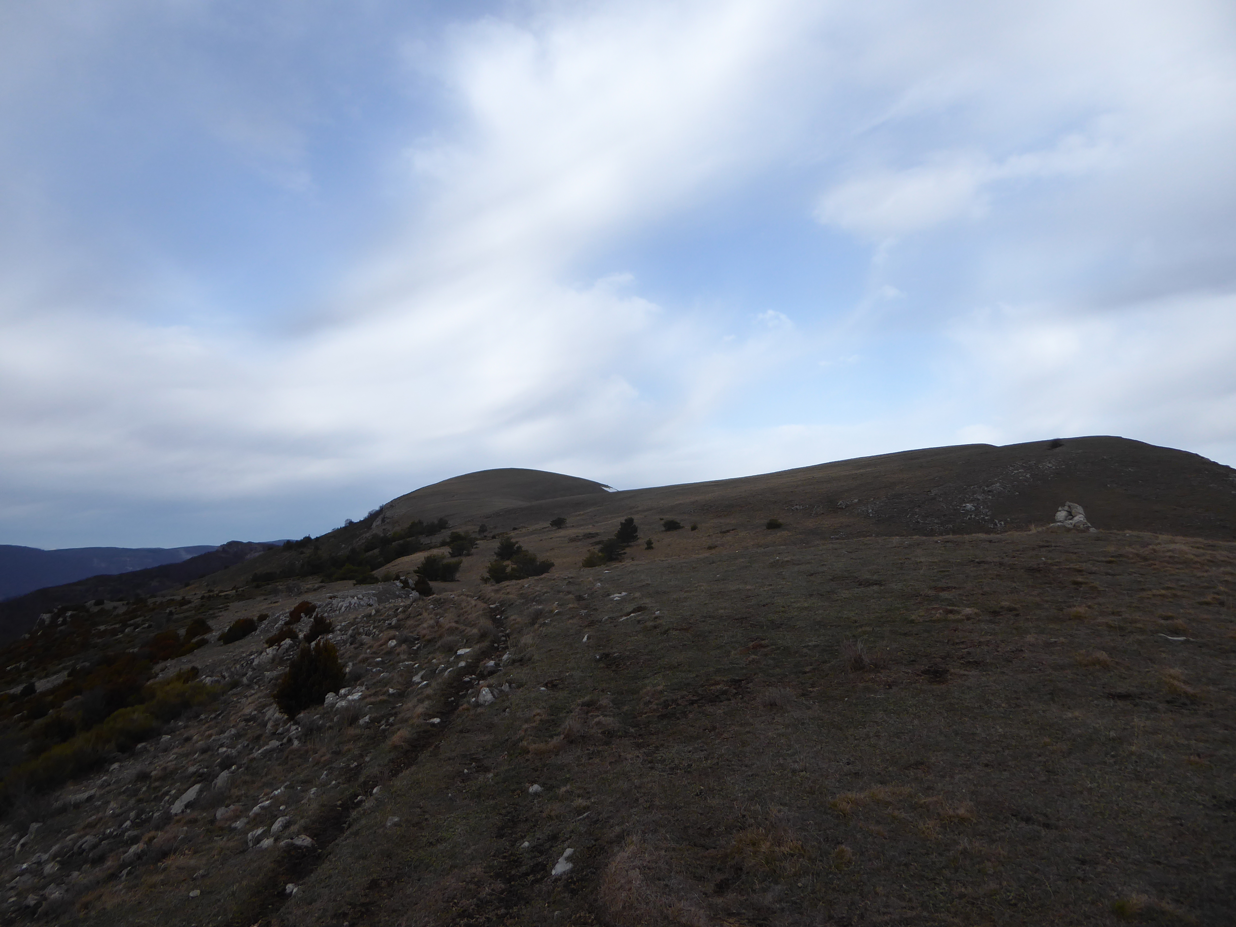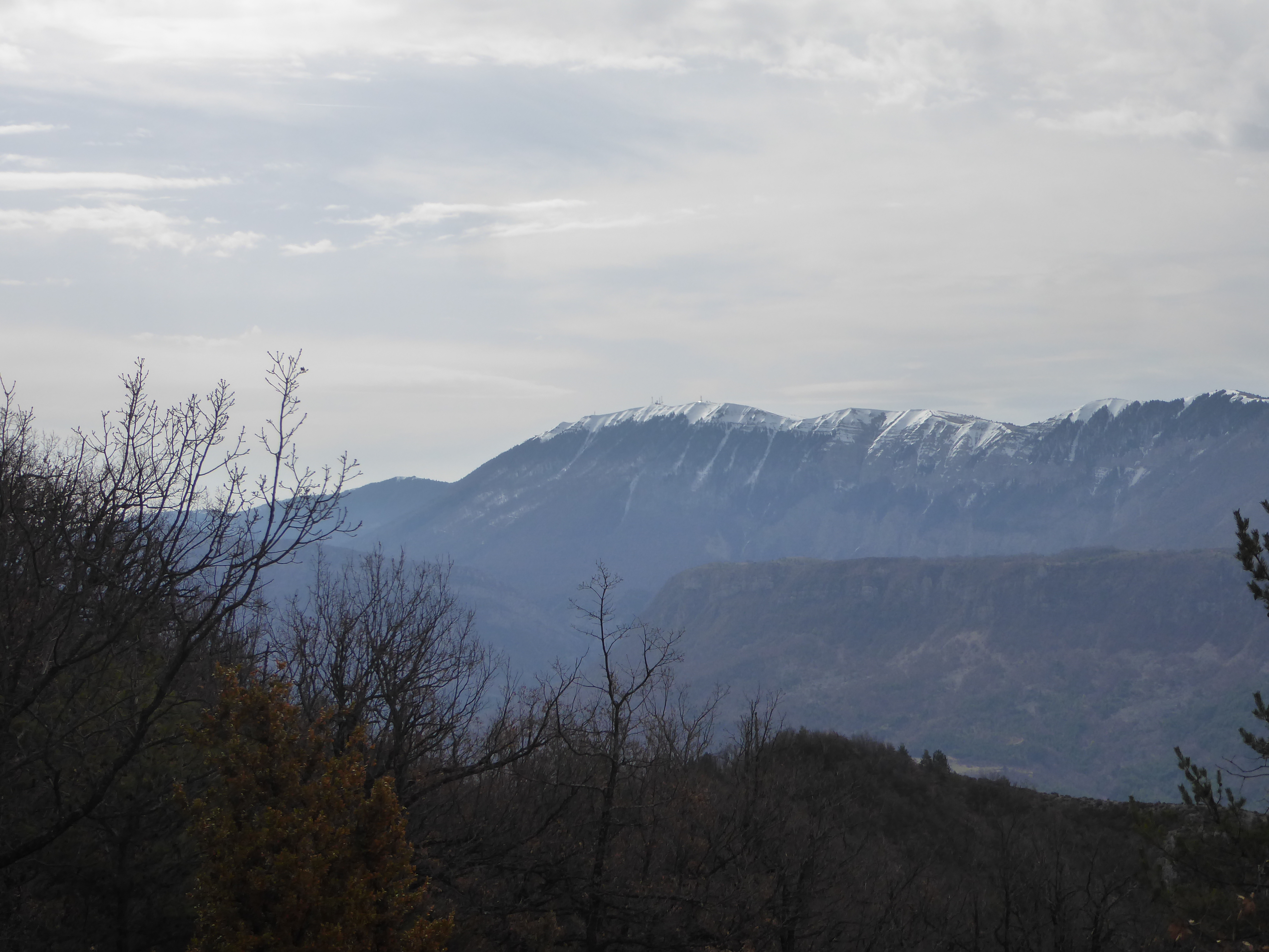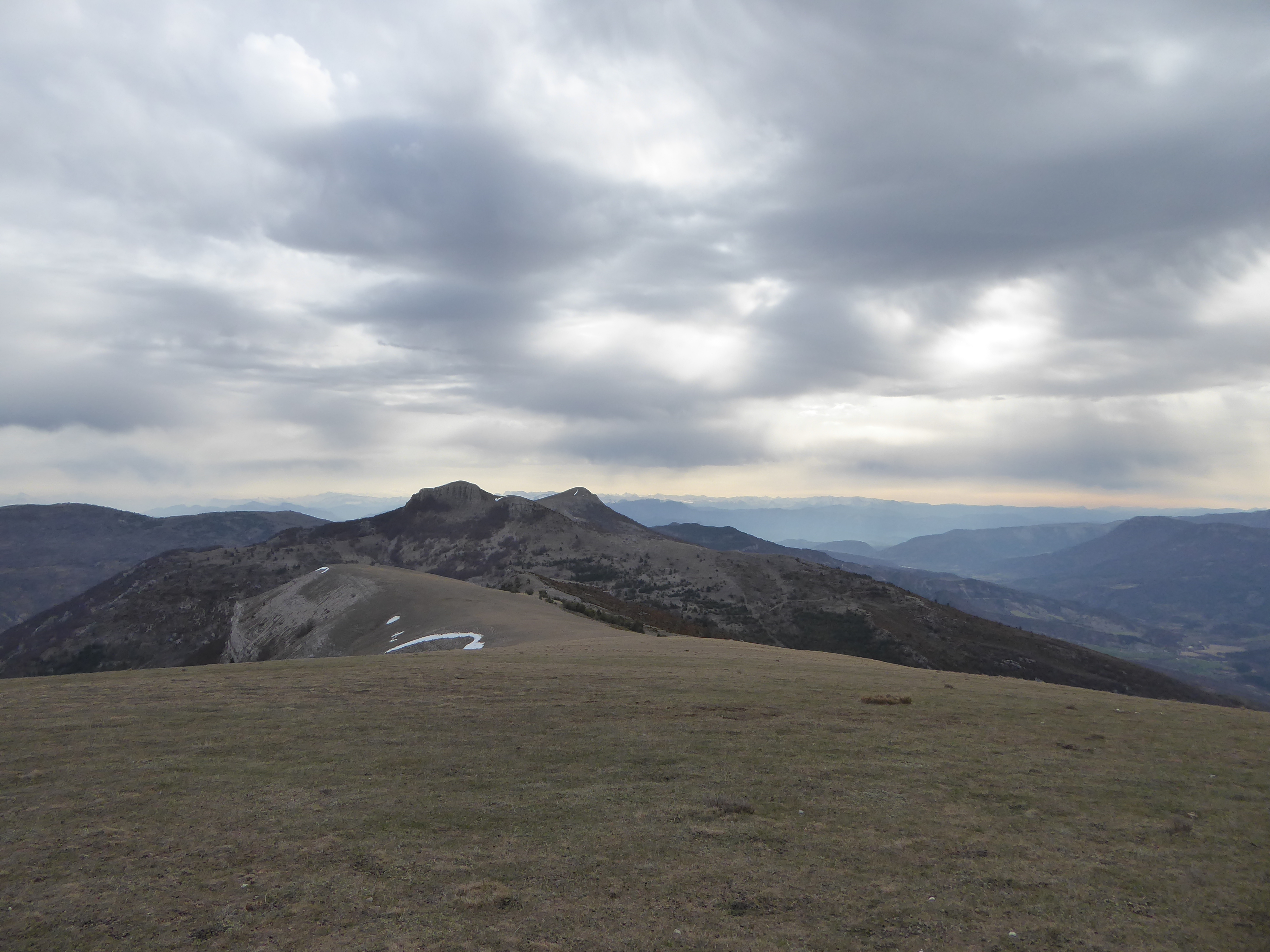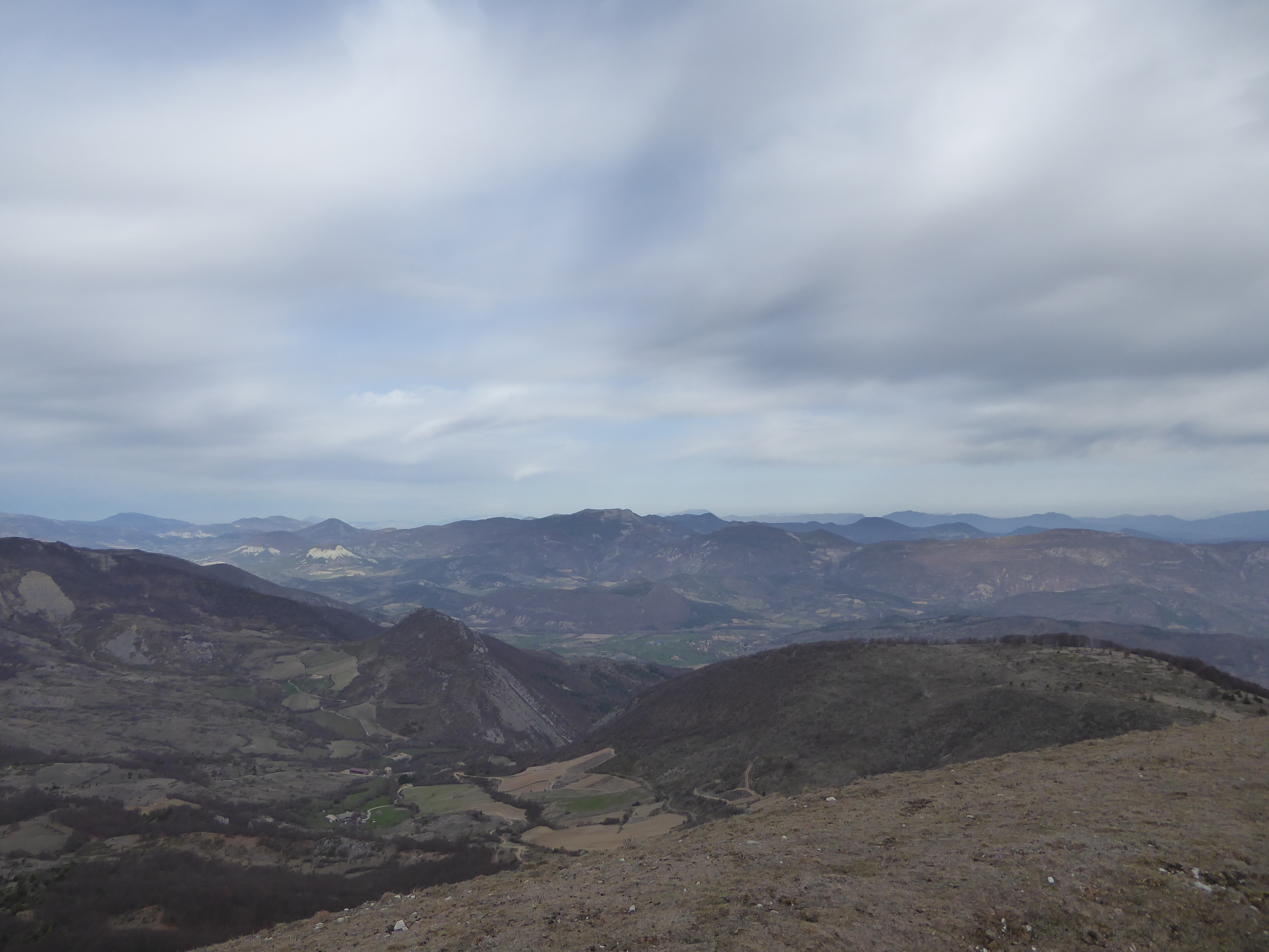 Arrivée au sommet de la Montagne du Pied du Mulet (1537 m) : panorama étendu notamment sur les sommets des Baronnies Provençales, de la Drôme Provençale, du Dévoluy, du Gapençais, des Préalpes de Digne, sur Lure et le Ventoux ... aujourd'hui c'est un peu plus brumeux !
