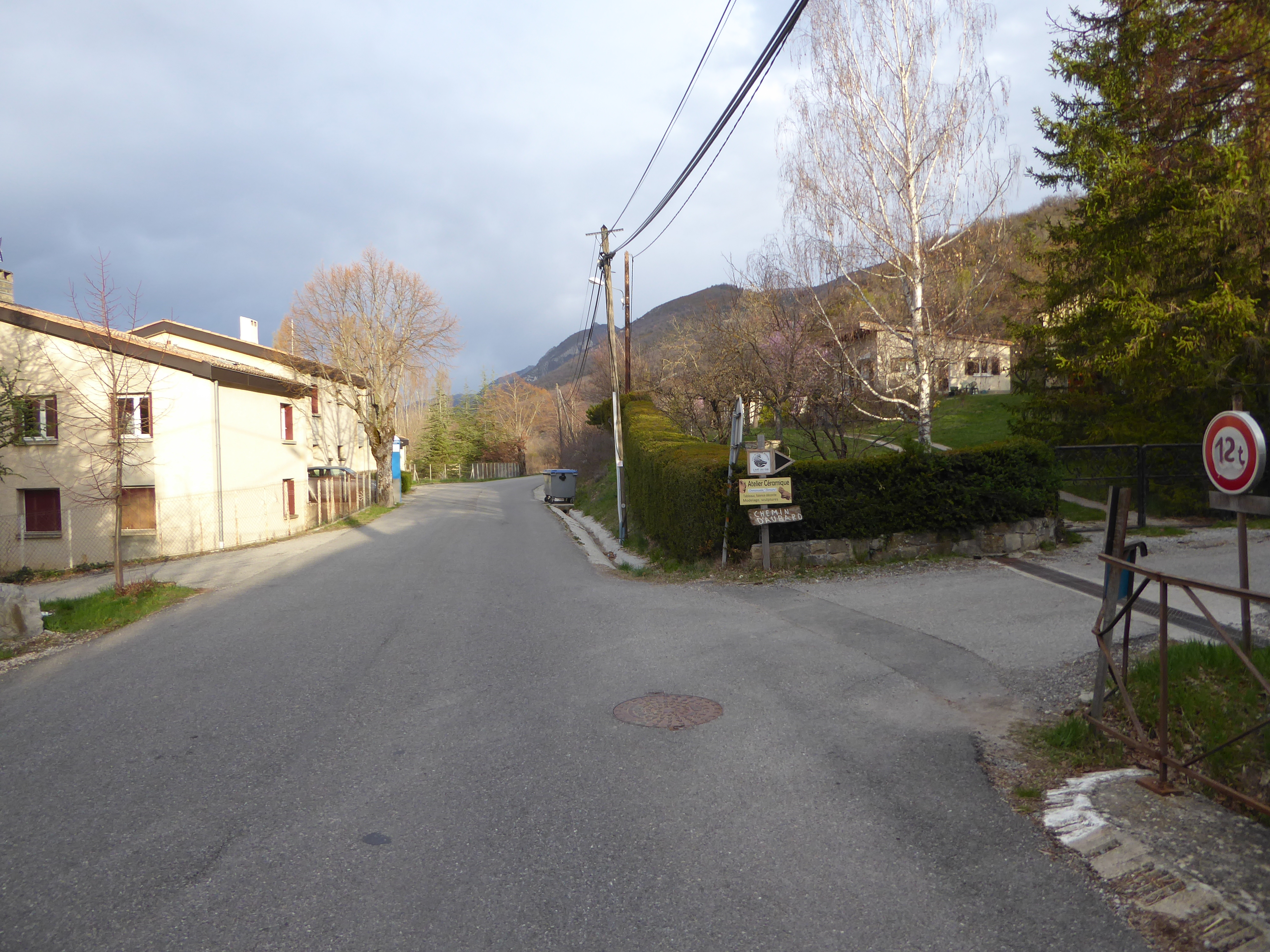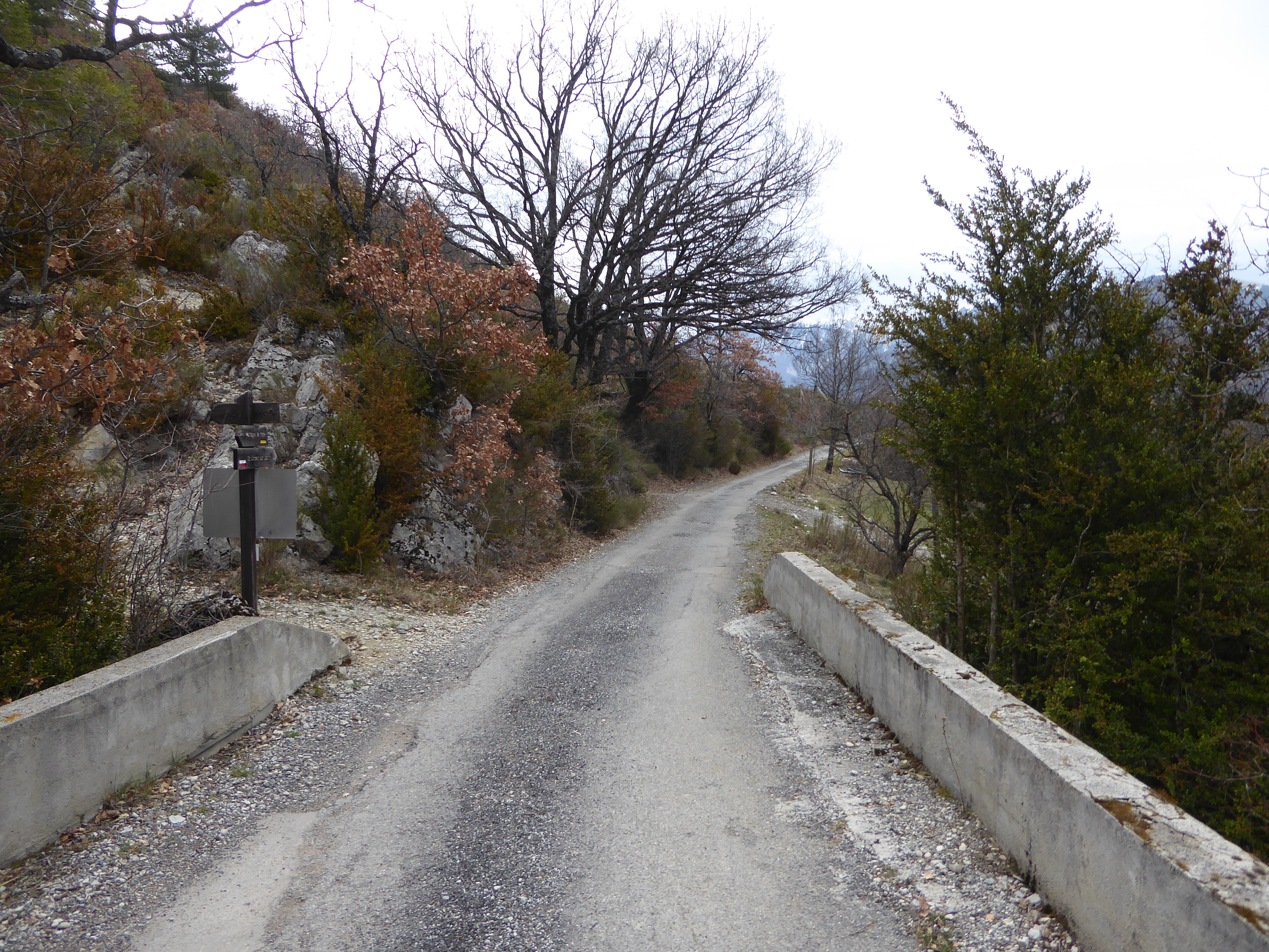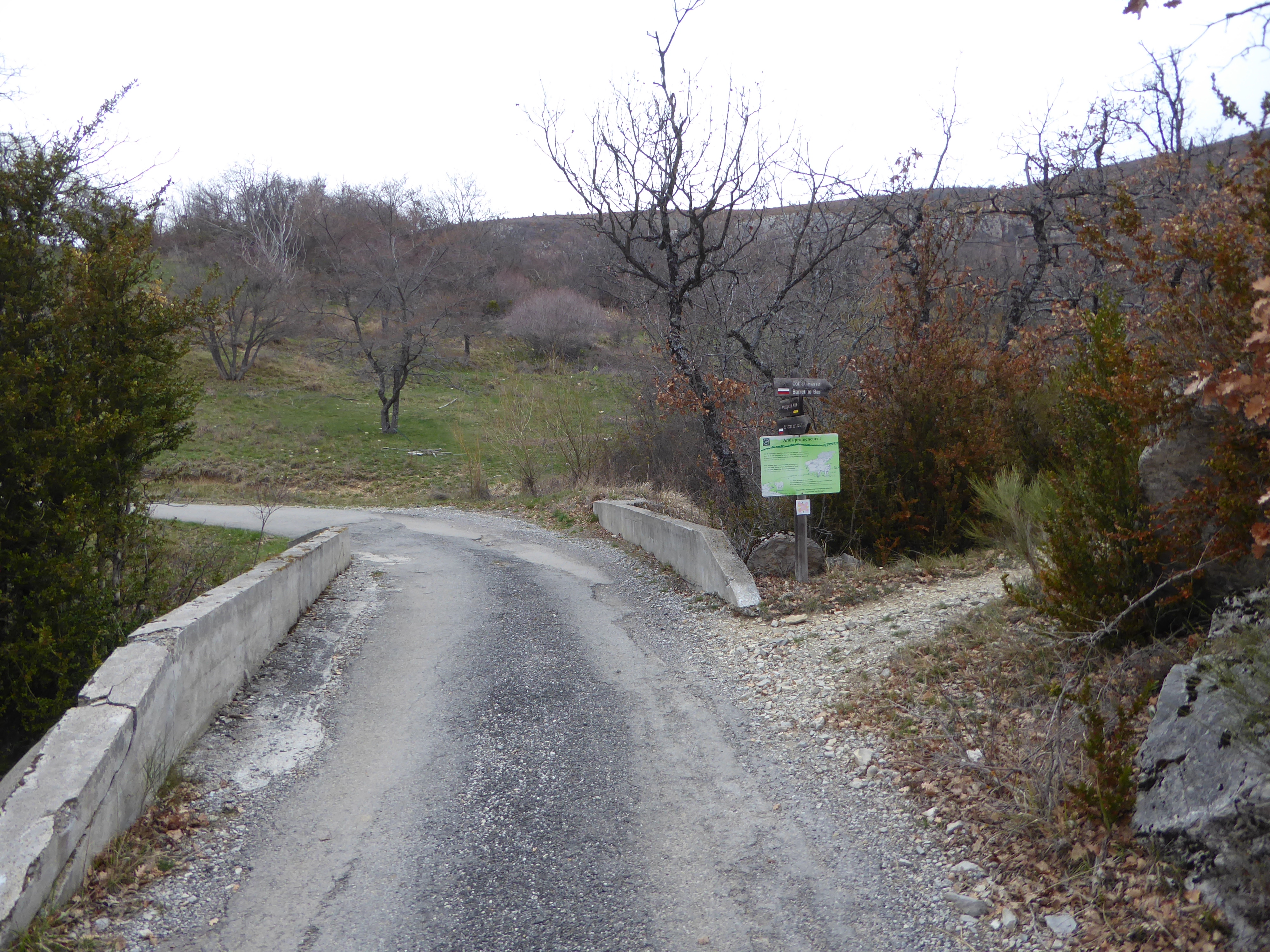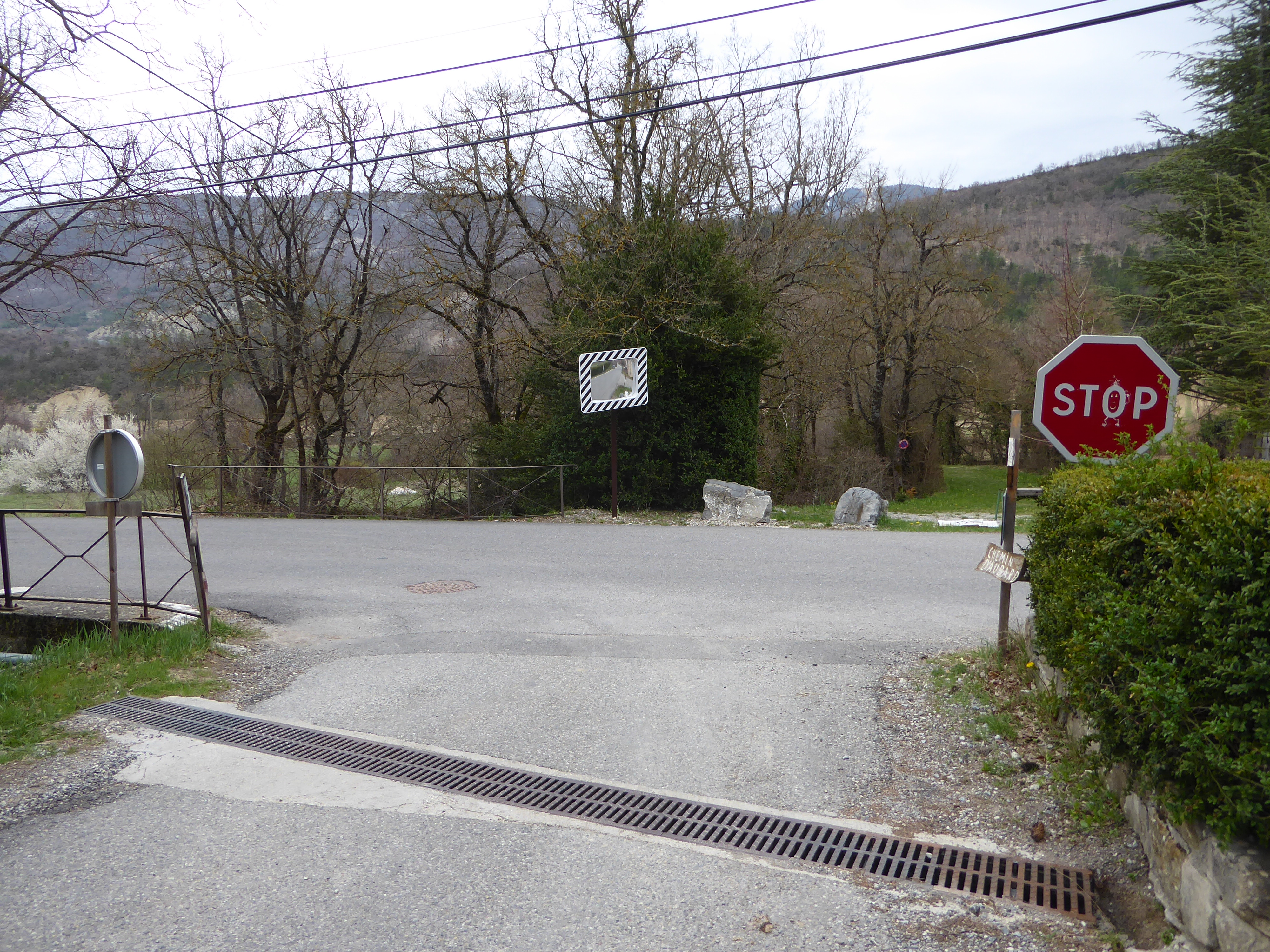 A ce croisement situé au niveau d'un pont, continuer à suivre la route direction Saint-Vincent-sur-Jabron, balisé en rouge et blanc dorénavant
