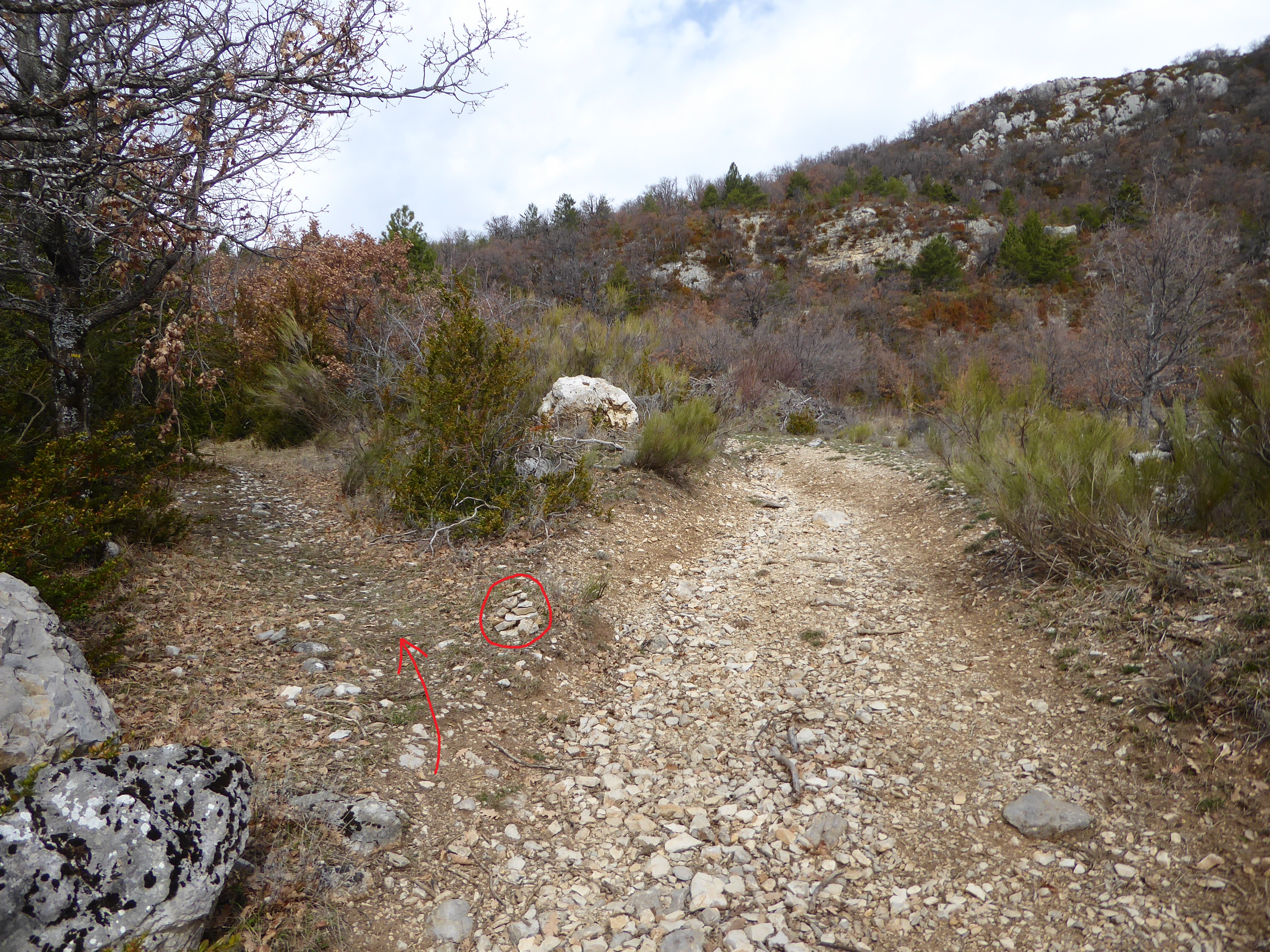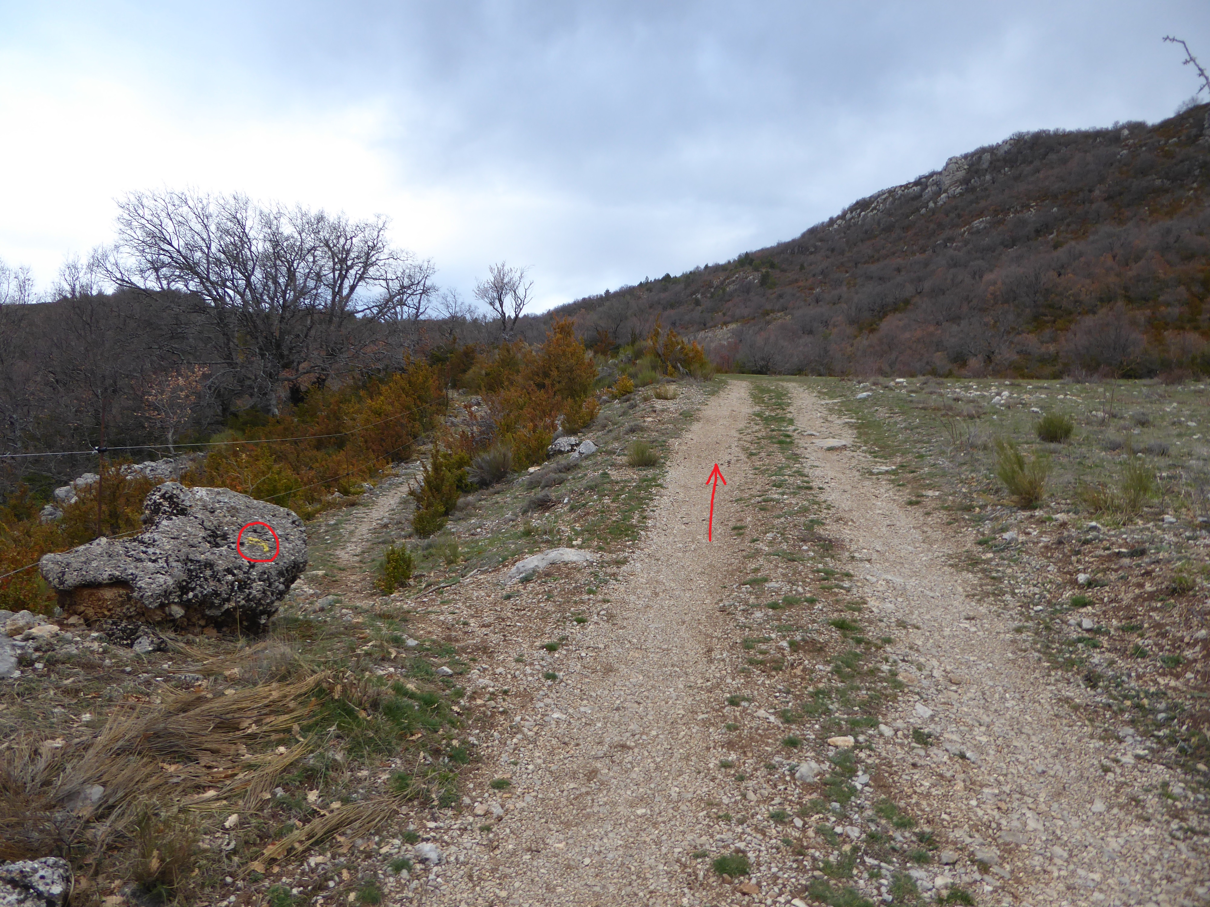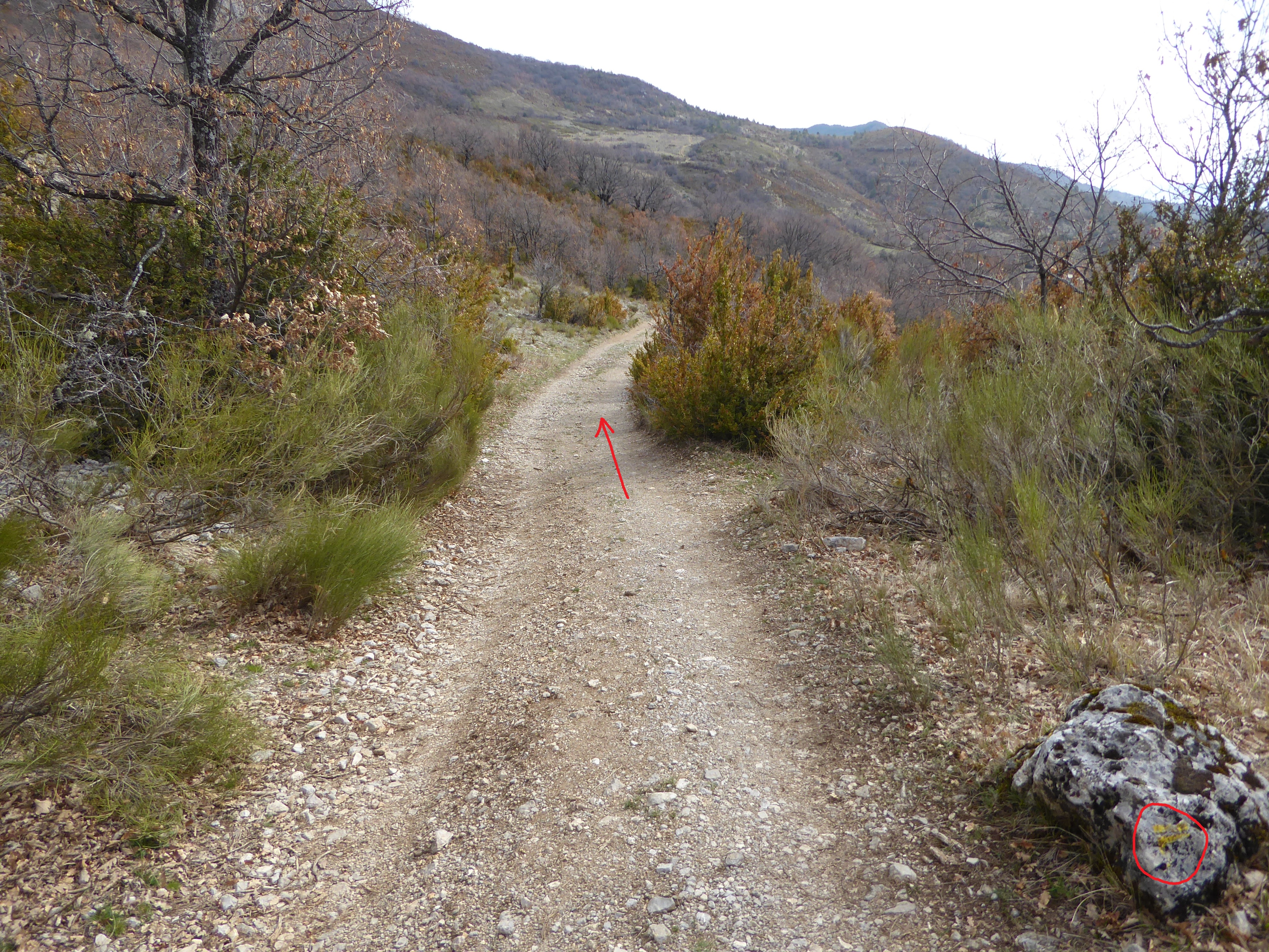 Comme à l'aller, en ce qui concerne le chemin de droite qui suit parallèlement le large chemin de la photo, continuer à suivre ce large chemin partant tout droit direction Saint-Vincent-sur-Jabron, balisé en jaune (ignorer la balise jaune peinte sur le rocher)