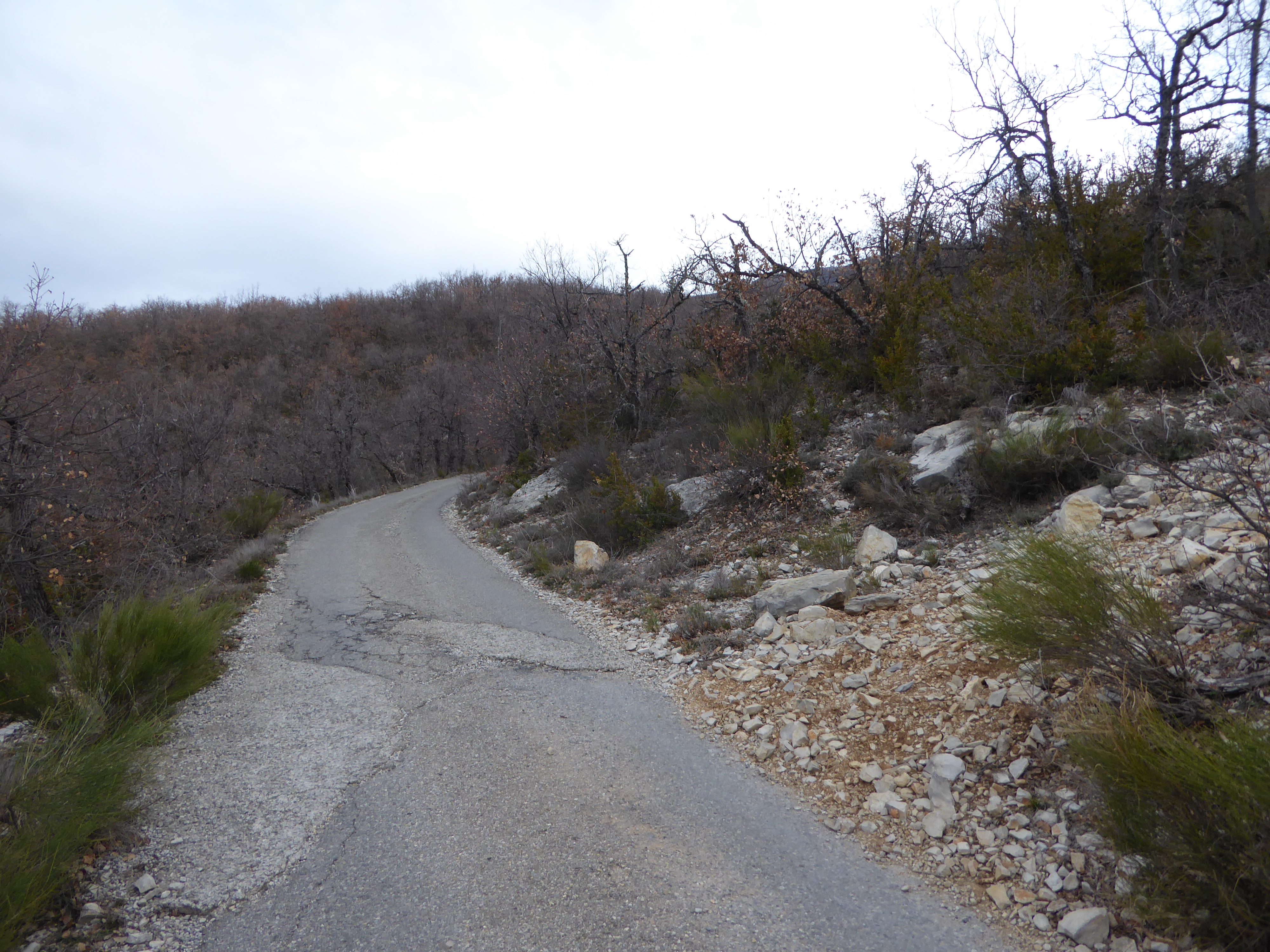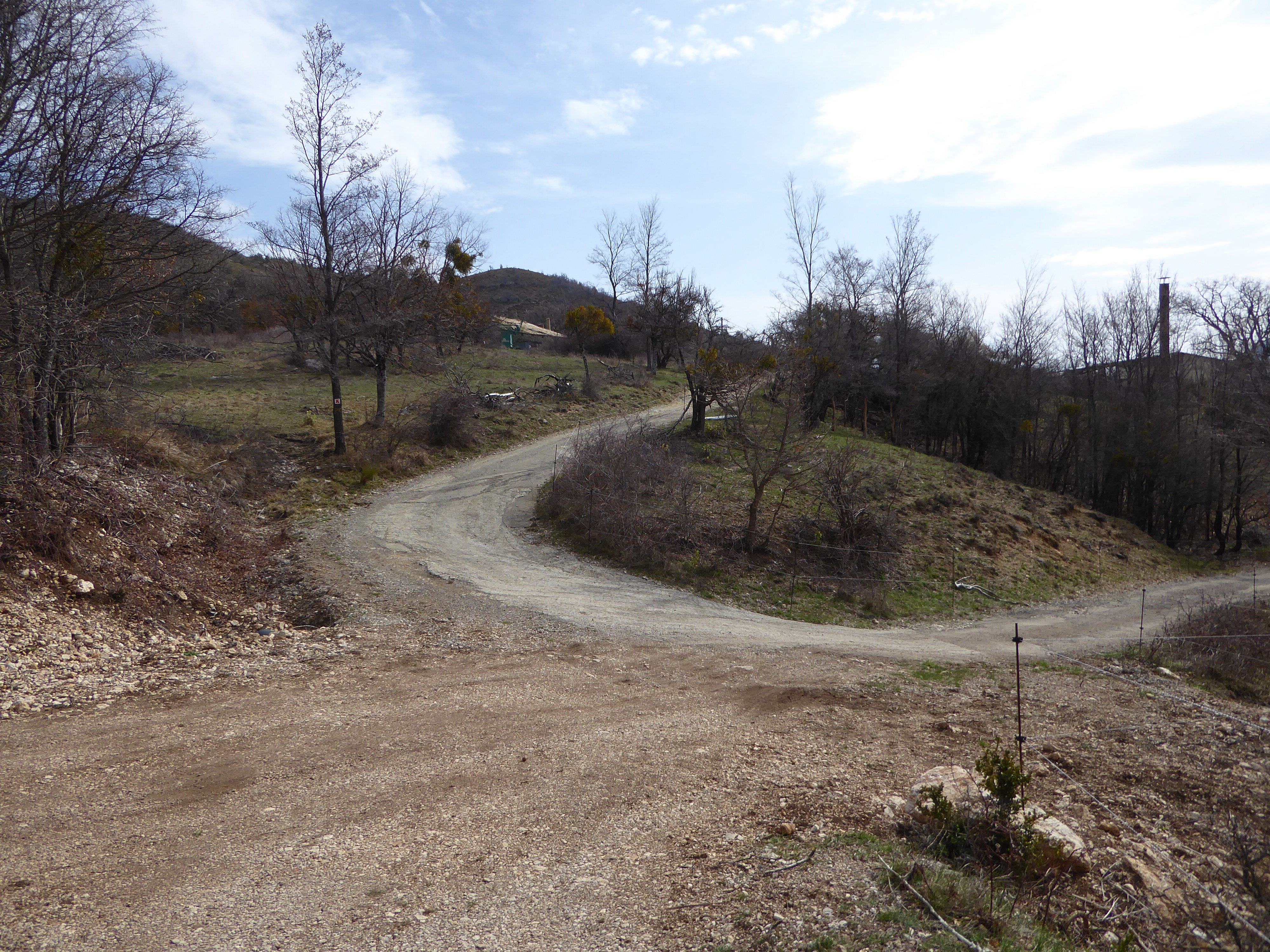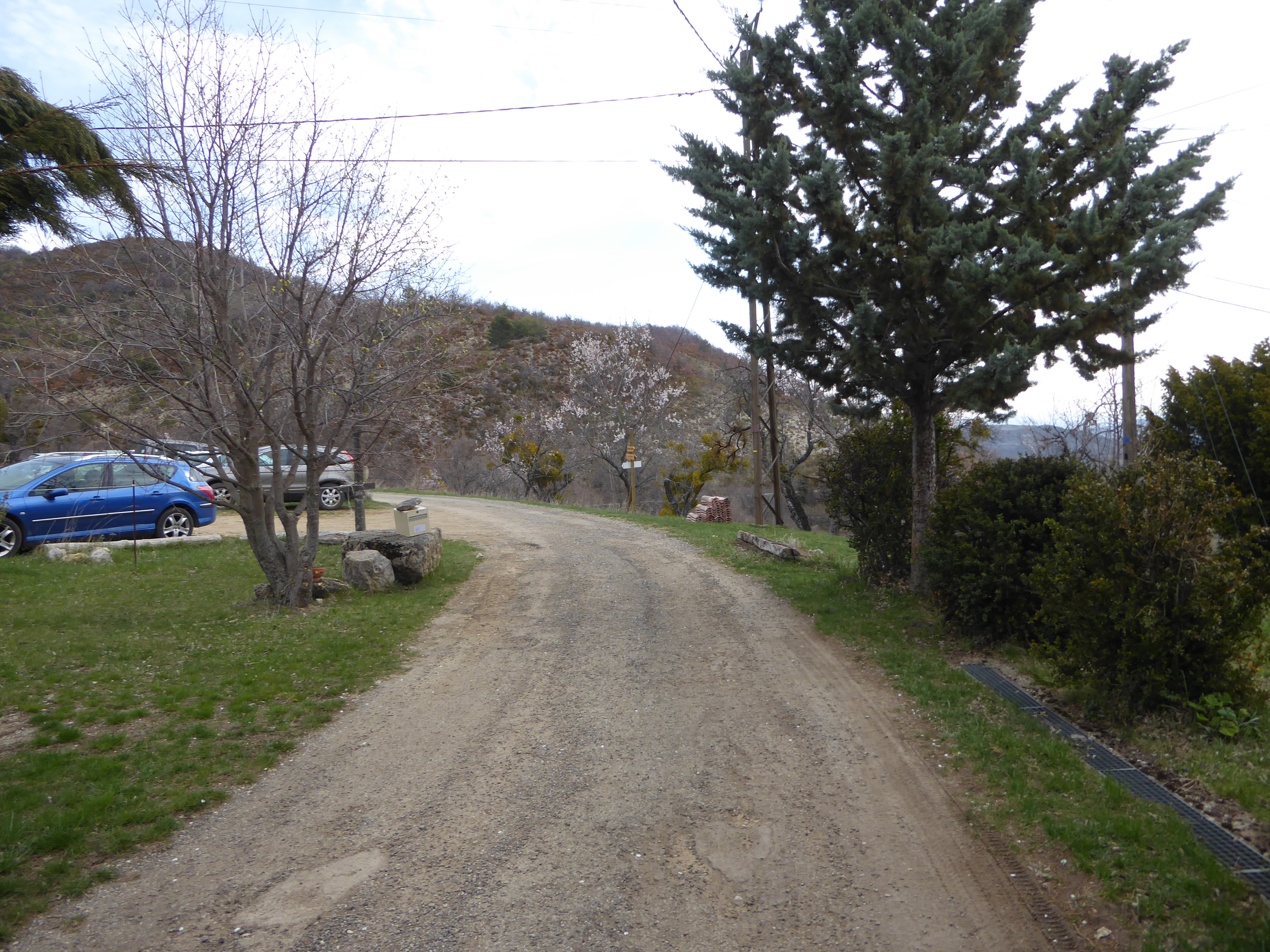 Comme à l'aller, en ce qui concerne le chemin de droite qui suit parallèlement le large chemin de la photo, continuer à suivre ce large chemin partant tout droit direction Saint-Vincent-sur-Jabron, balisé en jaune (ignorer la balise jaune peinte sur le rocher)