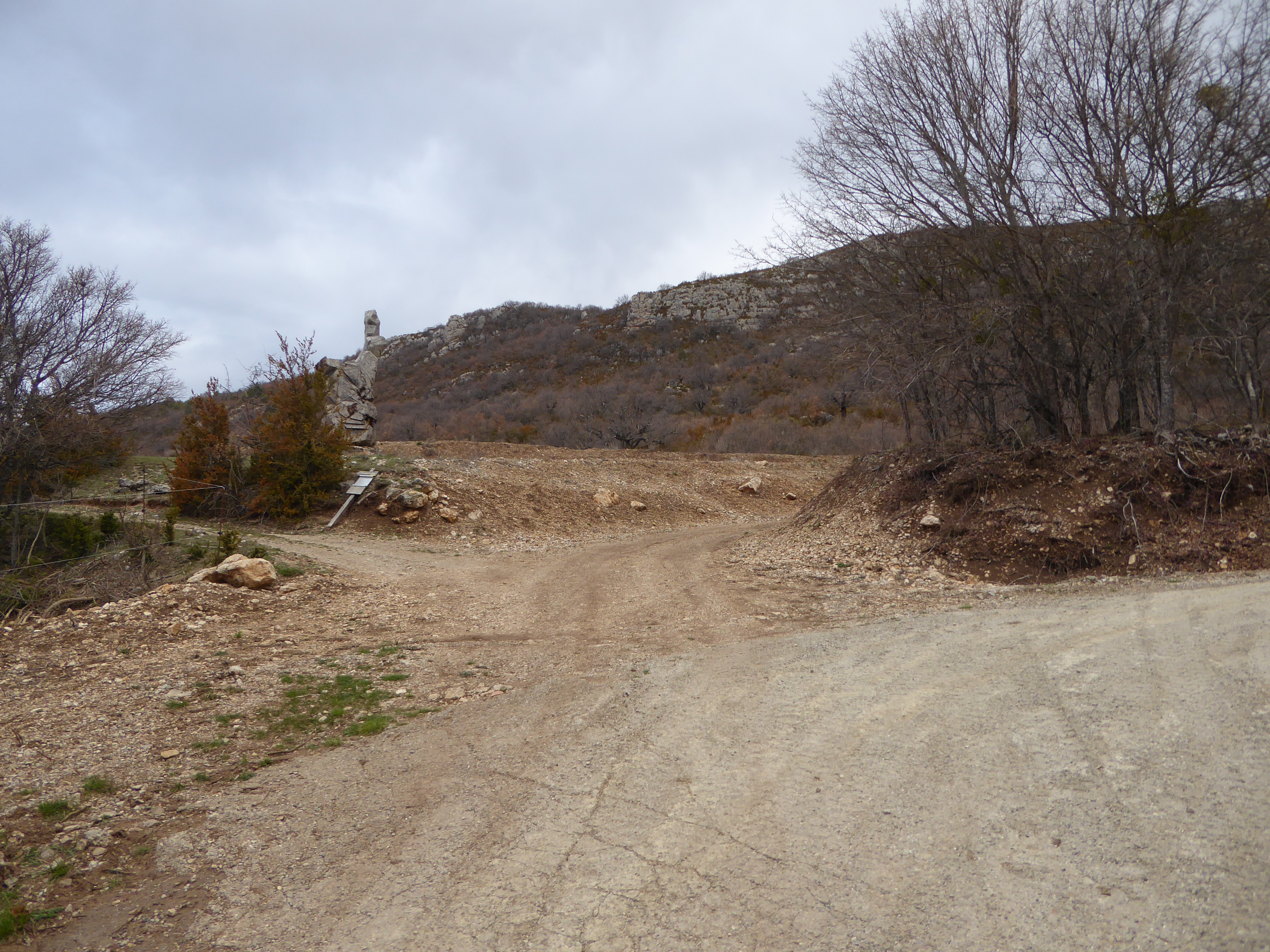 A cette interscetion marquée d'un tronc sculpté, suivre la route goudronnée descendant sur la droite direction Saint-Vincent-sur-Jabron, balisé en jaune