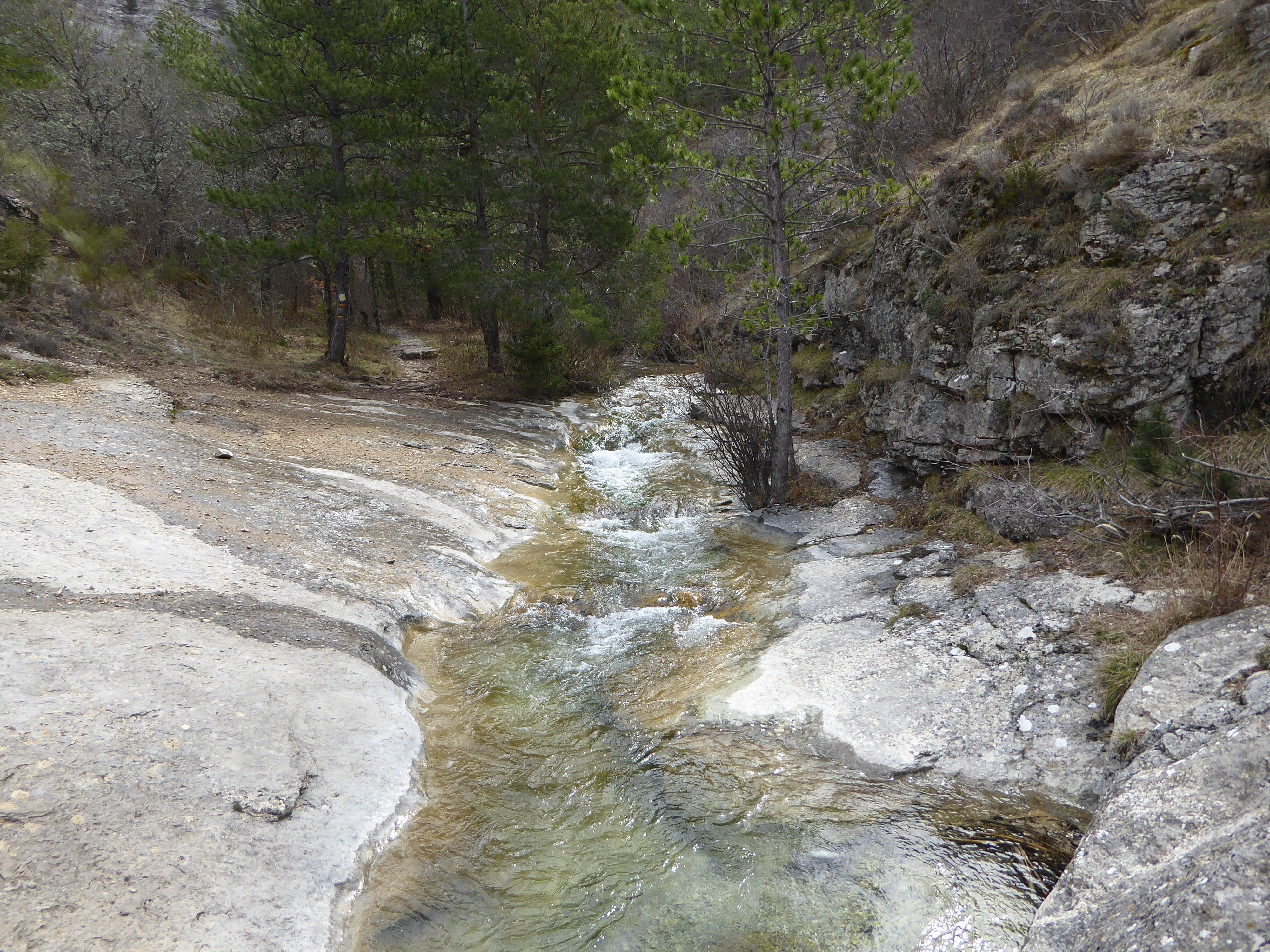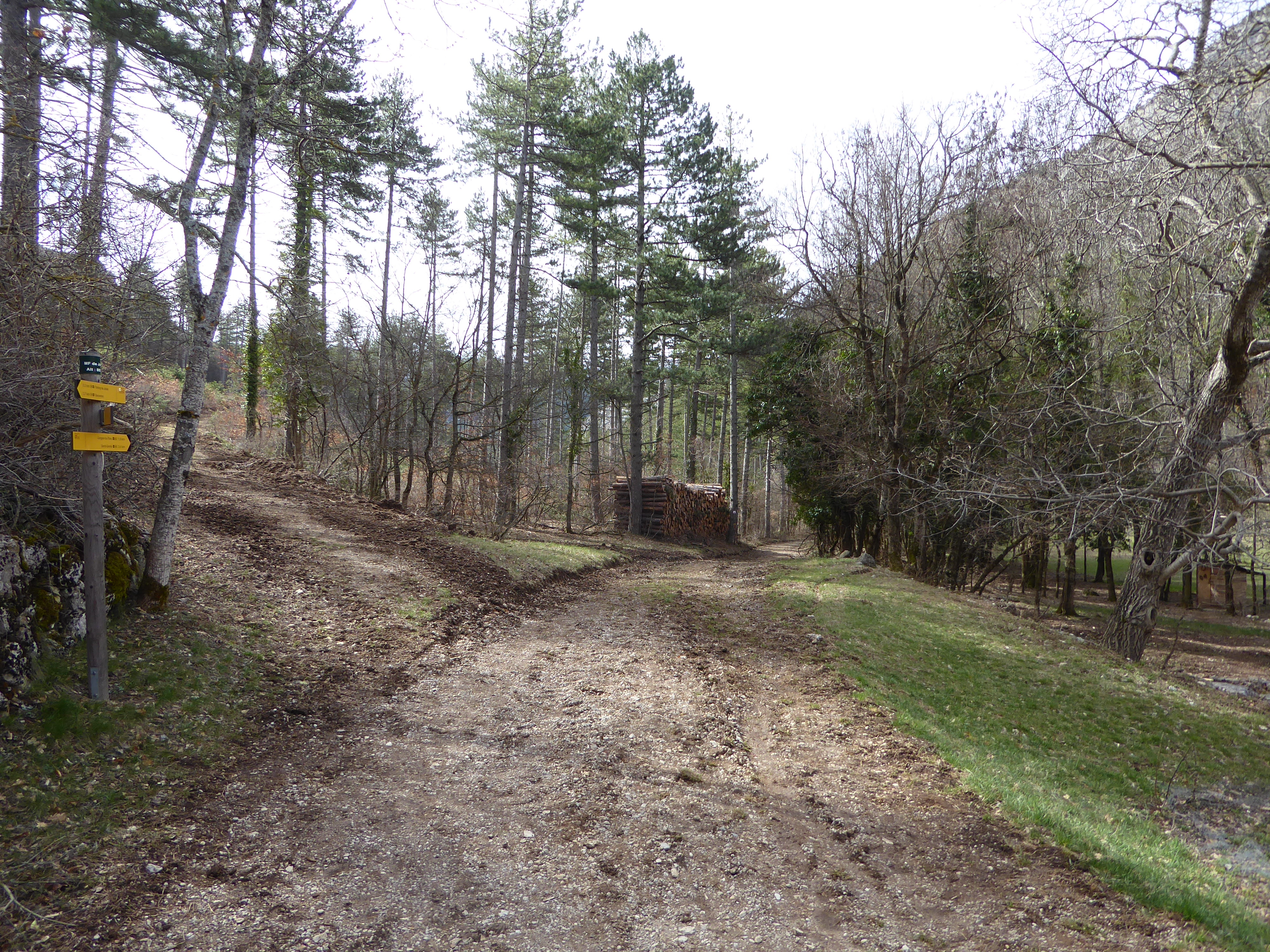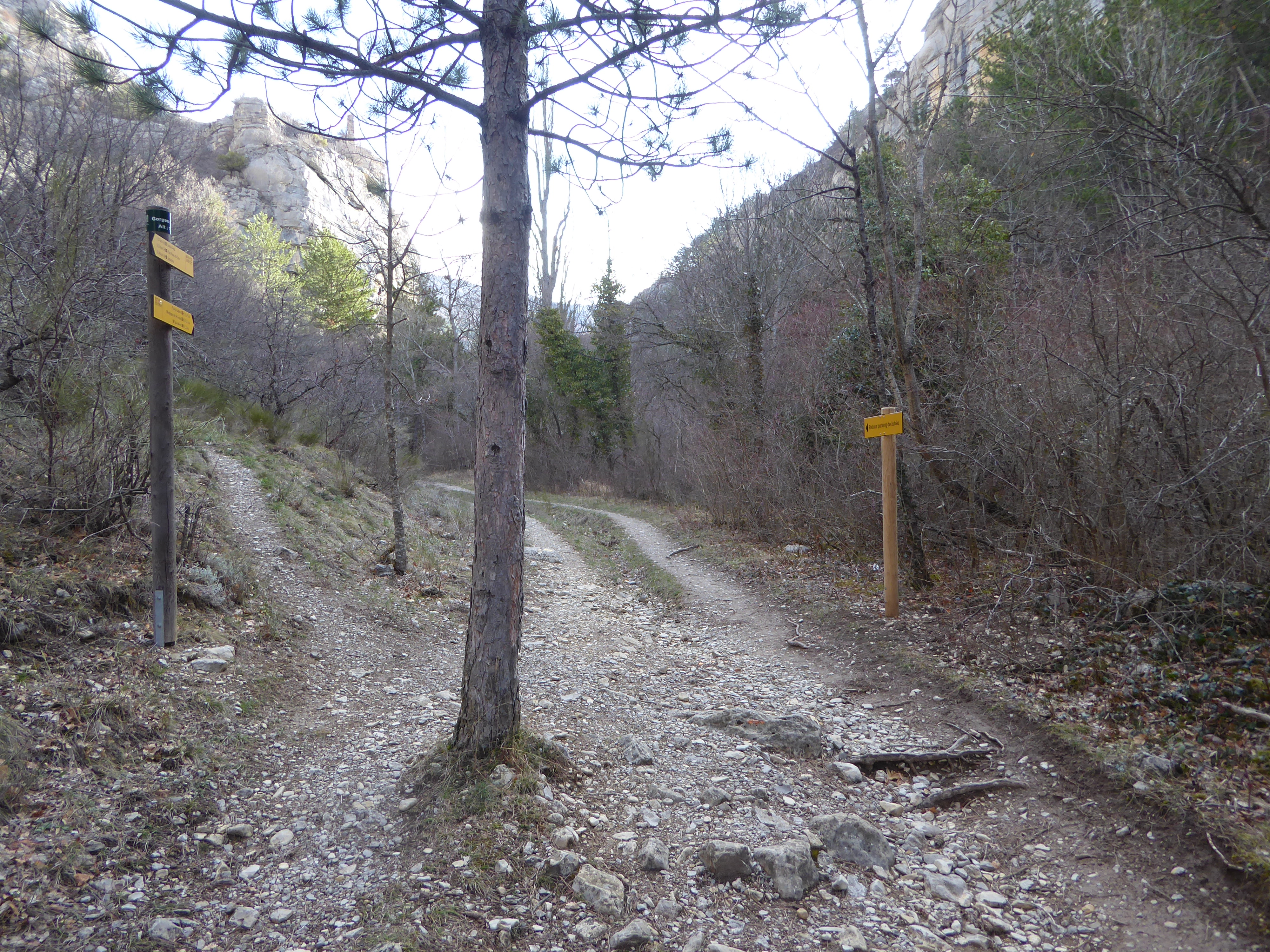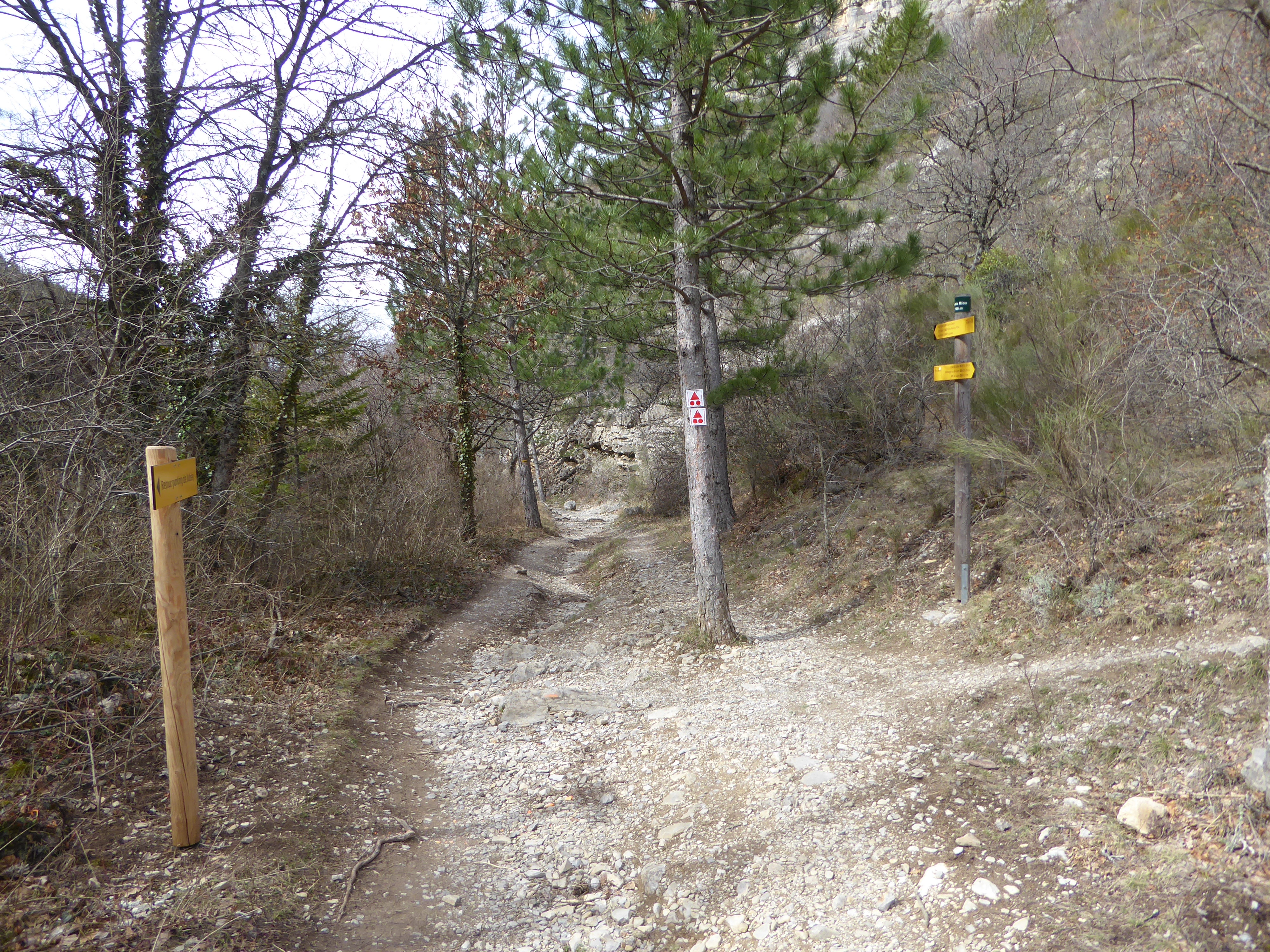 Départ Saint-Genis (710 m) : suivre la route qui part tout droit direction Gorges du Riou, balisé en jaune et en jaune et rouge