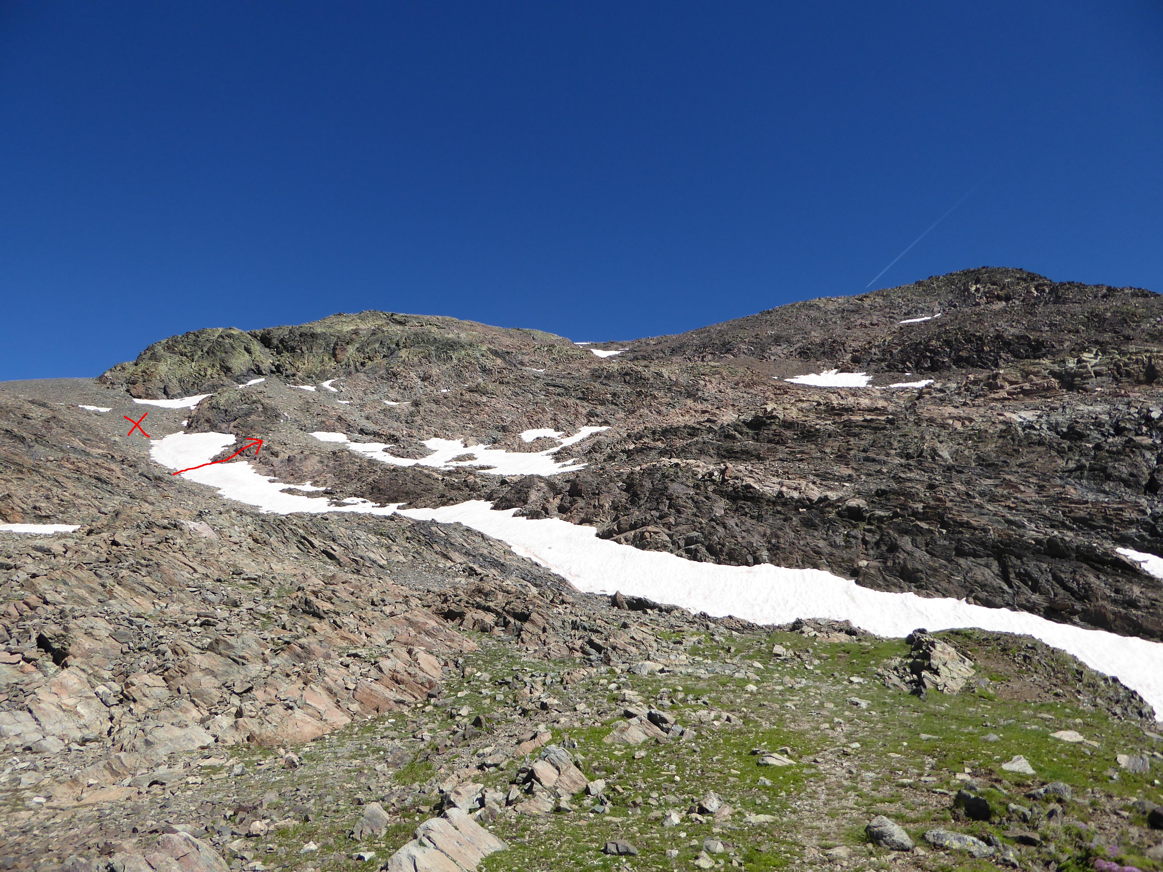 Cabane des Parisiens (2695 m) : continuer sur la gauche (cairn) pour amorcer la montée direction Vieux Chaillol (montée cairnée)