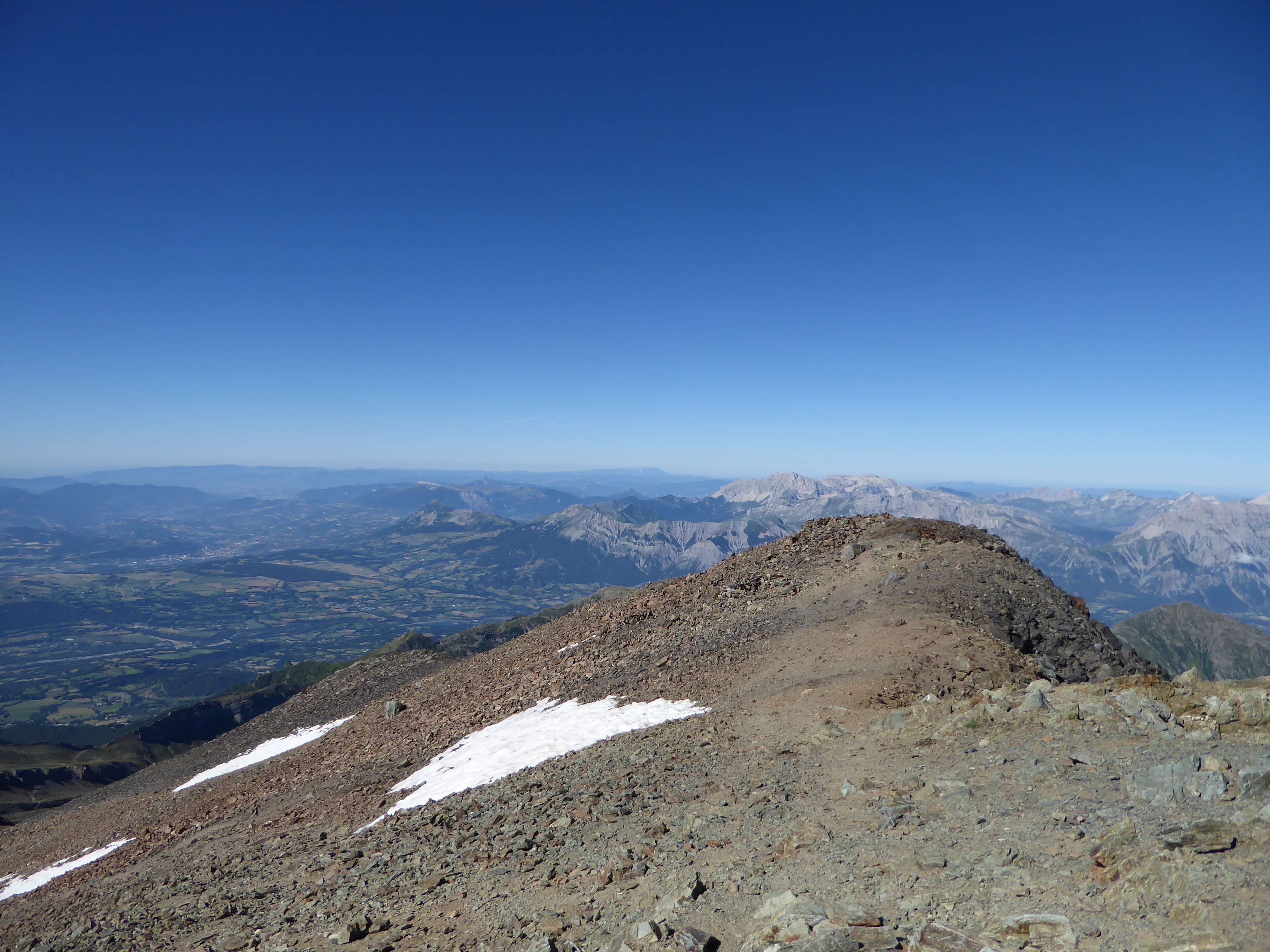 Arrivée au sommet du Vieux Chaillol (3163 m) : vue imprenable sur le Massif des Écrins, sur l'Ubaye, le Queyras, les Préalpes de Digne, la Montagne de Lure, le Ventoux, ... très étendu !!!