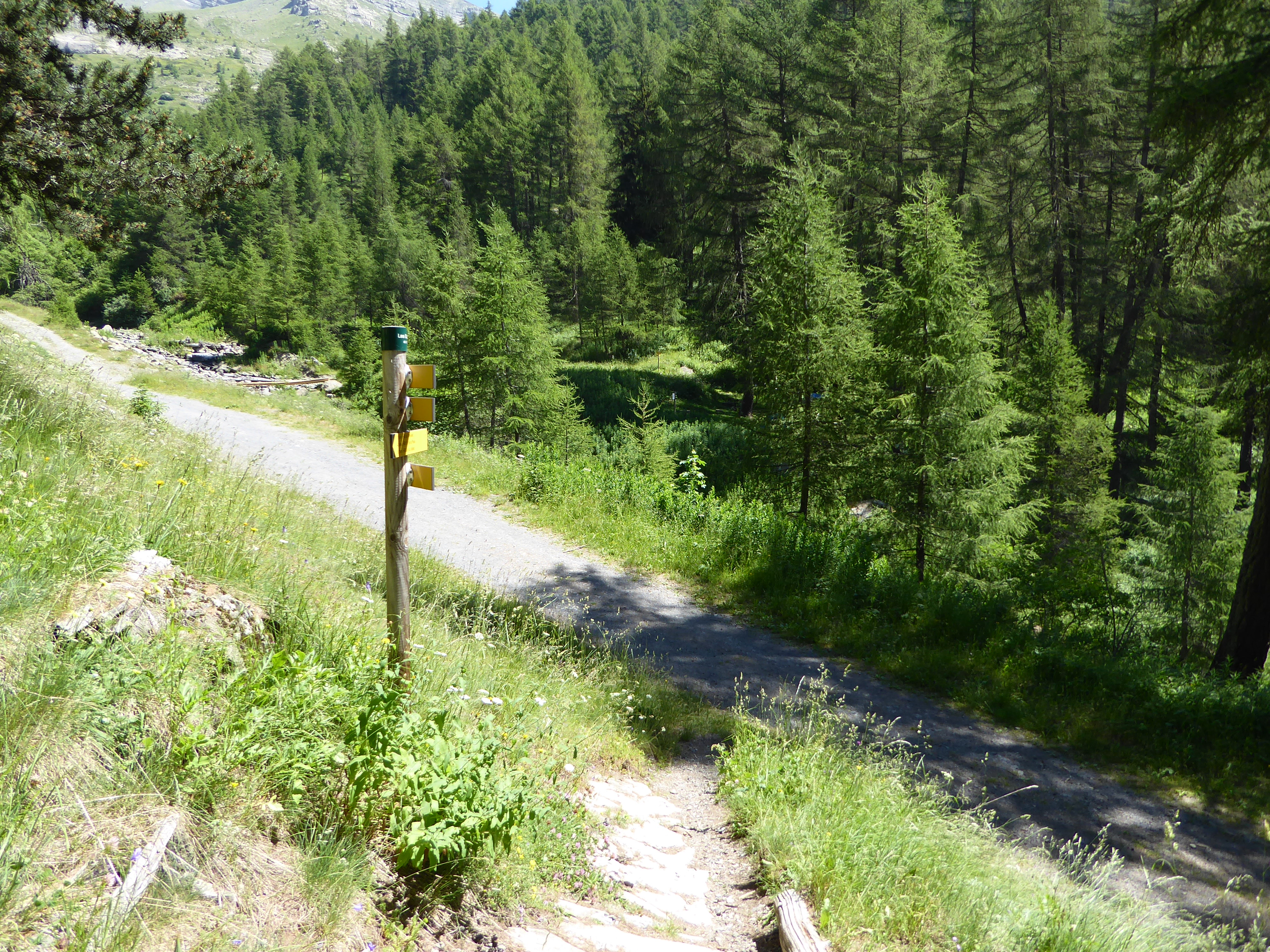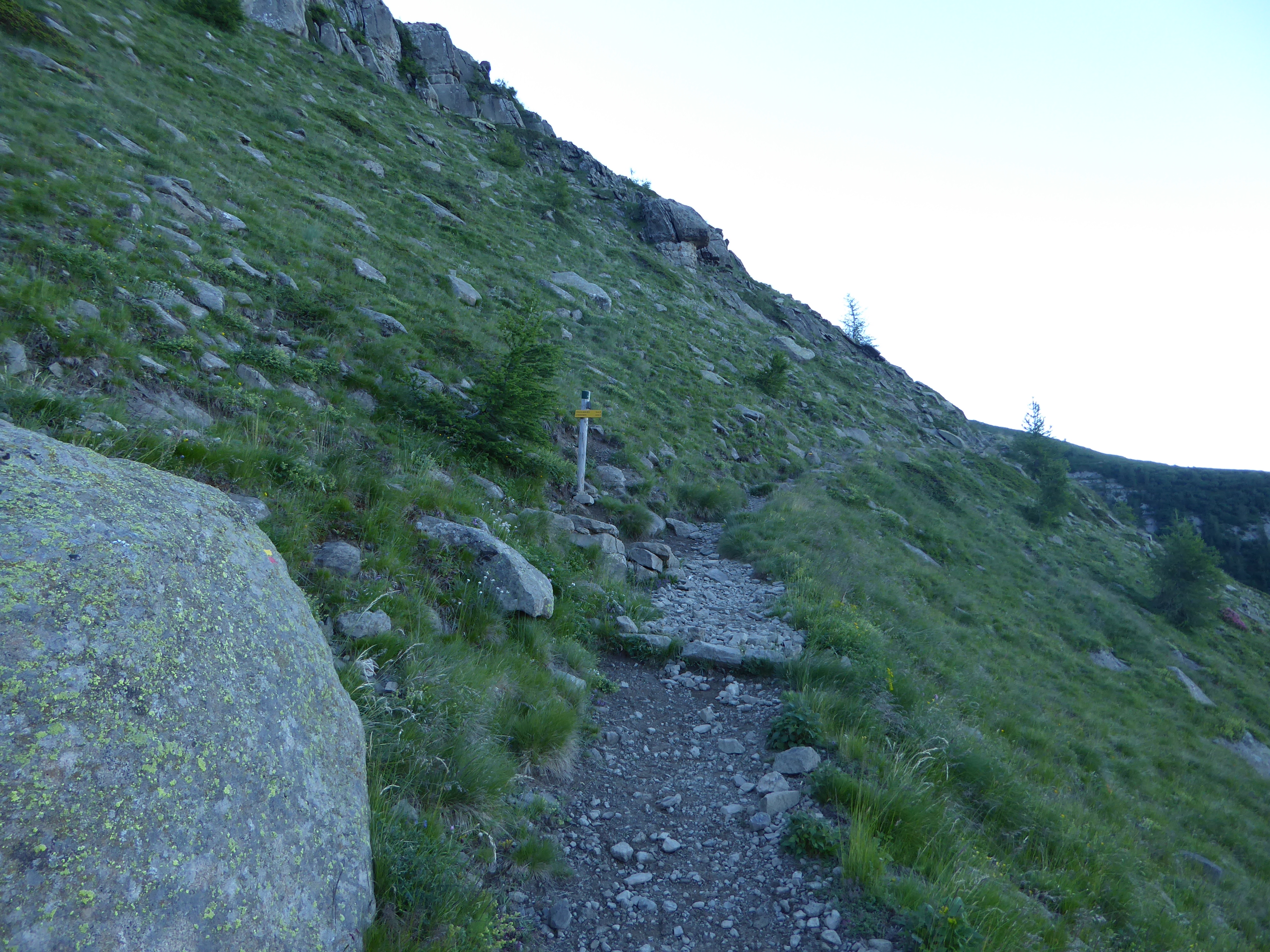 Les Cabanes (1750 m) : tourner à gauche direction Col de la Pisse (le chemin qui part tout droit mène aussi à ce même col mais la distance est rallongée de 700 mètres, à vous de voir !), balisé en jaune dorénavant