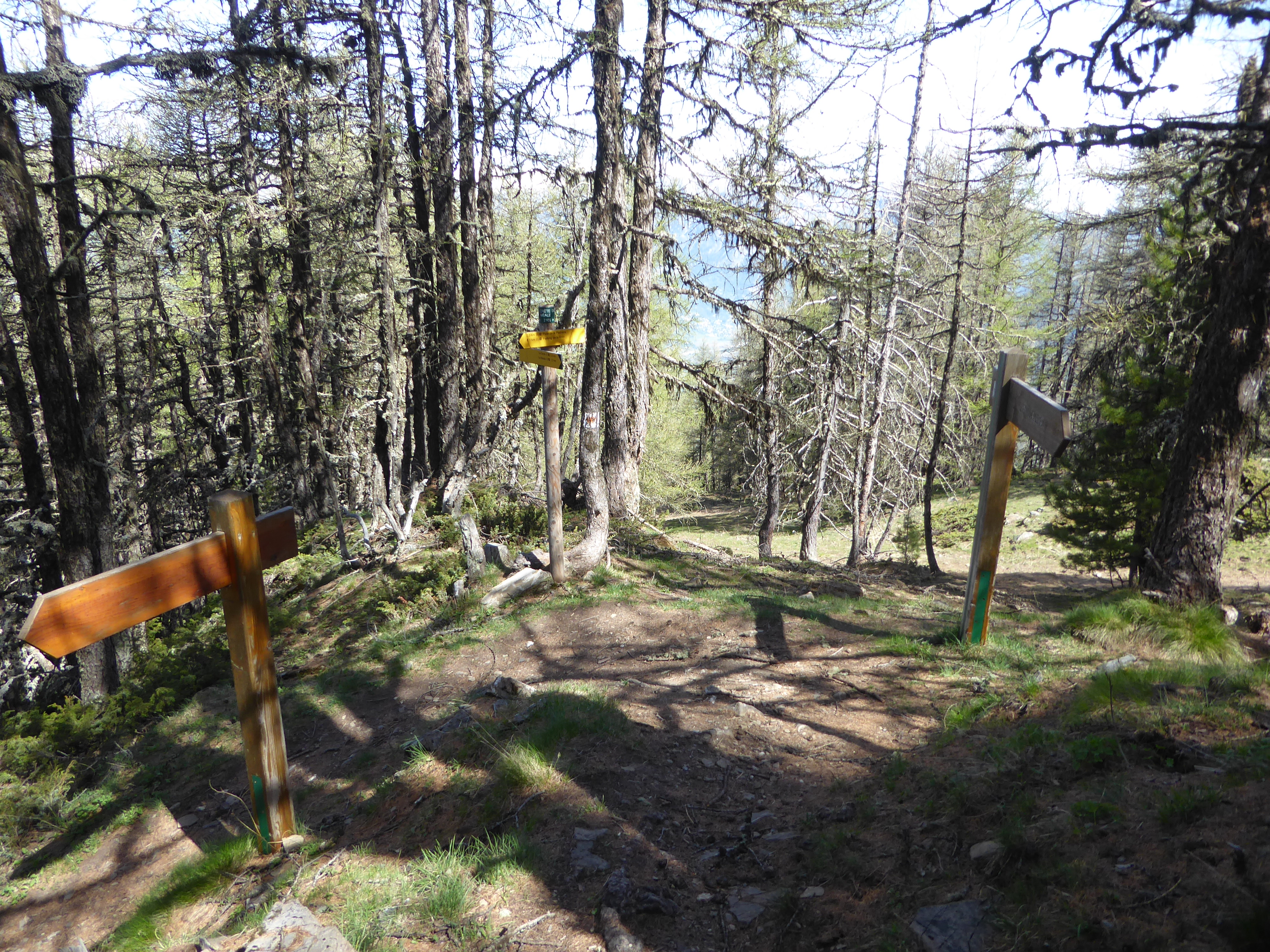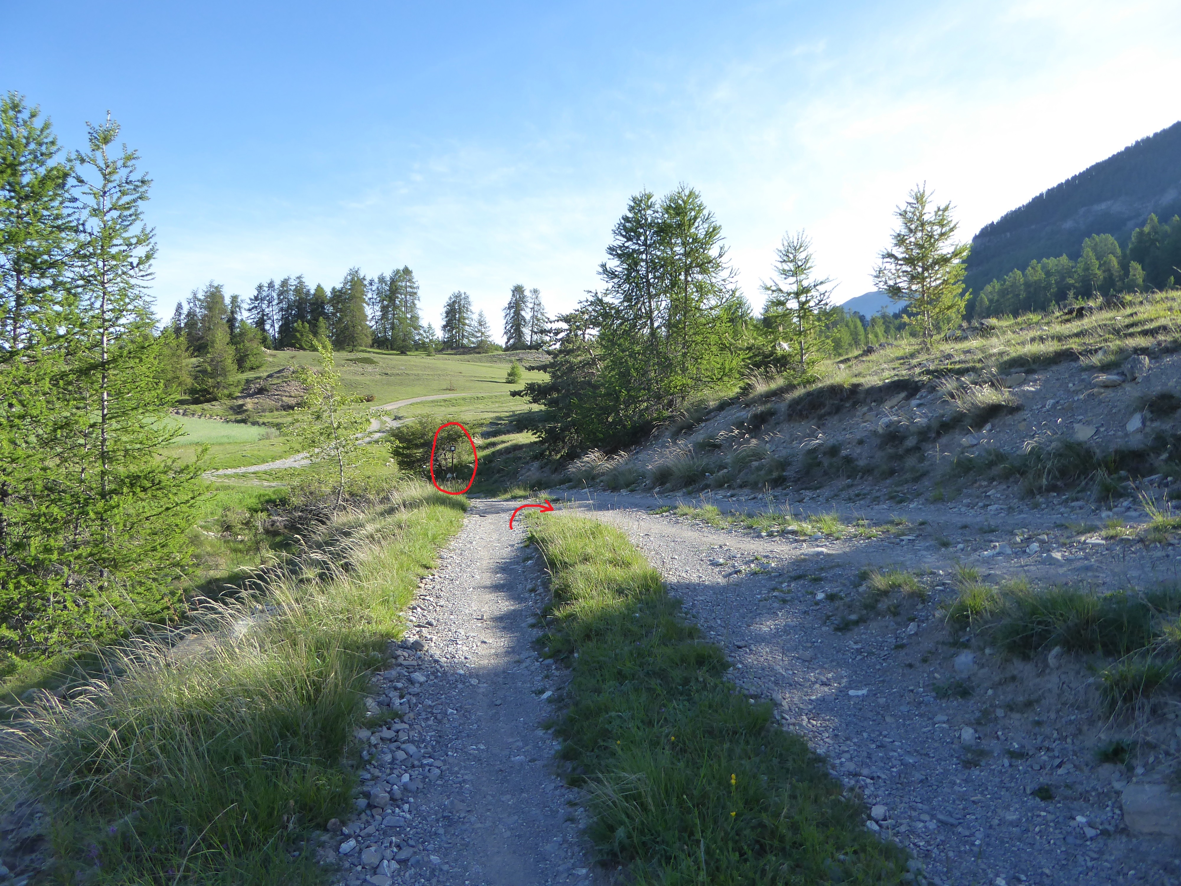 A ce croisement marqué d'un panneau blanc, suivre la piste partant à contre-sens direction le Méale, balisé en jaune et rouge dorénavant