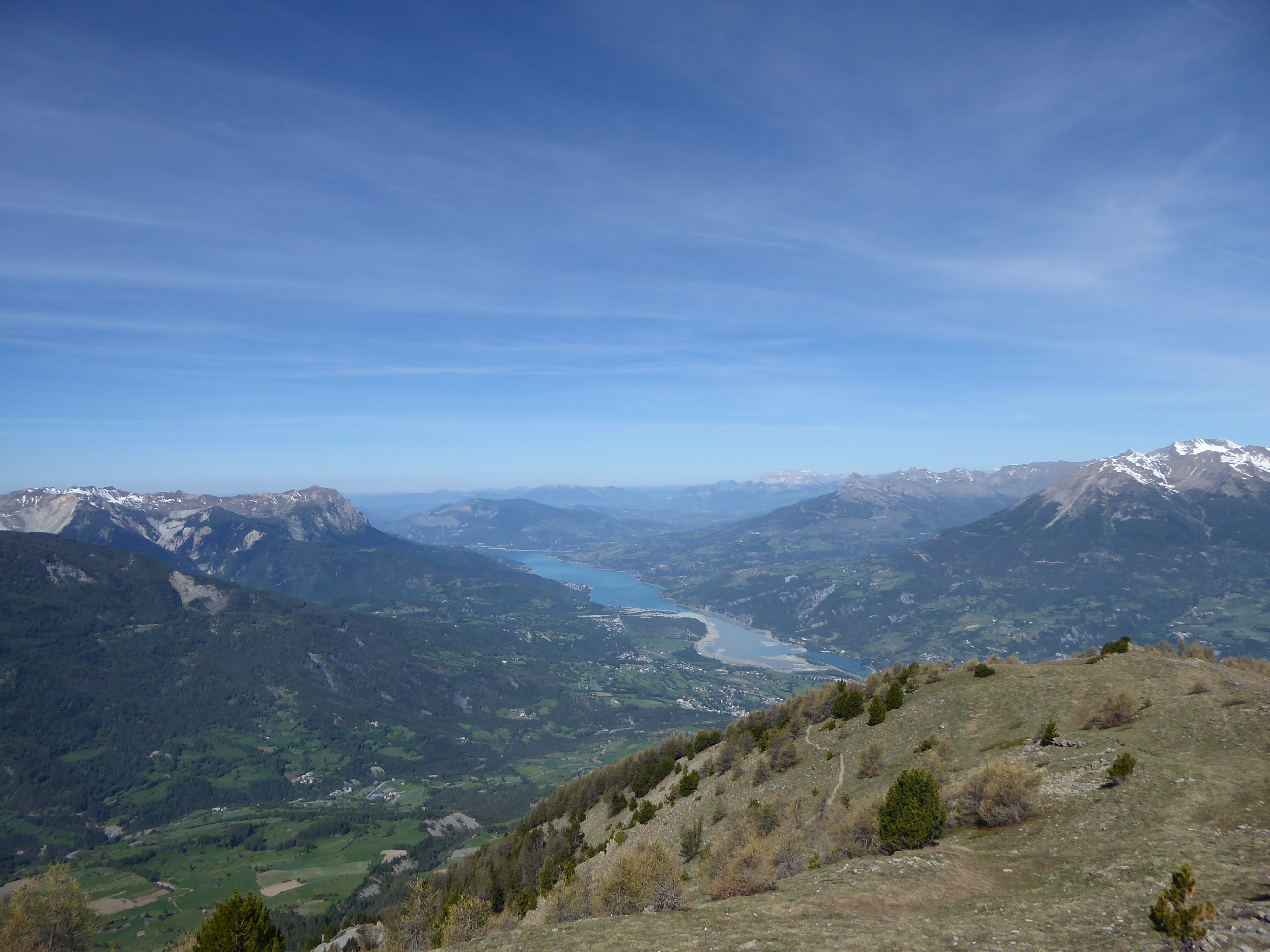 Arrivée au sommet du Méale (2426 m) : vue sur le Lac de Serre-Ponçon, les Aiguilles de Chabrières, le Mont Guillaume, les Écrins, le Queyras, le Pic Saint-André, le Mont Tailland, les sommets de l'Ubaye, le Pic de Morgon, ...