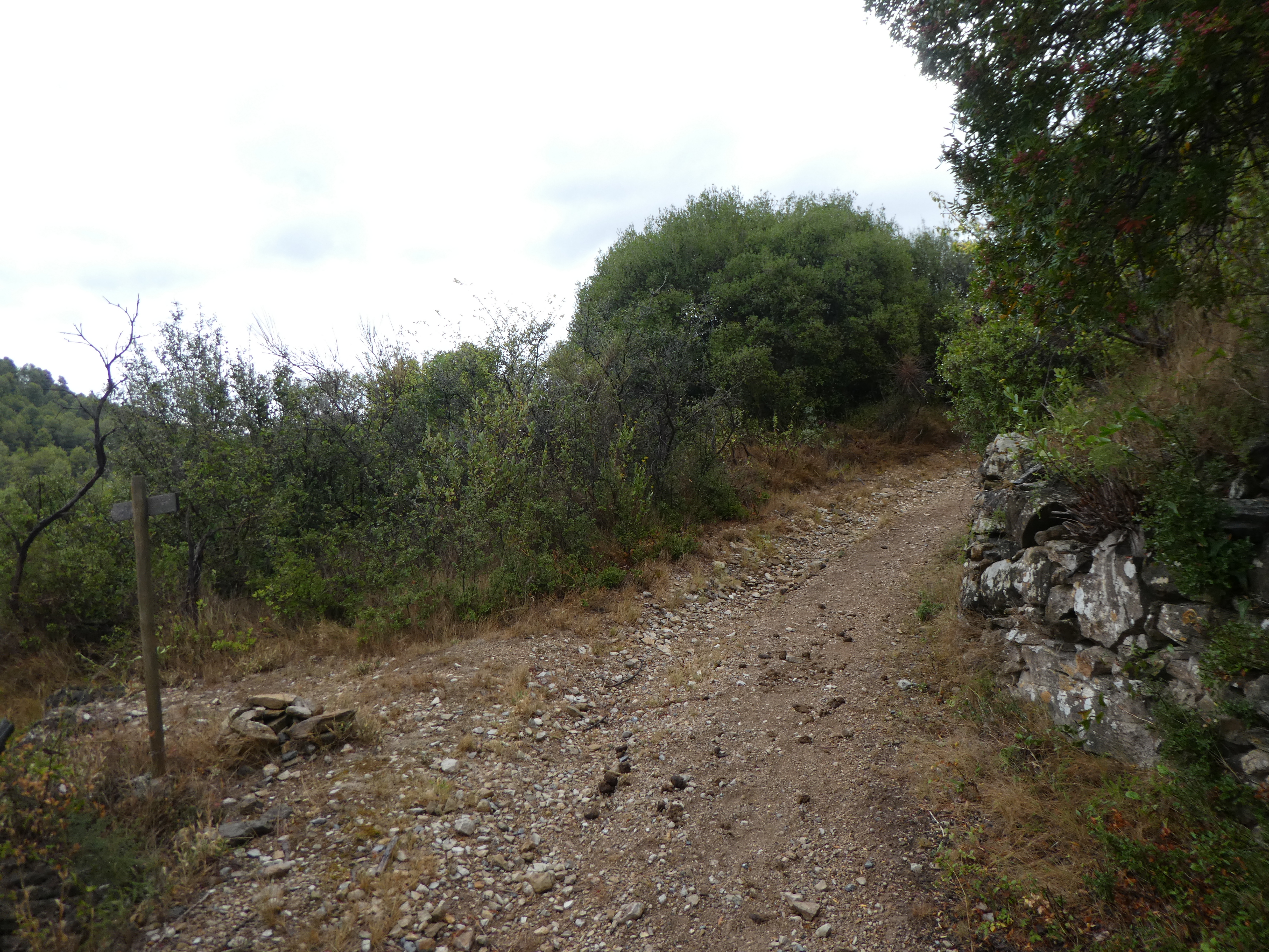 A ce croisement avec le GR marqué par la présence du panneau directionnel "Capitelle" (25 mètres après avoir quitté la capitelle), suivre ce dernier tout droit direction Argeliers, balisé en rouge et blanc dorénavant