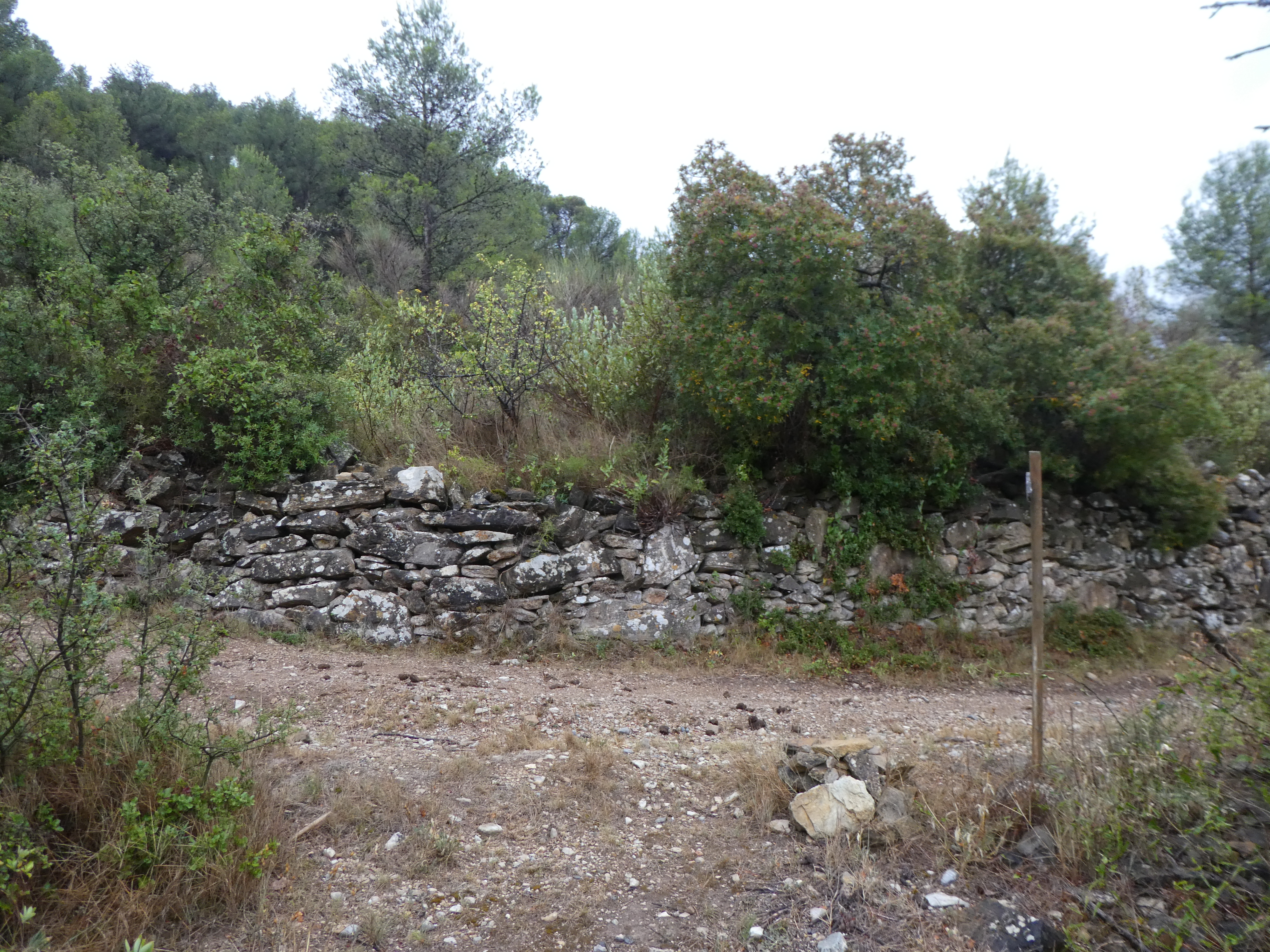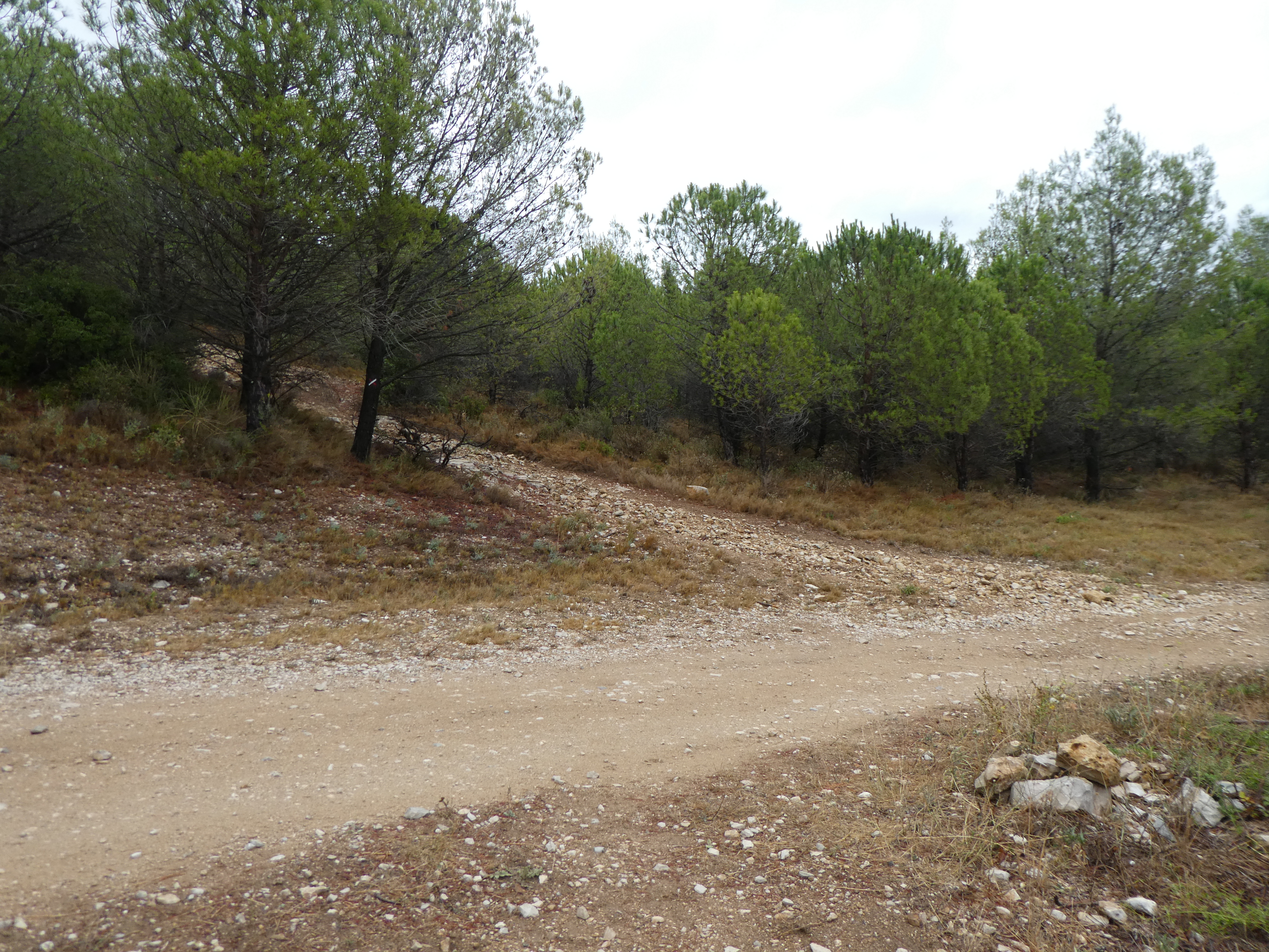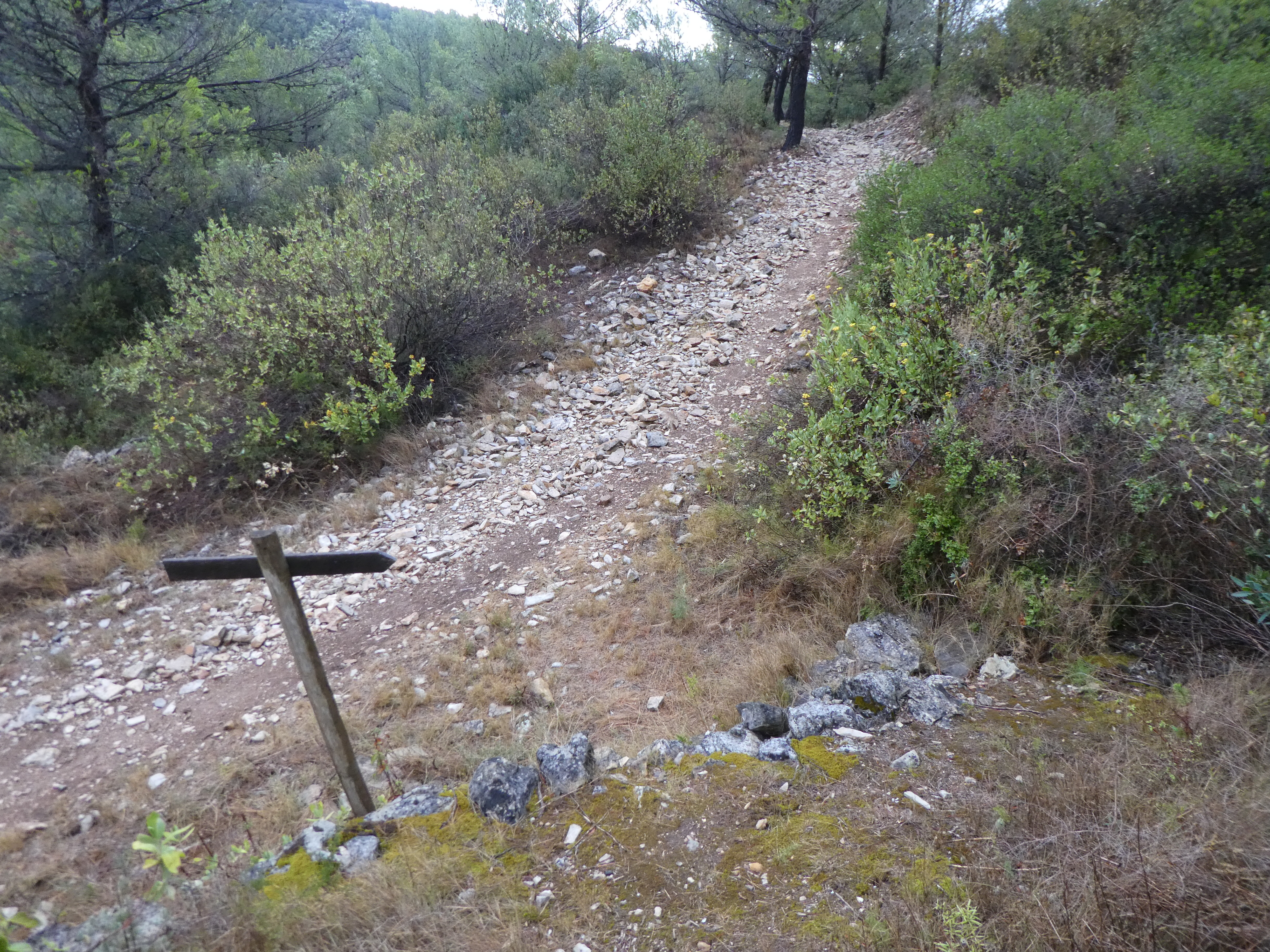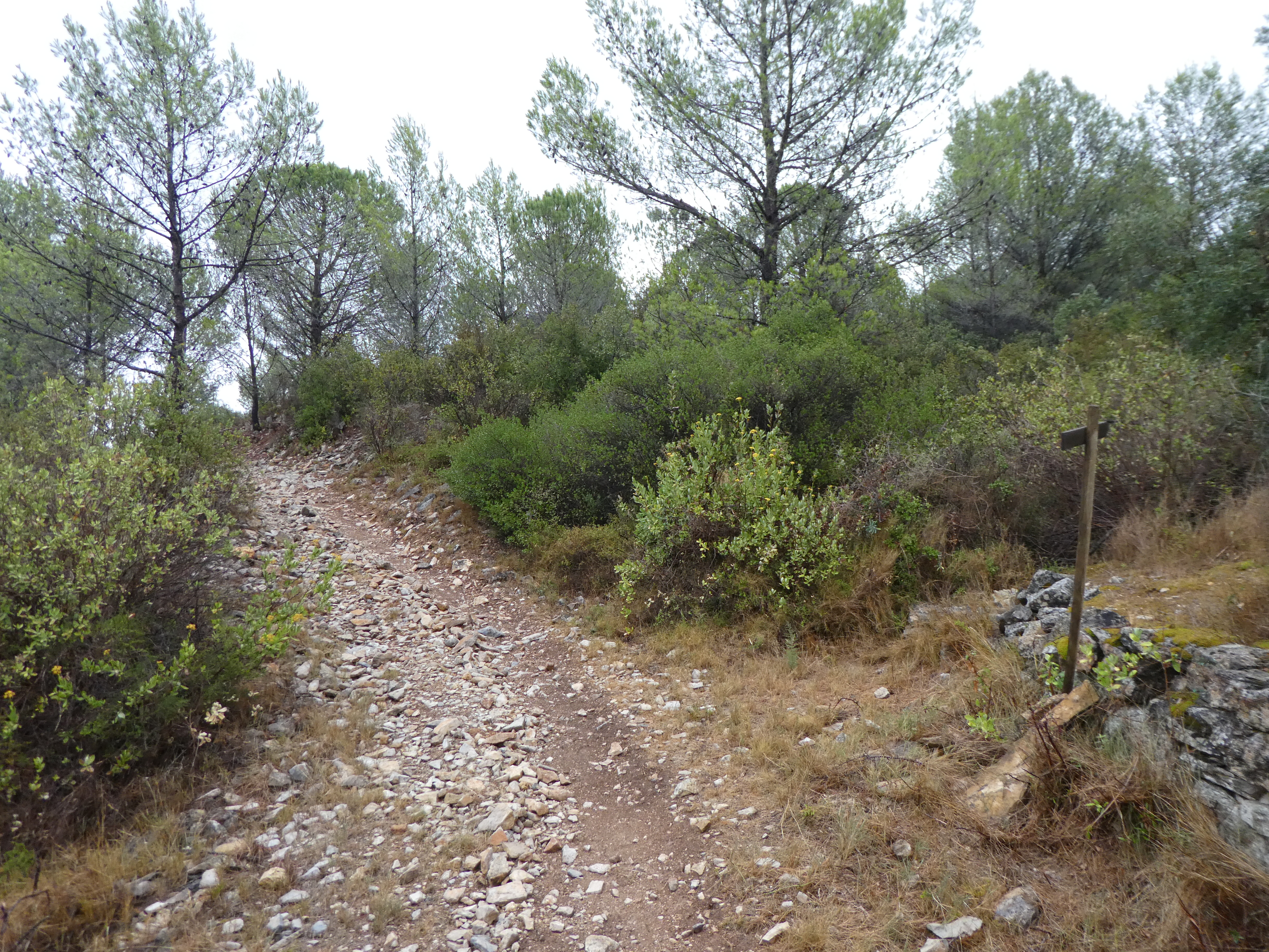 A ce croisement avec le GR marqué par la présence du panneau directionnel "Capitelle" (25 mètres après avoir quitté la capitelle), suivre ce dernier sur la gauche direction Argeliers, balisé en rouge et blanc dorénavant
