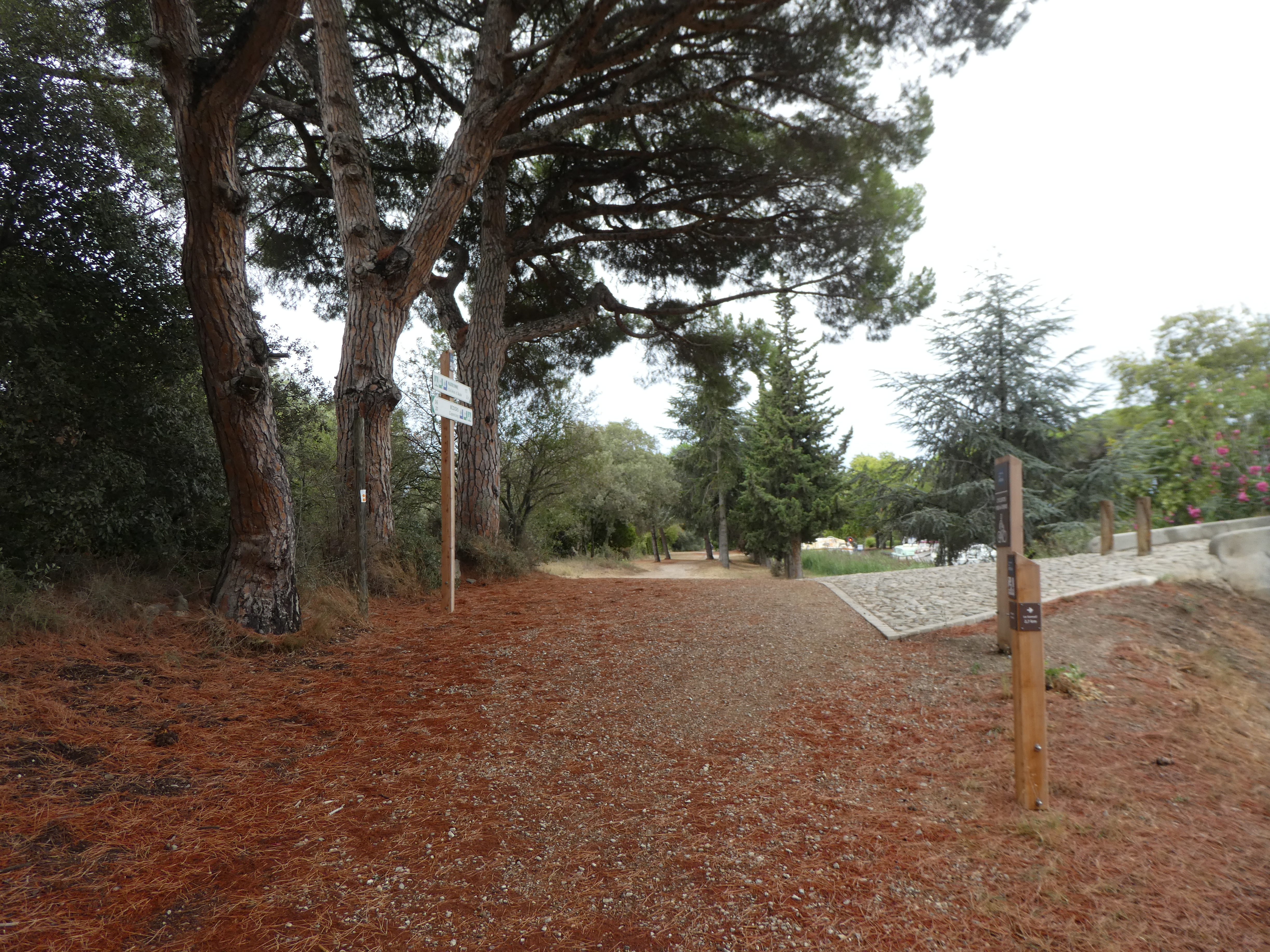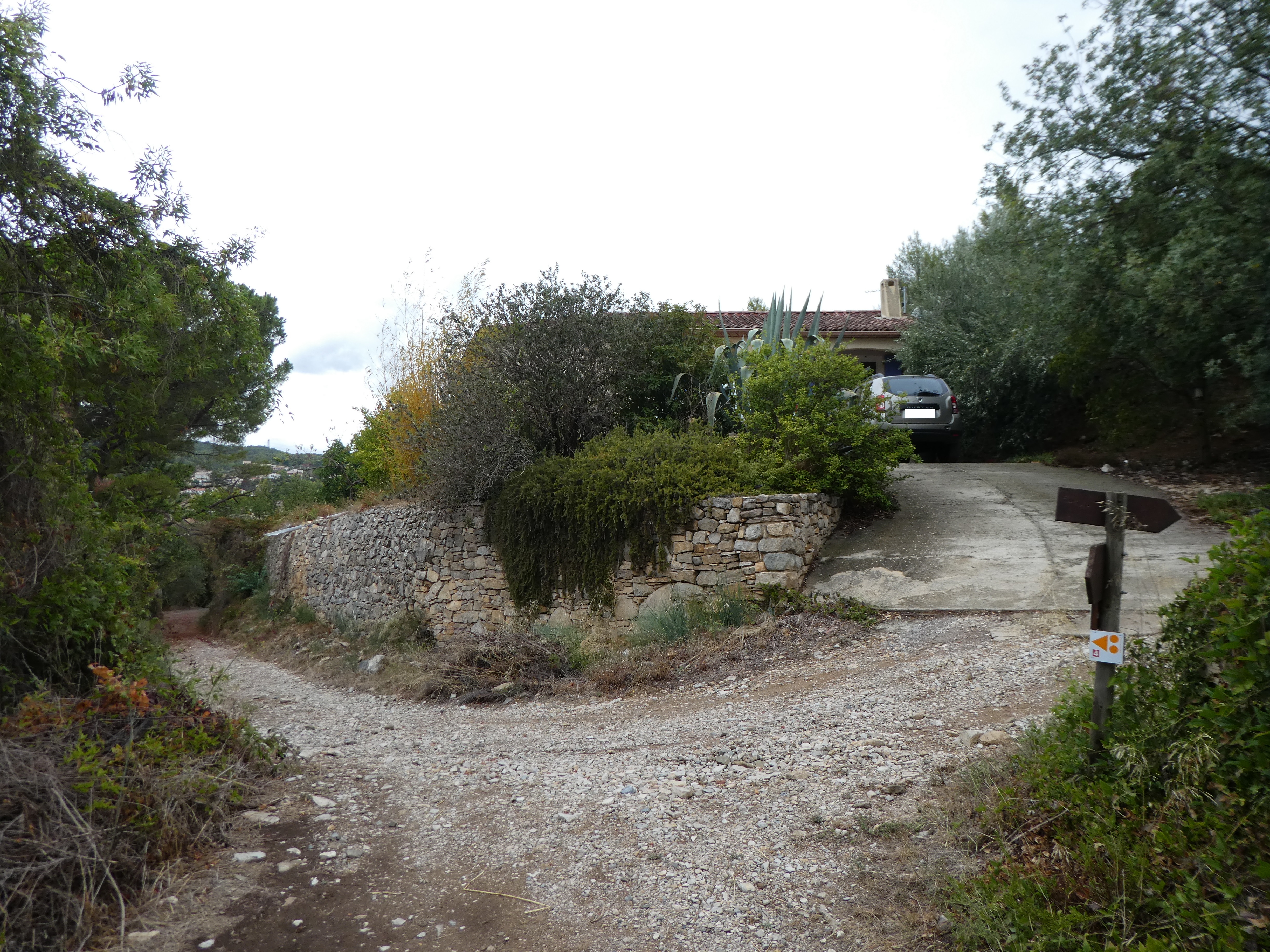 A cette intersection où les itinéraires balisés en rouge et blanc (GR), et en jaune et bleu (PR) se séparent (150 mètres après le précédent croisement mentionné), suirve celui partant sur la gauche puis la rue partant sur la droite 25 mètres plus loin direction Argeliers, balisé en rouge et blanc, et en jaune