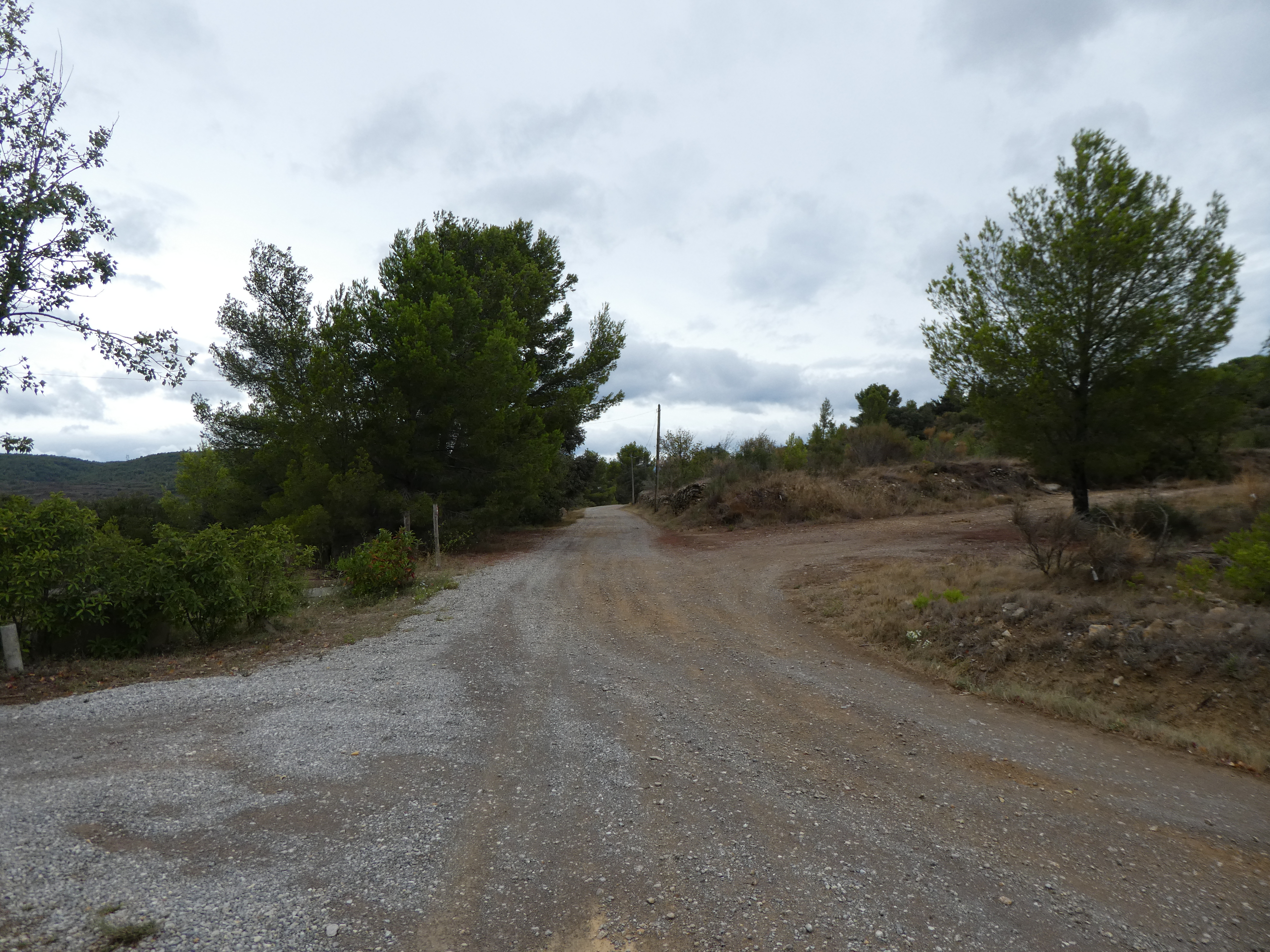A ce croisement situé au bout de la propriété de Sainte-Lucie (200 mètres après le précédent), suivre la route partant sur la gauche direction Bize-Minervois