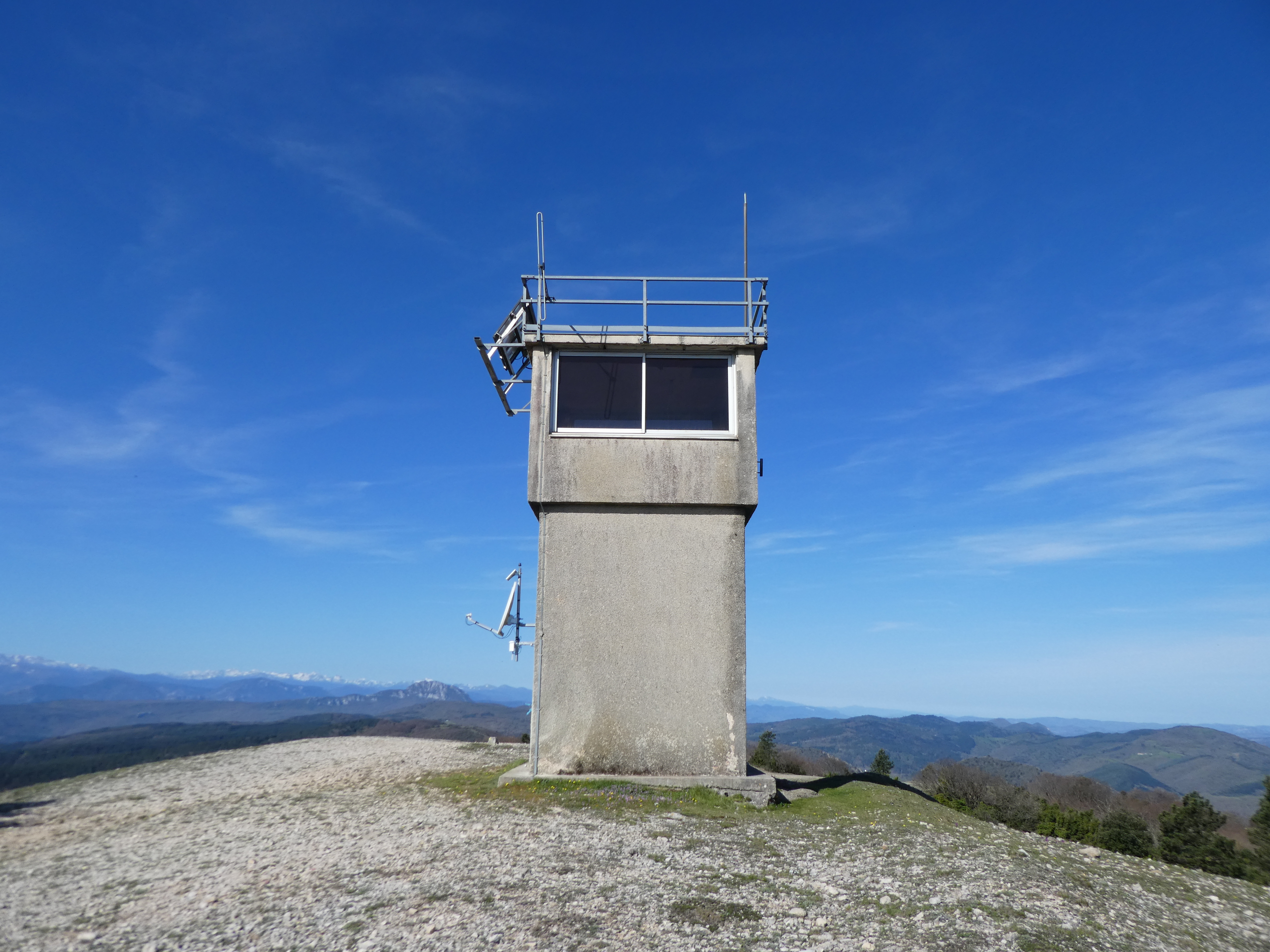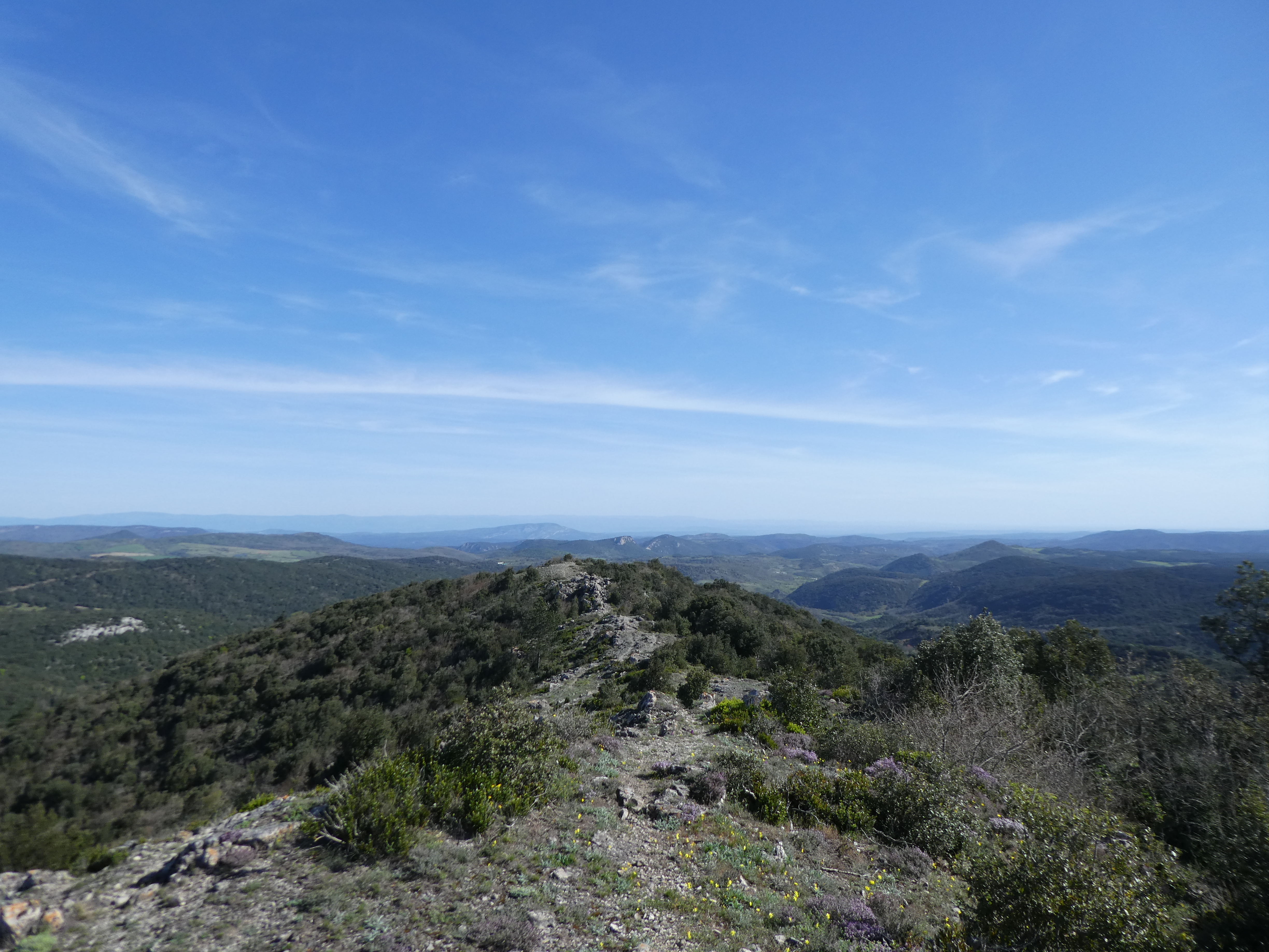 Arrivée au sommet du Milobre de Massac (907 m) : beau panorama sur les sommets de la Montagne Noire, des Corbières, du Fenouillèdes, des Albères, du Conflent, des Pyrénées Audoises, du Capcir, de la Haute-Ariège, des Monts d'Olmes, de la Vallée de l'Aude ainsi que sur la plaine audoise