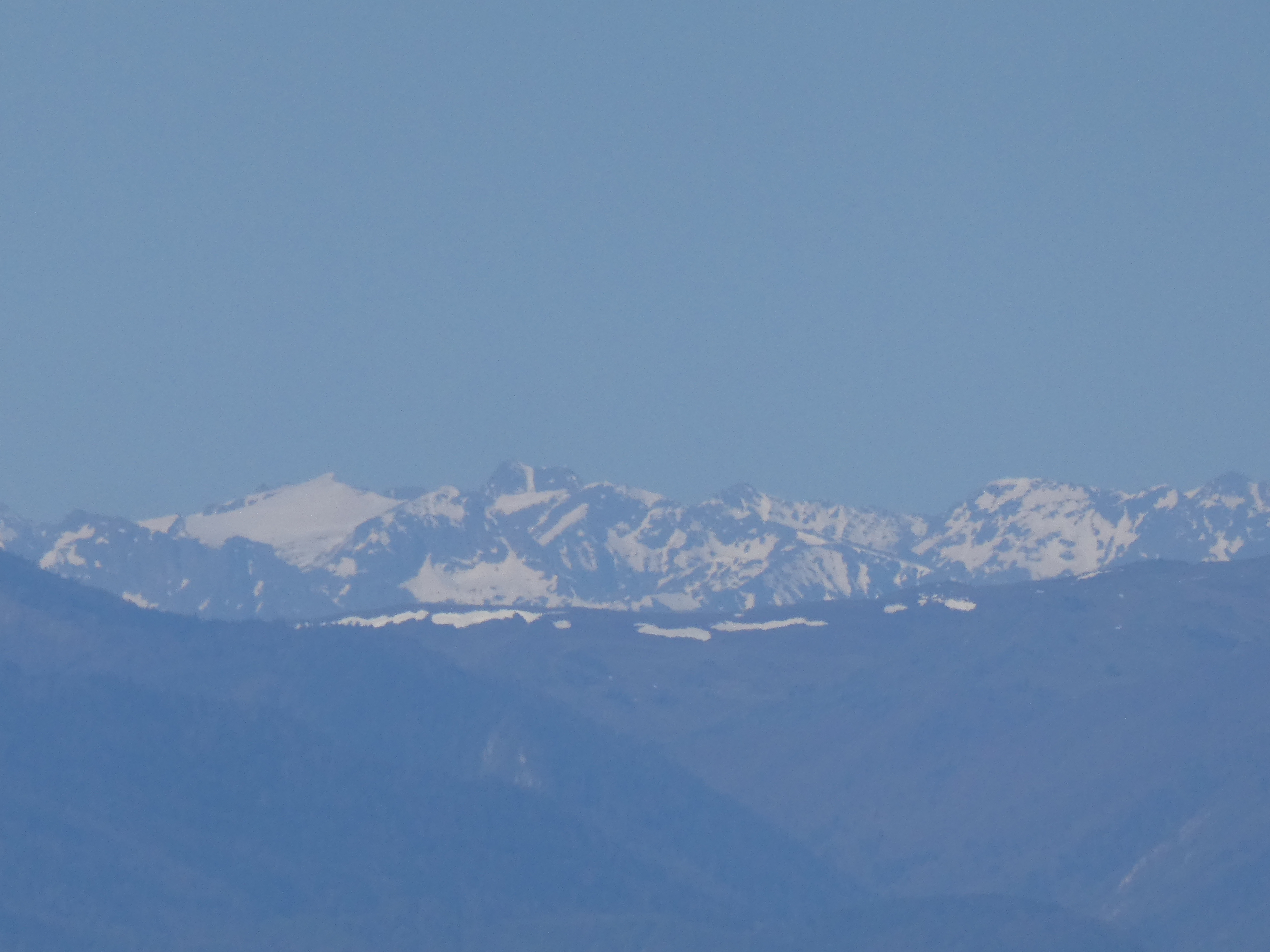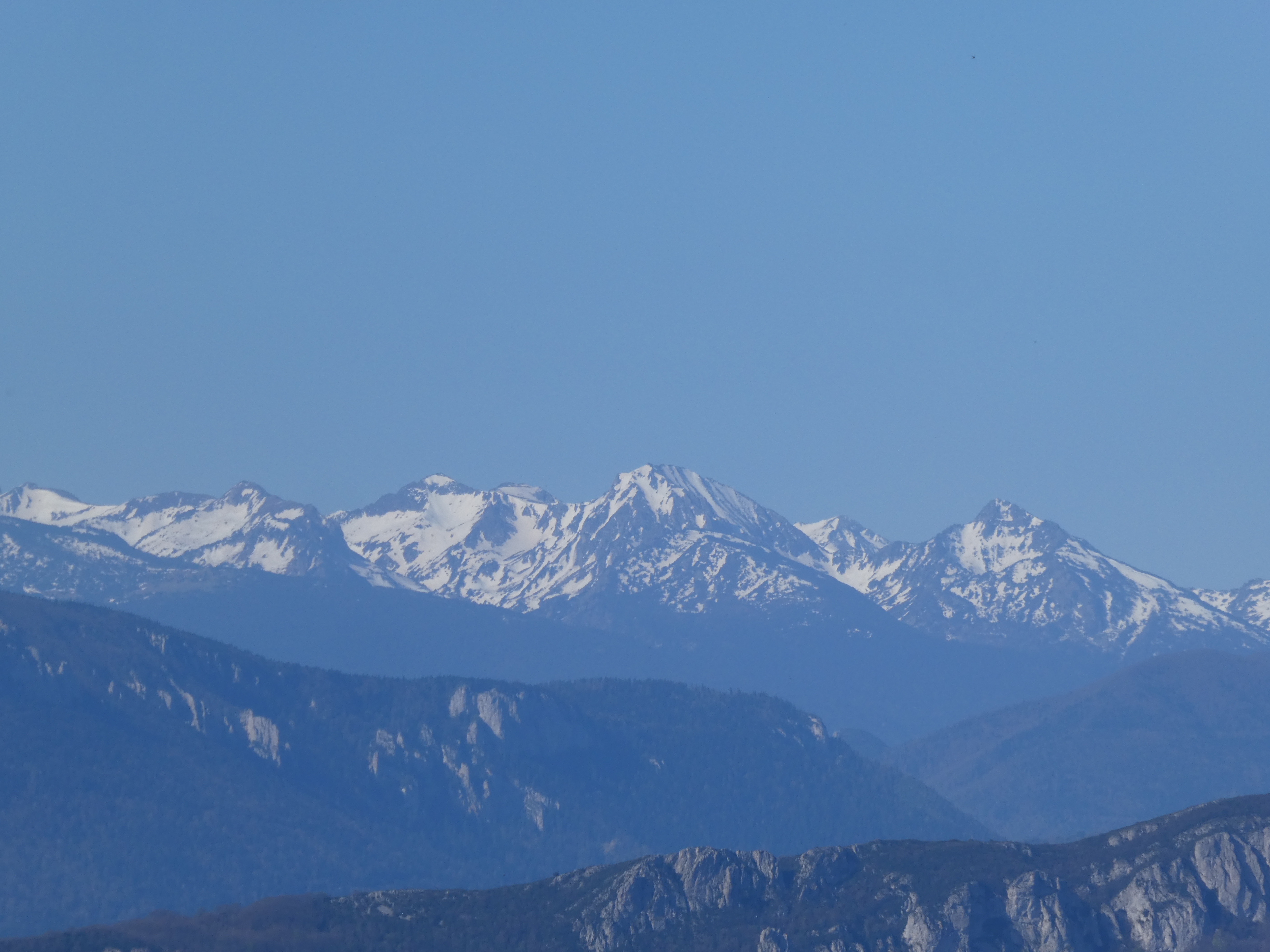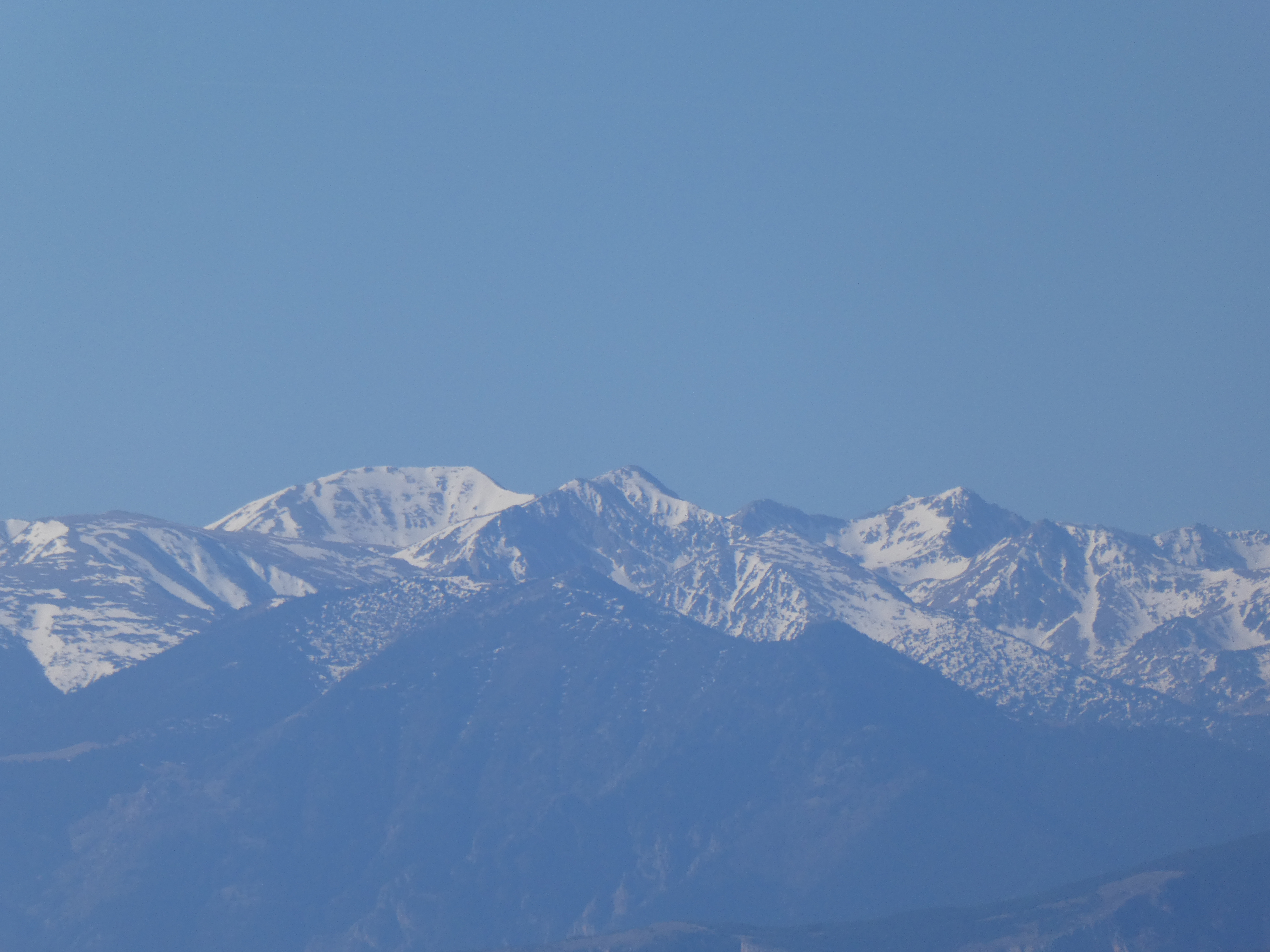 Zoom sur le massif du Canigou avec le Pic Gallinàs (2461 m) à gauche, le Puig del Roc Negre (2714 m) au centre, la Crête du Barbet (2712 m) et le Pic du Canigou (2784 m) au centre-droit, et le Pic Quazemi (2422 m) à droite