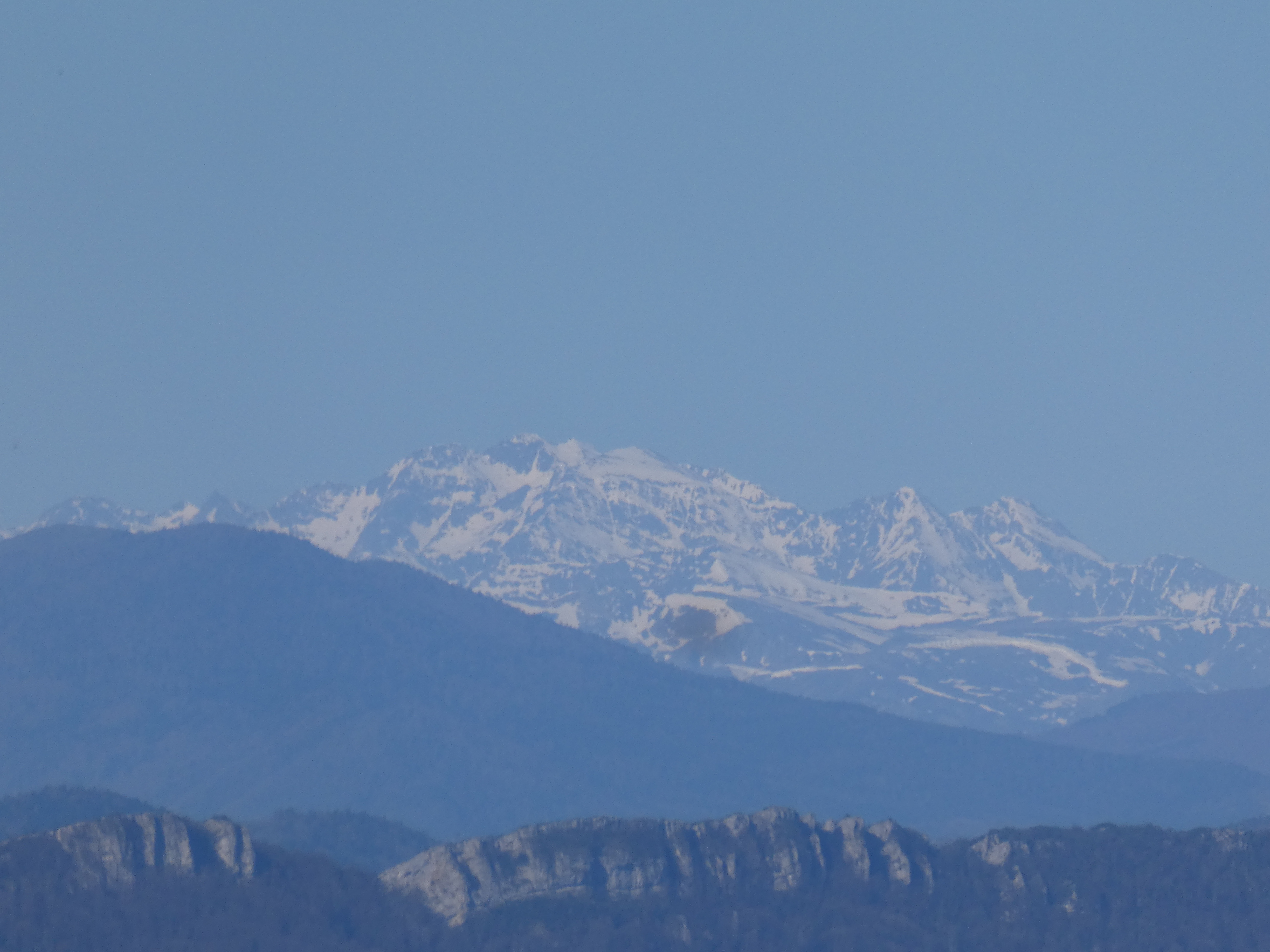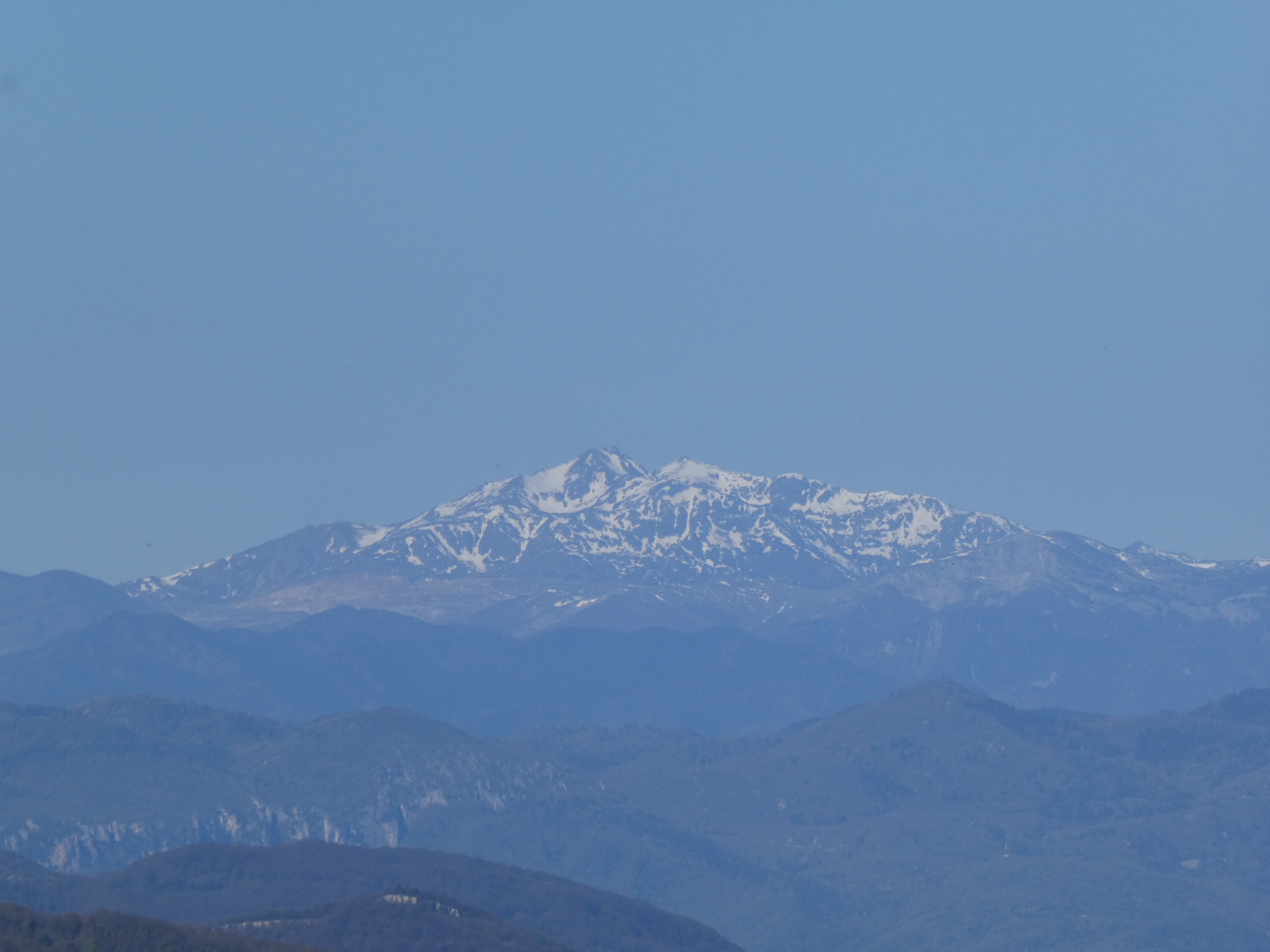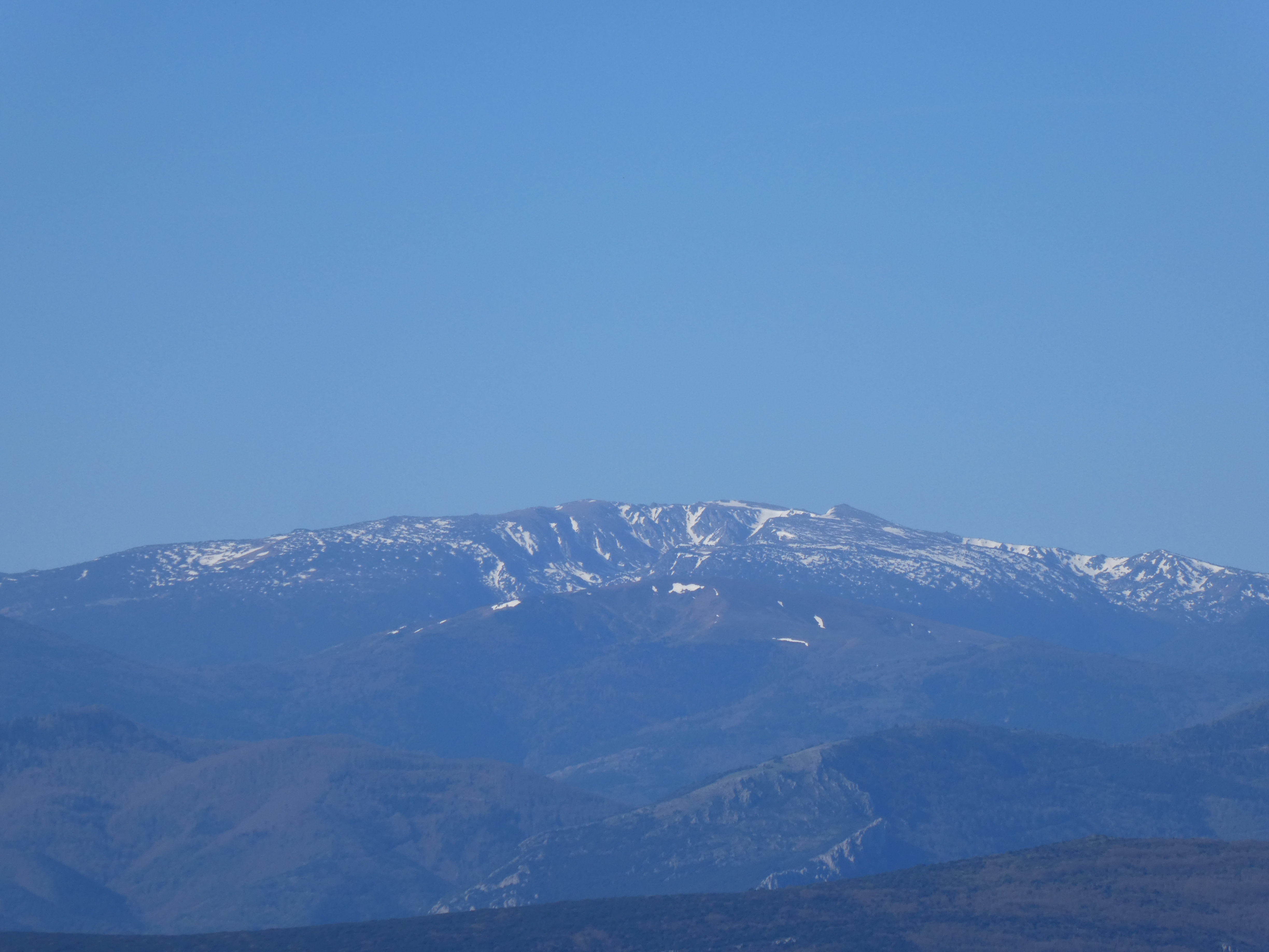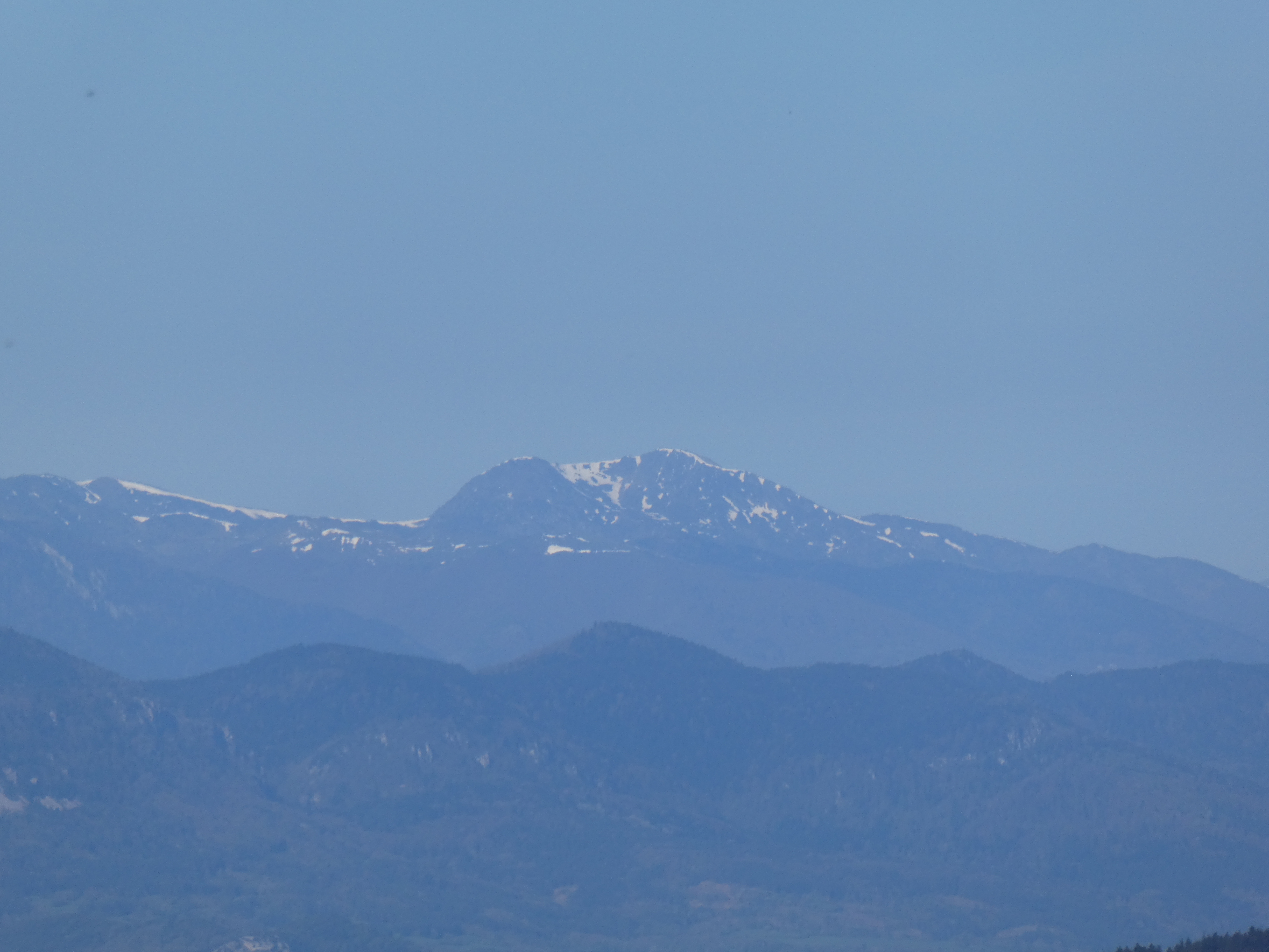 Zoom sur le massif du Canigou avec le Pic Gallinàs (2461 m) à gauche, le Puig del Roc Negre (2714 m) au centre, la Crête du Barbet (2712 m) et le Pic du Canigou (2784 m) au centre-droit, et le Pic Quazemi (2422 m) à droite