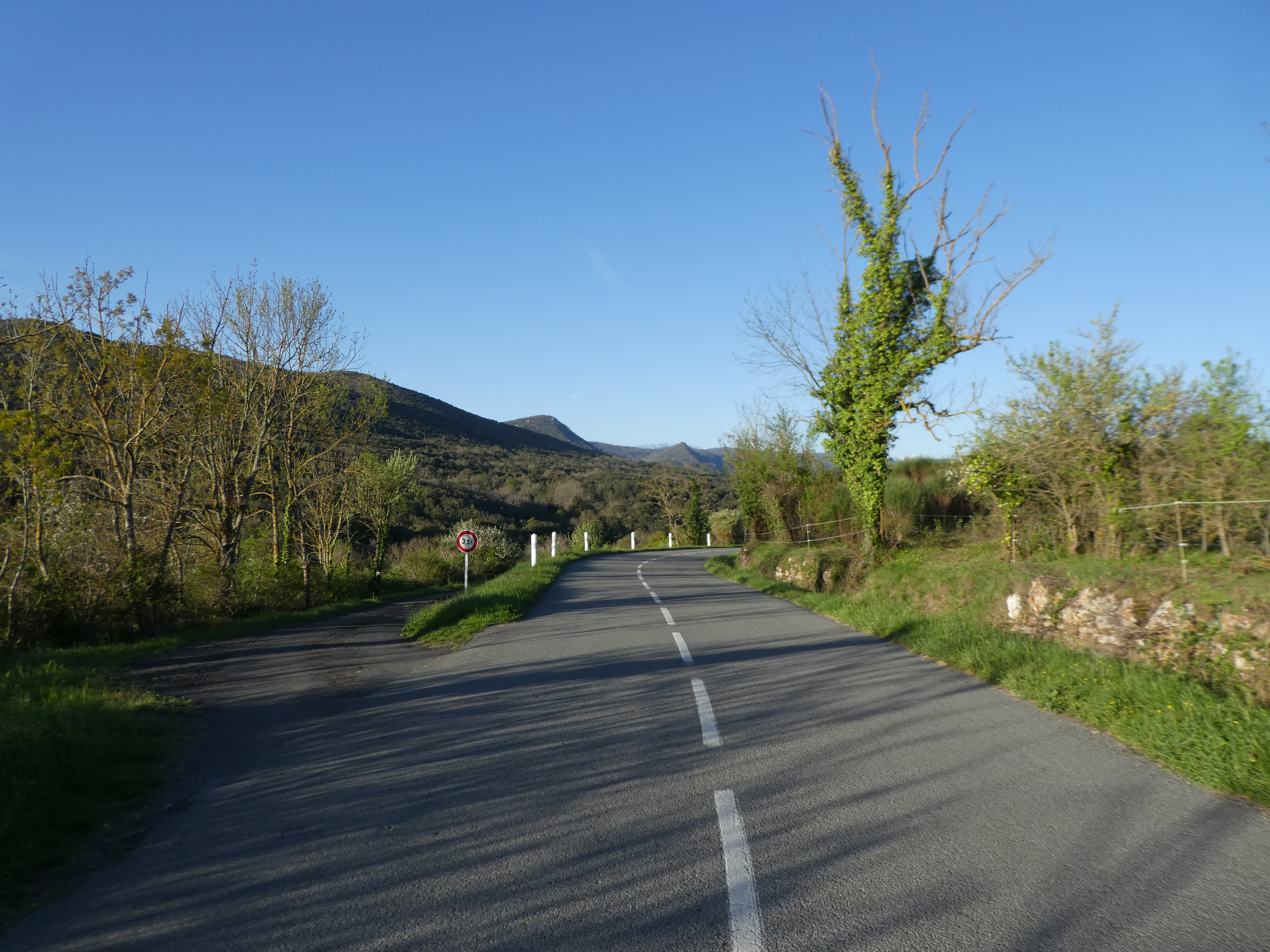 A ce croisement marqué par la présence d'un panneau directionnel (1500 mètres après le précédent), suivre la route partant sur la gauche vers le lieu-dit "Borde Grande" direction Mouthoumet, balisé en rouge et blanc