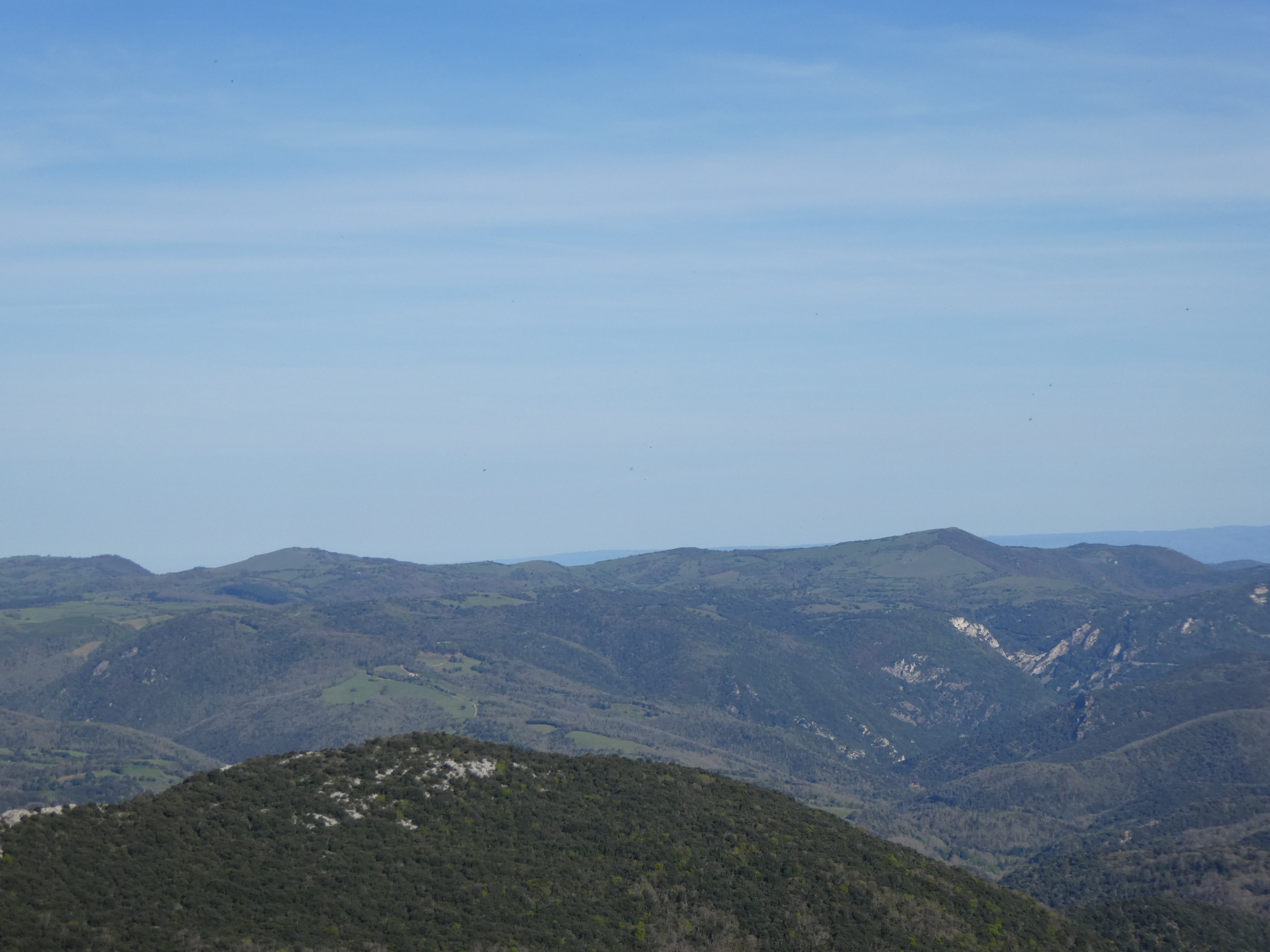 Zoom sur la Montagne de Tauch avec le Roc de la Cabanette (891 m) à gauche, l'Enseigne (879 m) au centre et le Pech de Fraysse (920 m) à droite