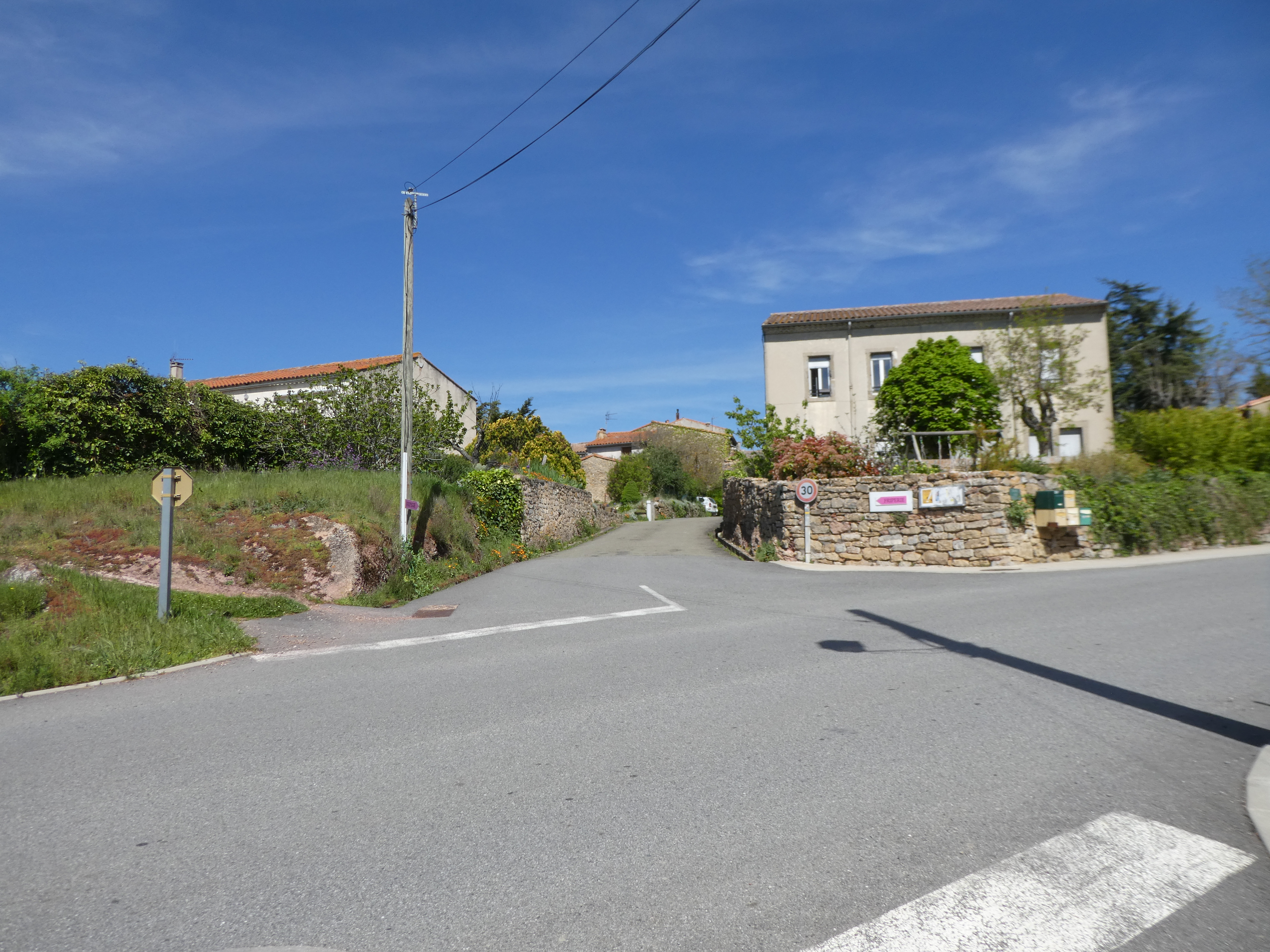 Départ Mouthoumet - Parking de la Poste (541 m) : suivre la rue partant tout droit vers la mairie direction les Bruges, balisé en jaune