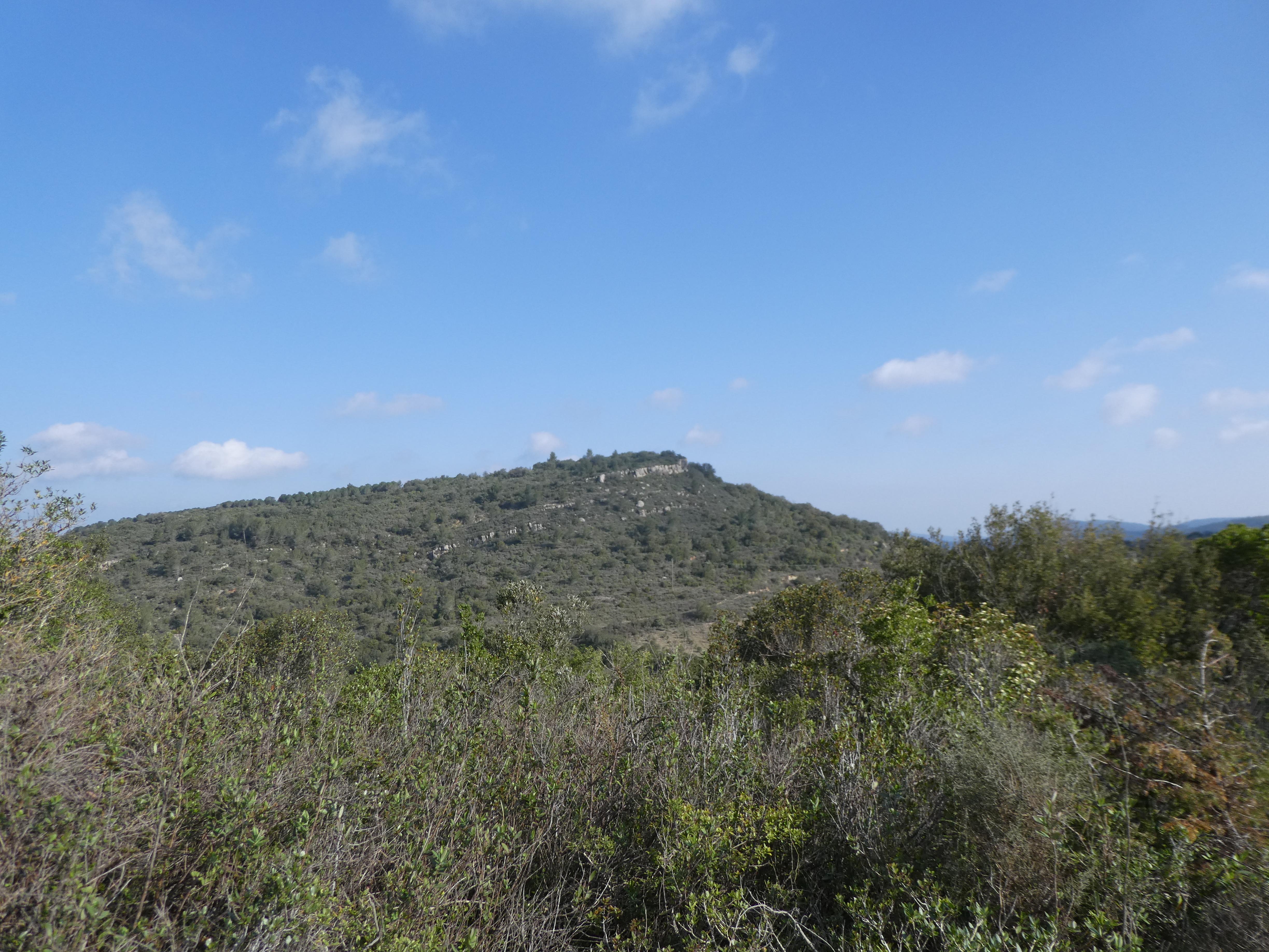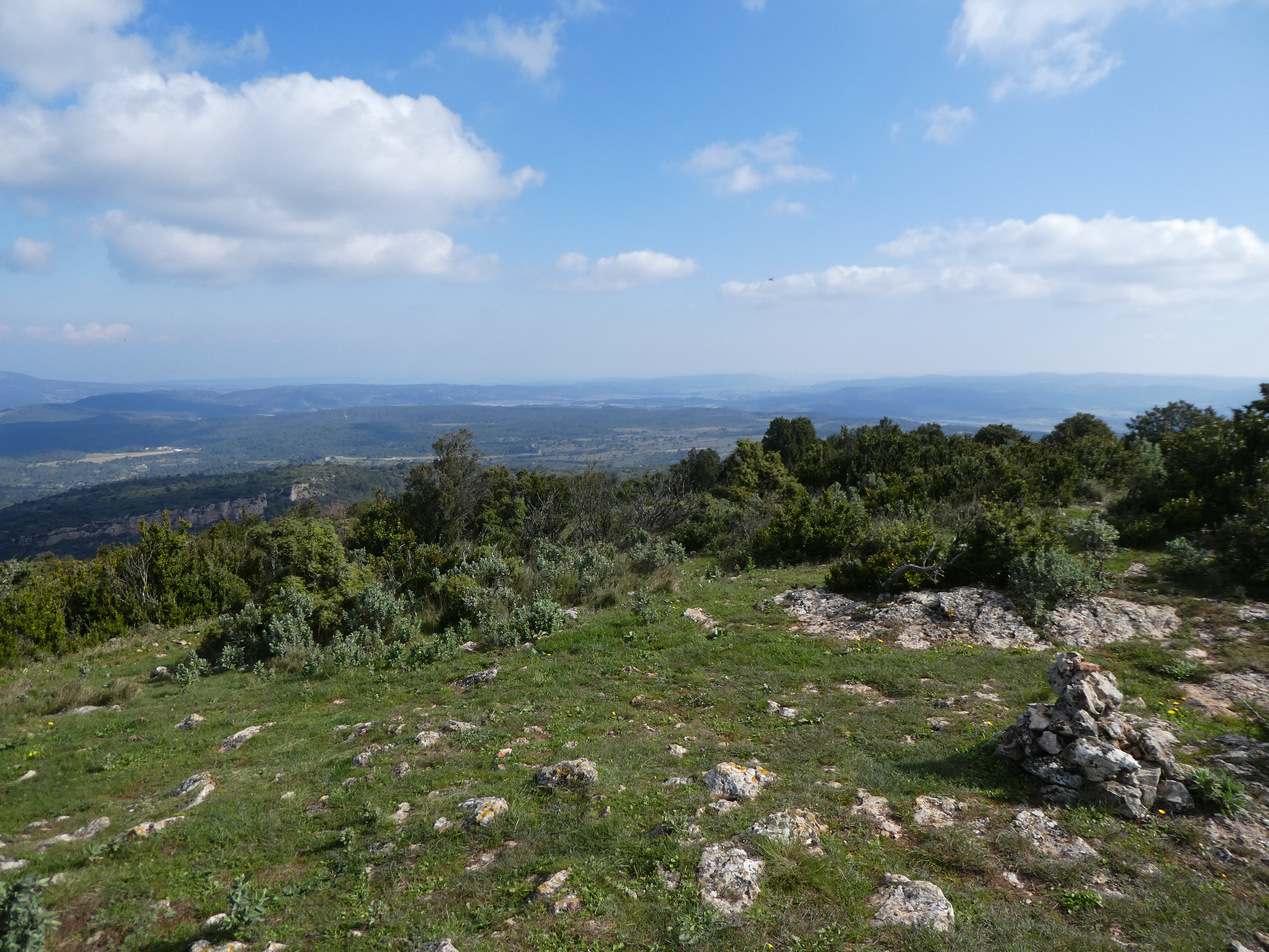 Arrivée au sommet du Mont Redon (408 m) : beau panorama sur les sommets des Corbières et du Limouxin
