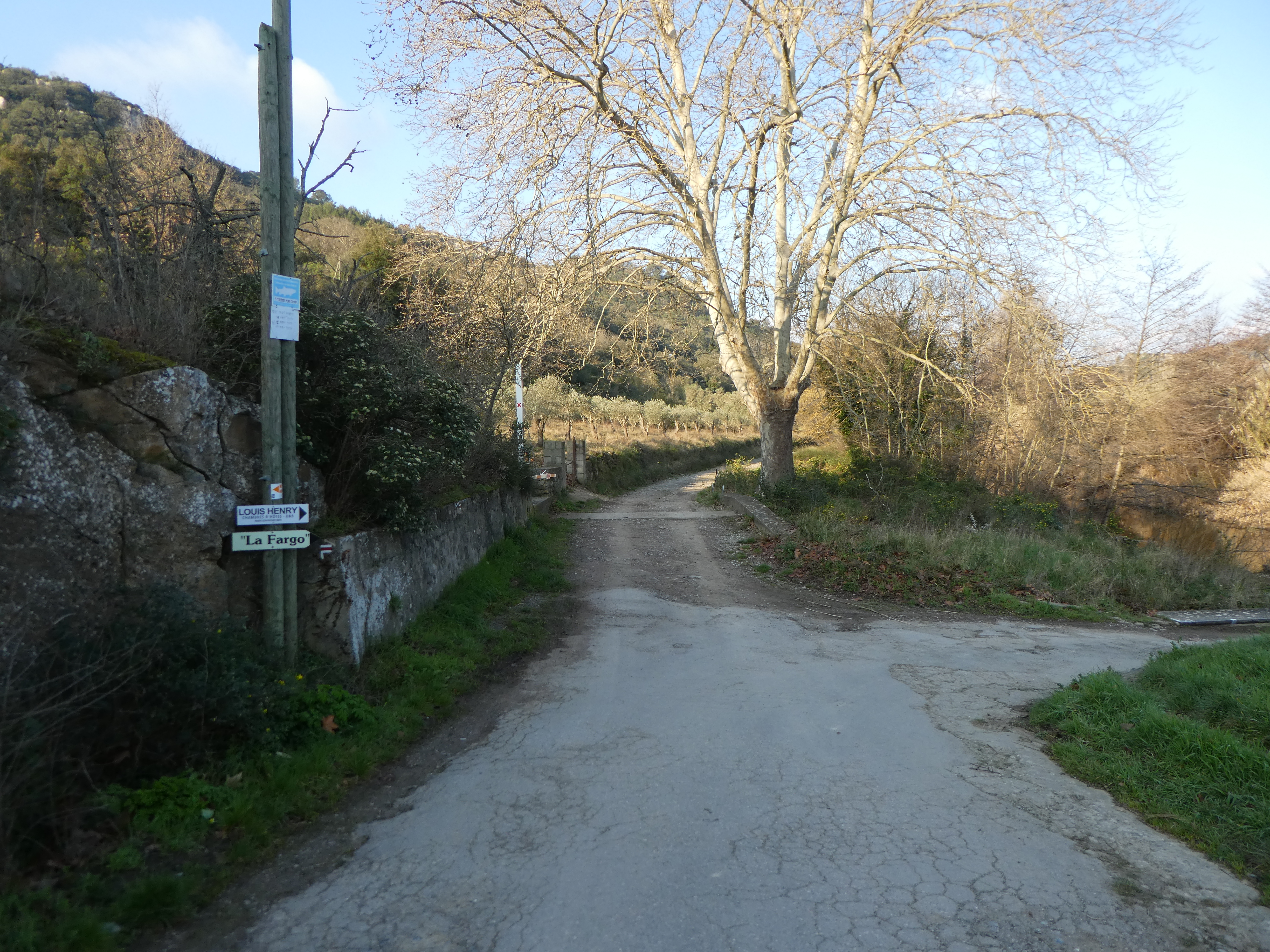 A ce croisement avec le GR36A (300 mètres après la précédente intersection), suivre ce dernier partant légèrement sur la droite vers les berges de l'Orbieu direction Col des Maures (par les berges de l'Orbieu), balisé en rouge et blanc, et sporadiquement en jaune dorénavant (il est possible de rejoindre plus rapidement le Col des Maures en suivant la D212 partant tout droit)