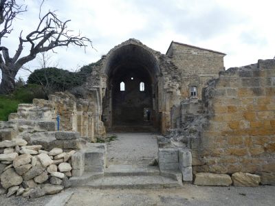 A ce croisement marqué par la présence d'un panneau directionnel situé juste avant la Chapelle Saint-Césaire, suivre le chemin partant légèrement sur la droite direction Aurons, balisé sproadiquement en jaune désuet