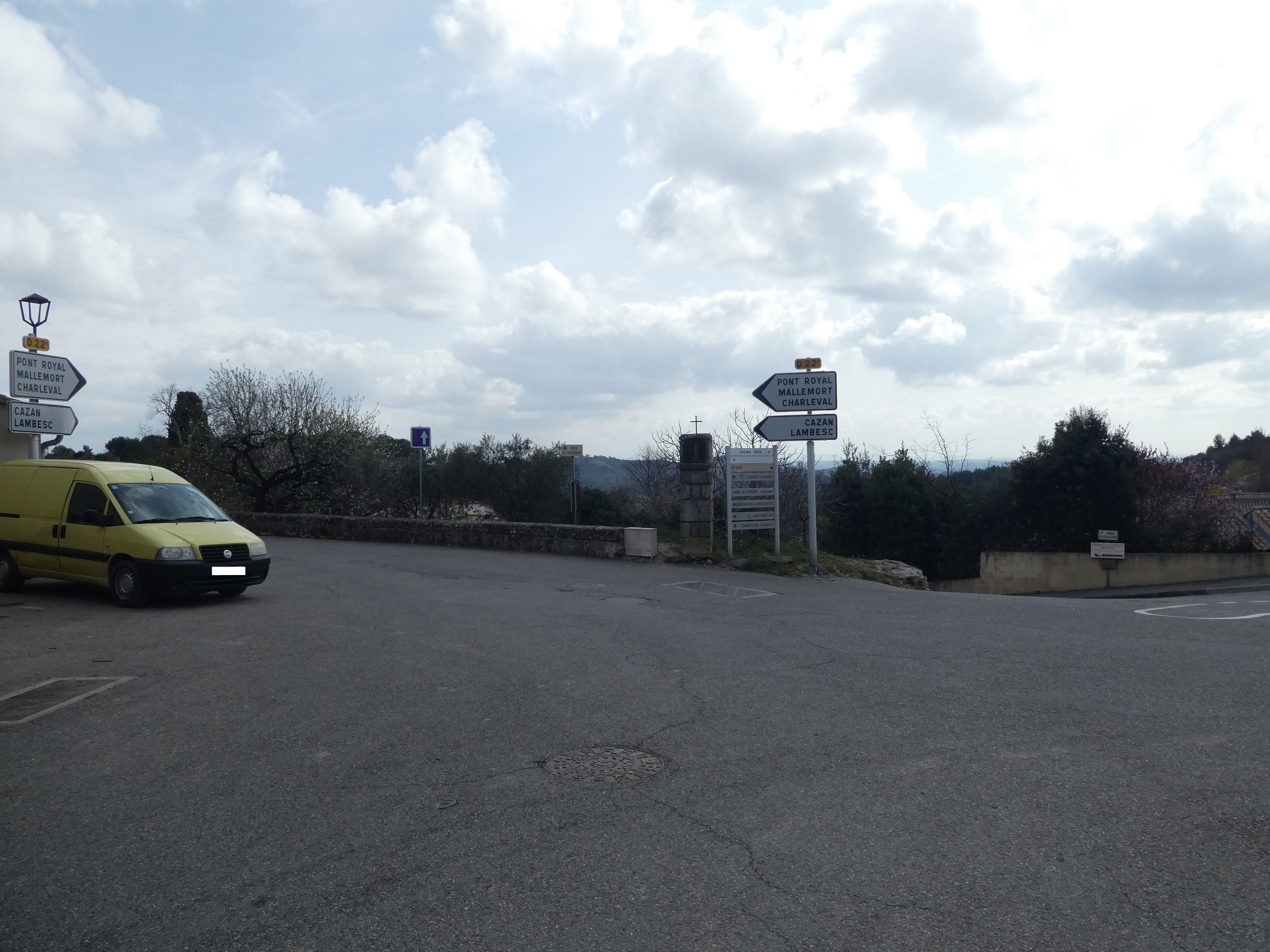 A cette intersection avec l'itinéraire balisé en jaune (100 mètres après le départ), suivre la D22b partant tout droit direction Aurons, balisé sporadiquement en jaune désuet dorénavant
