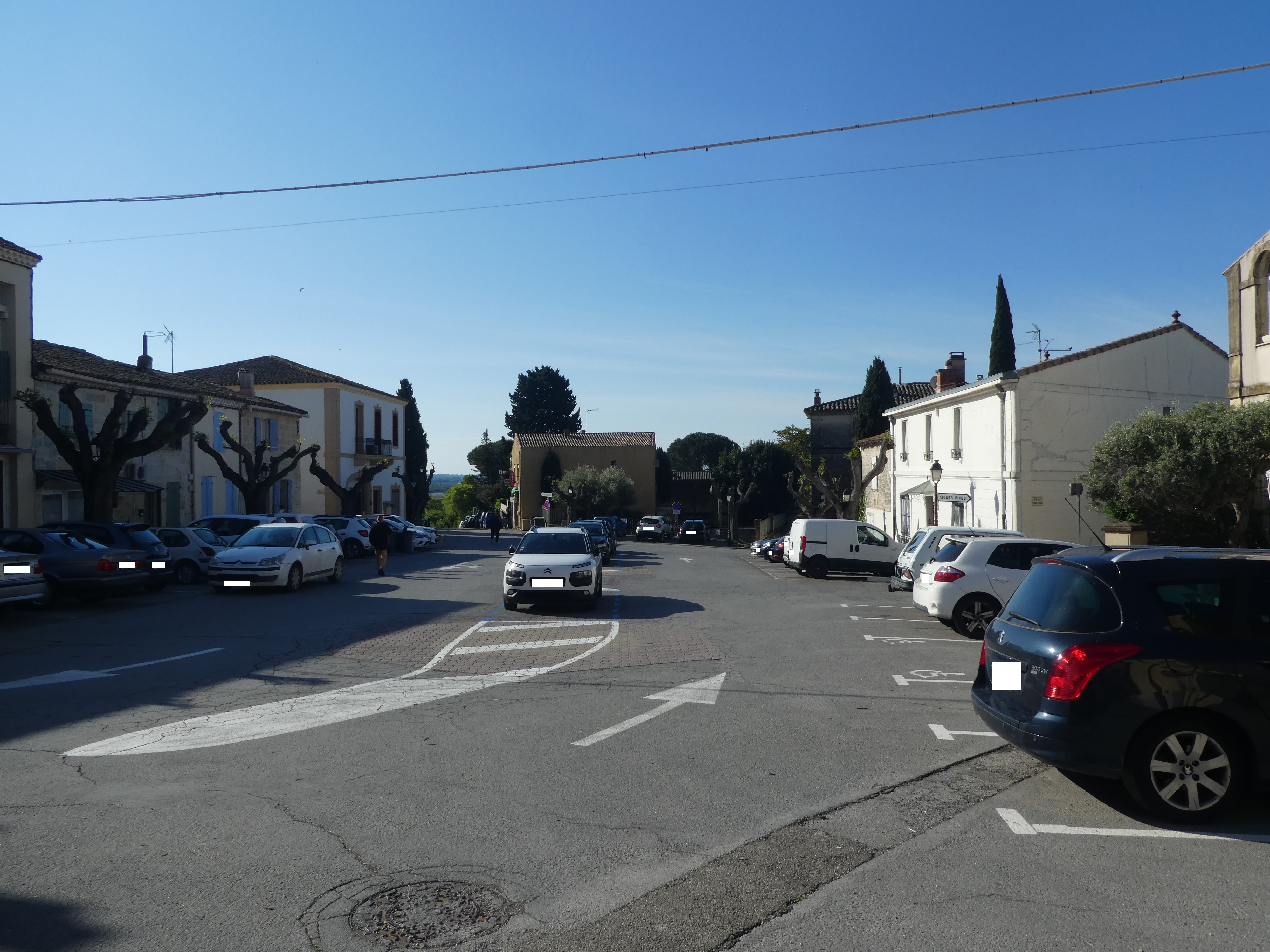 Cros de Nadal (59 m) : suivre la rue partant tout droit direction Aigues-Vives, balisé en jaune (panneau directionnel manquant)