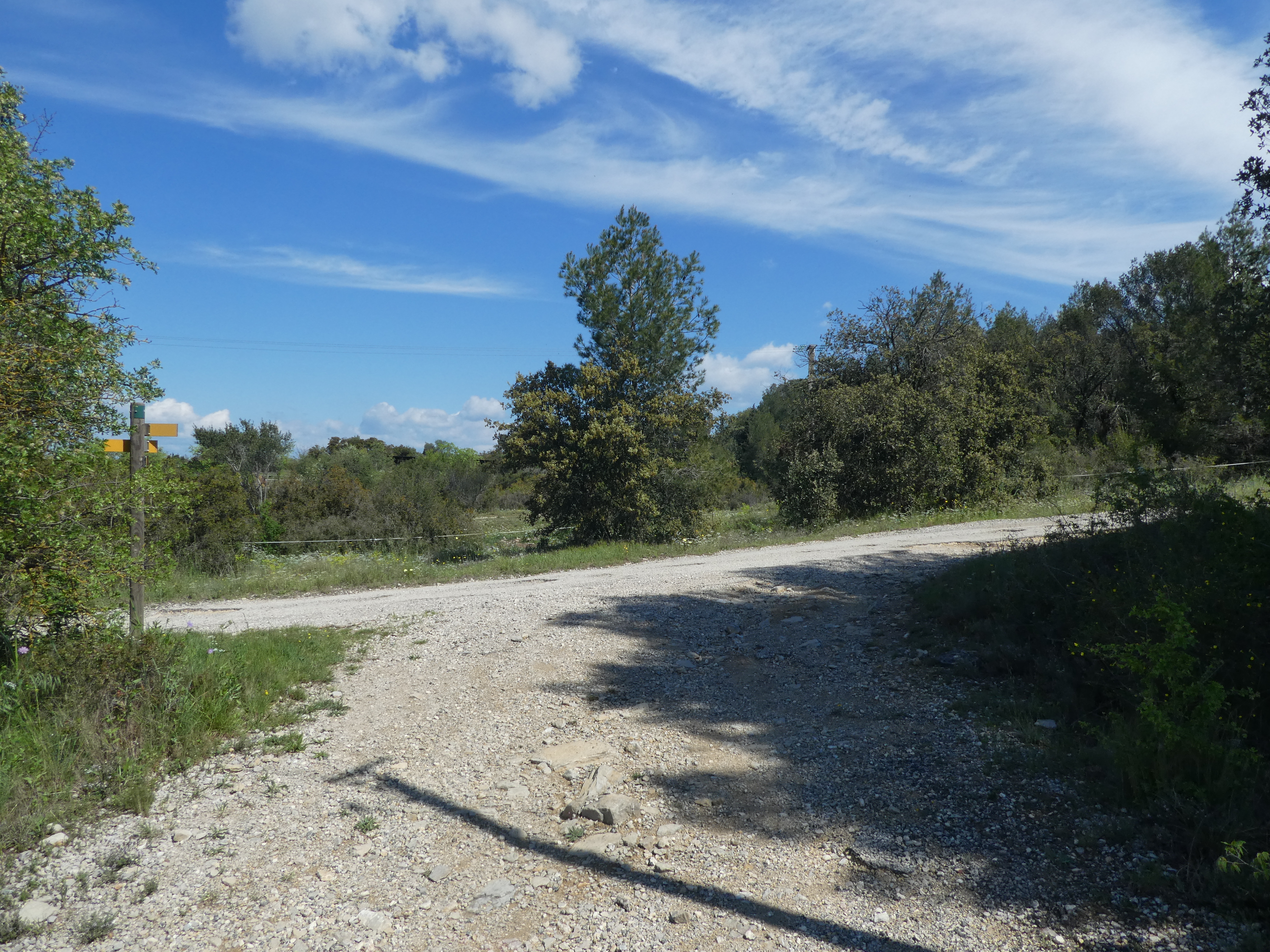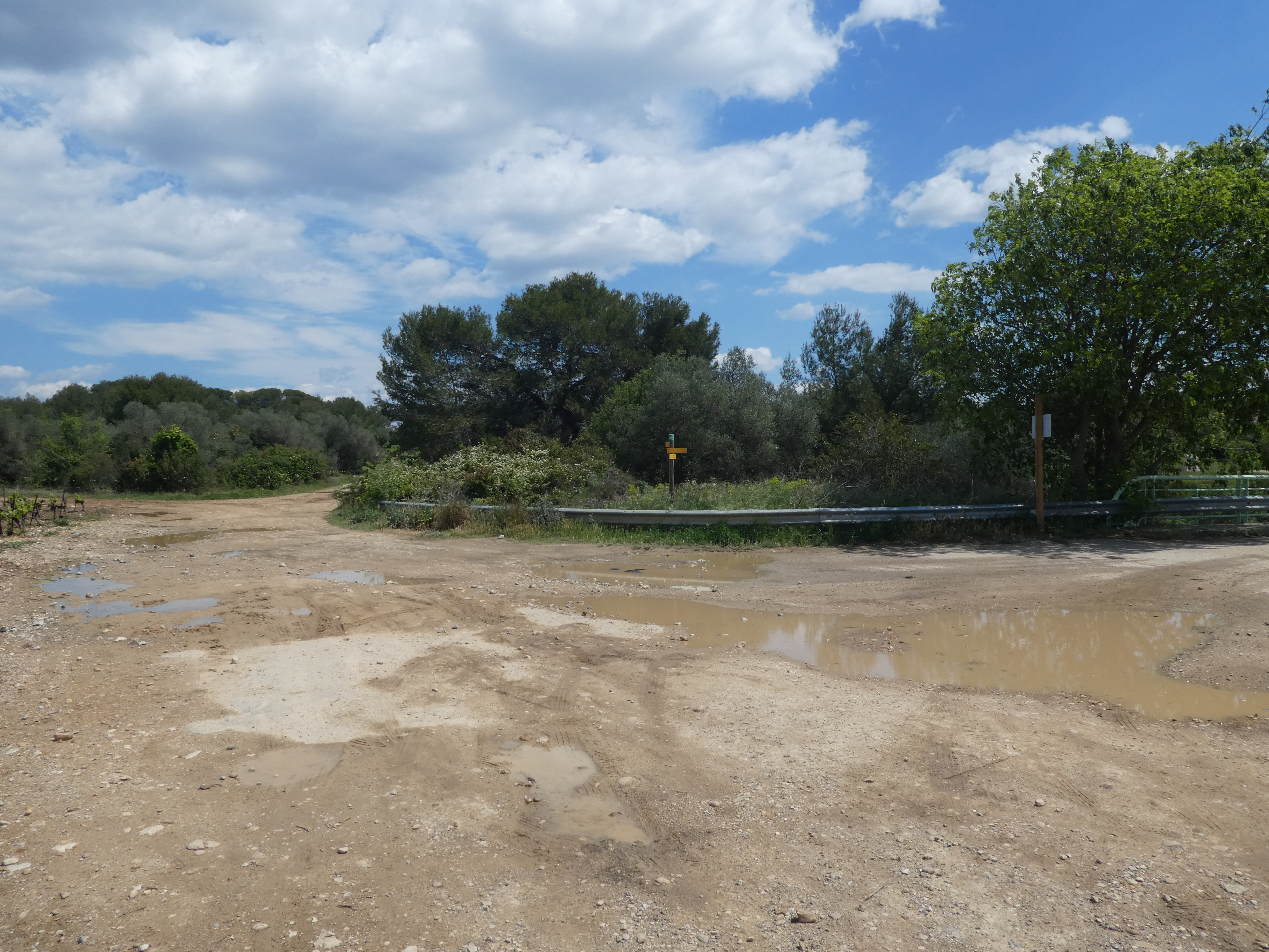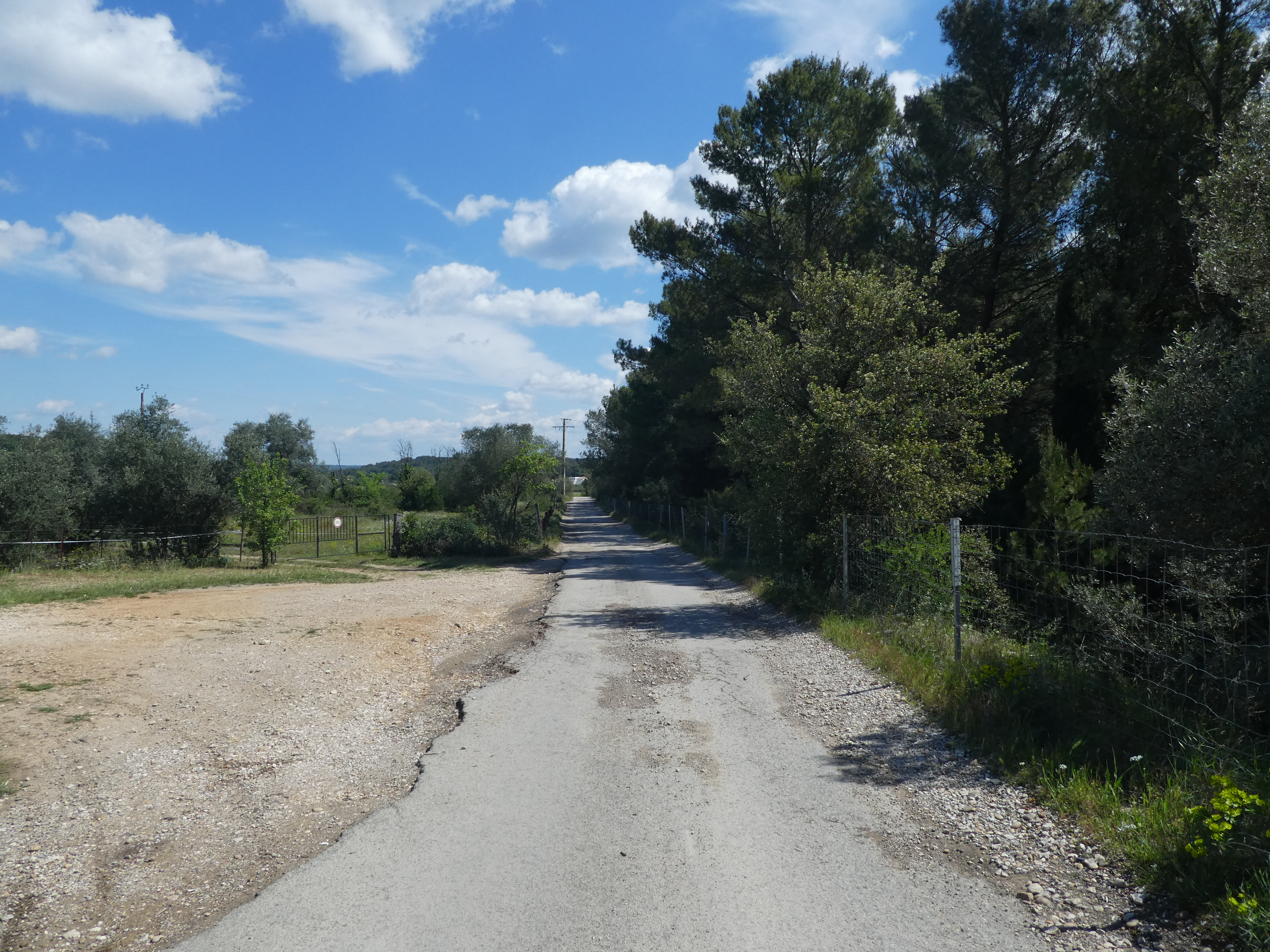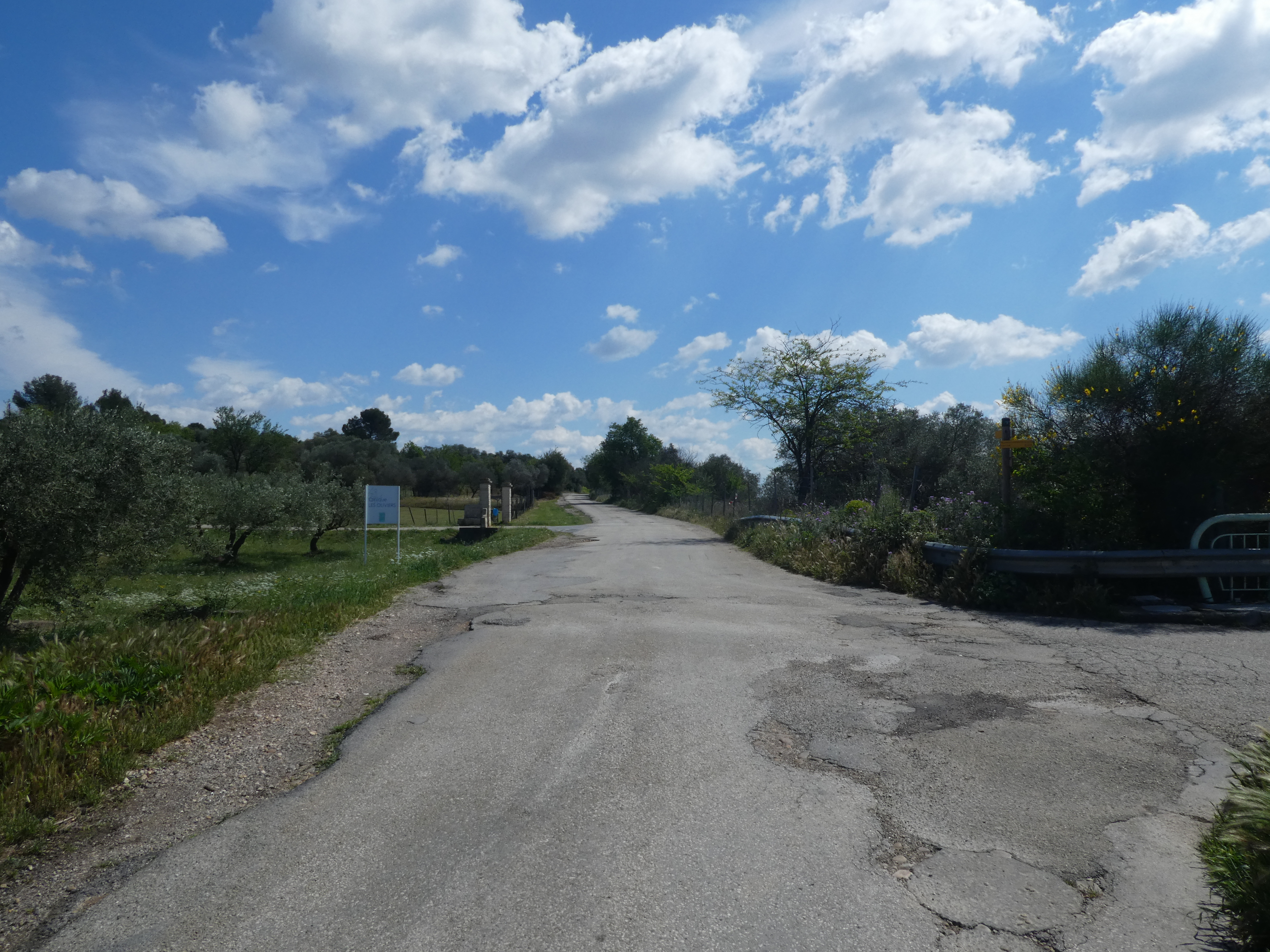Les Oliviers (50 m) : continuer à suivre la route partant tout droit et longeant l'A9 direction Aigues-Vives, balisé en jaune (ceux qui auraient raccourci la boucle à Gallargues-le-Monteux devraient se retrouver à ce point-là avec 5 kilomètres de moins parcourus)