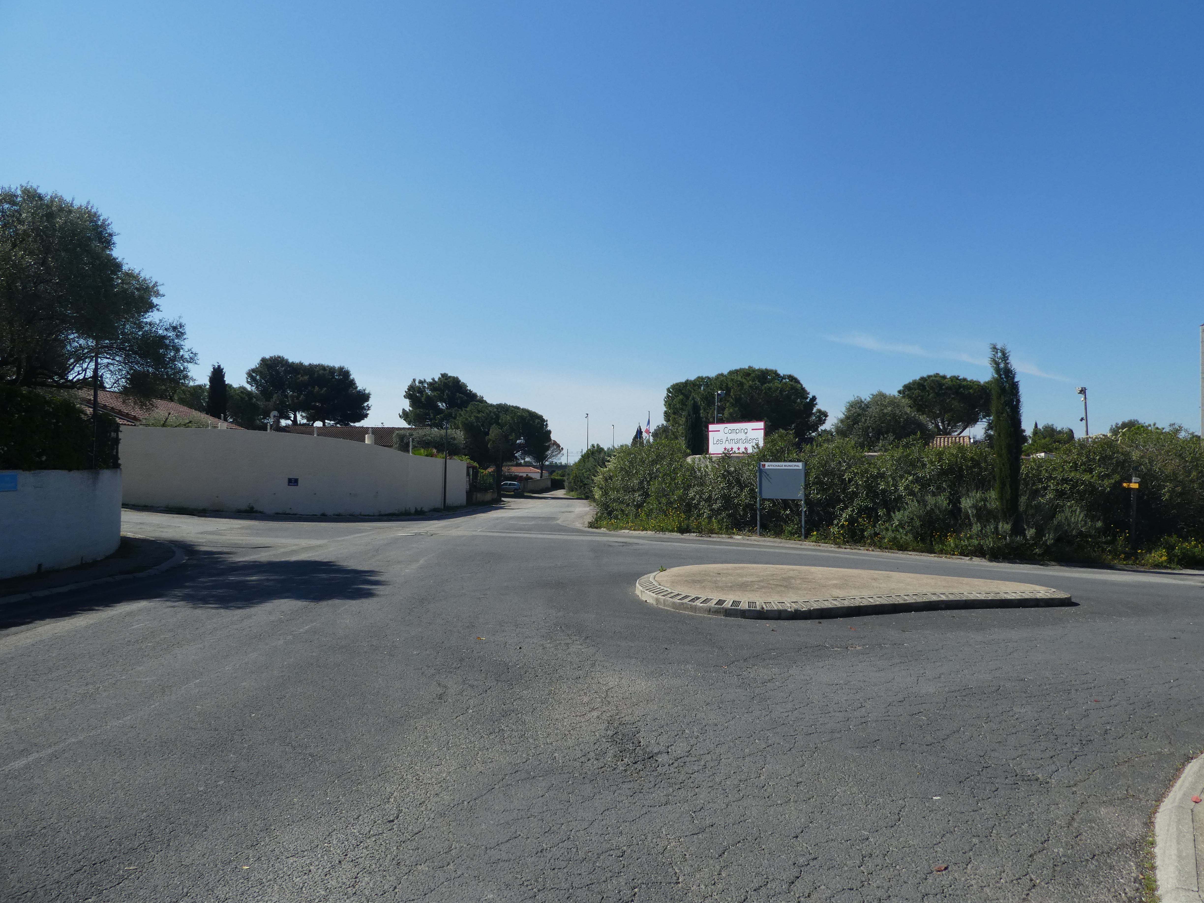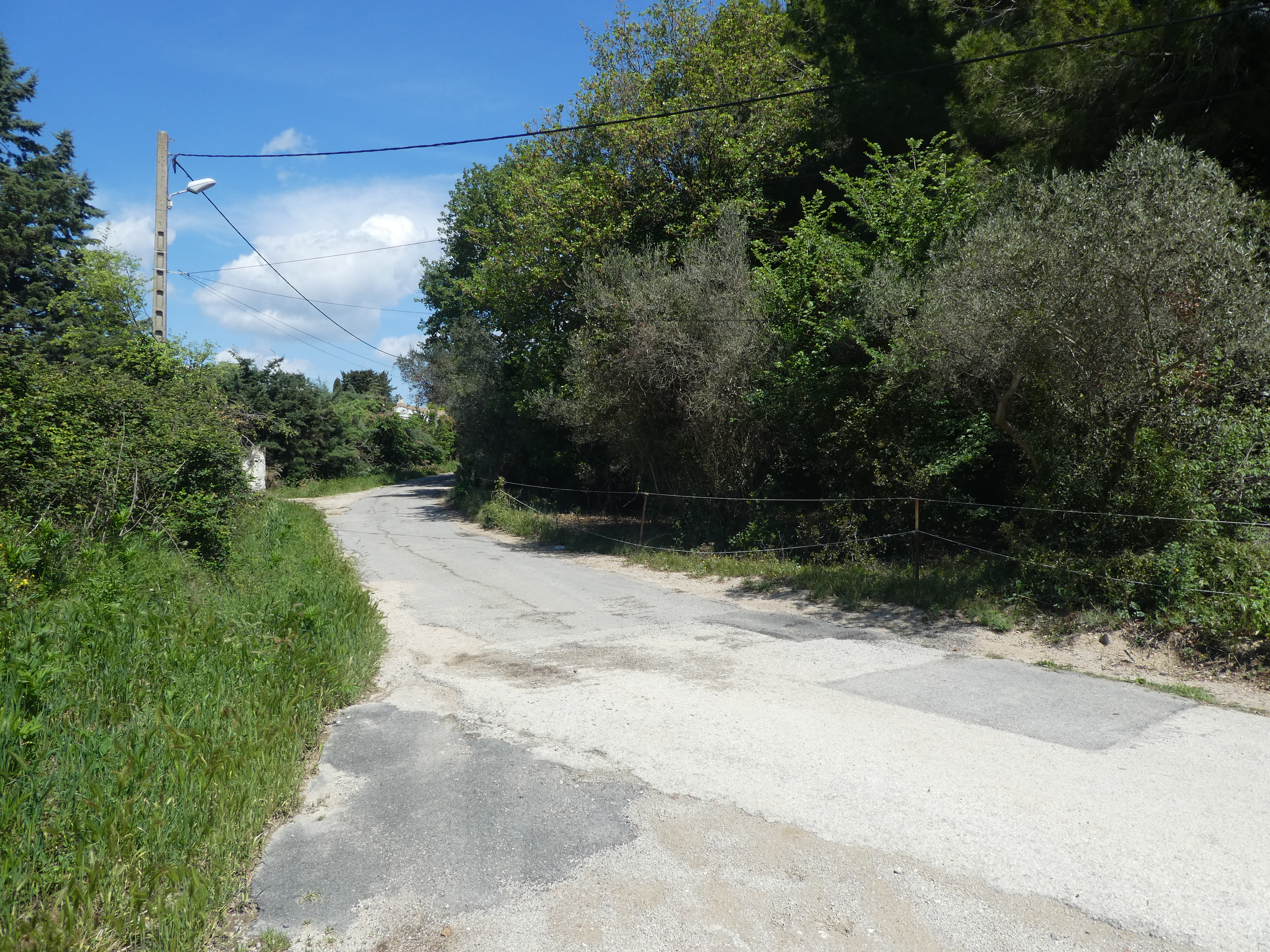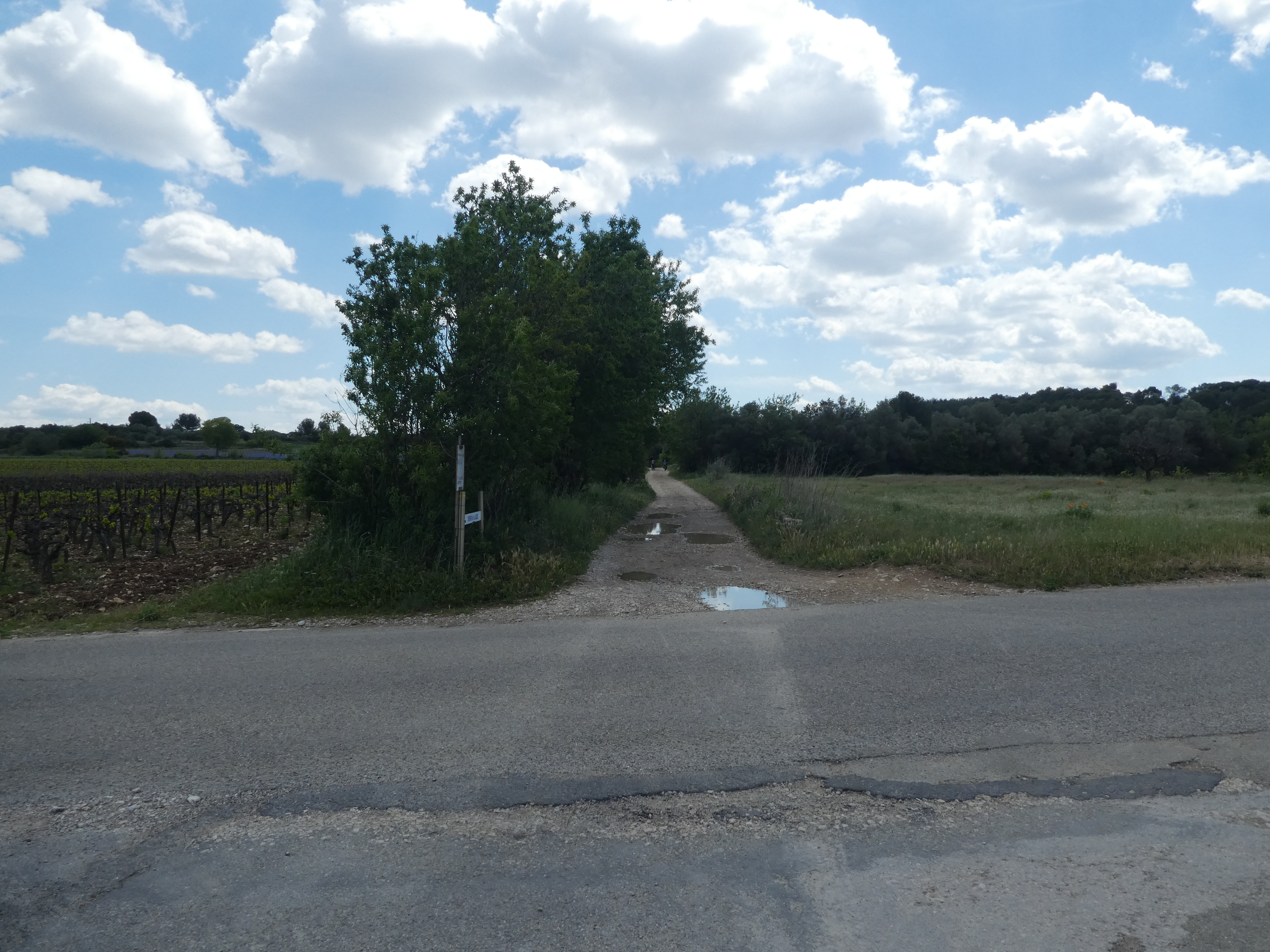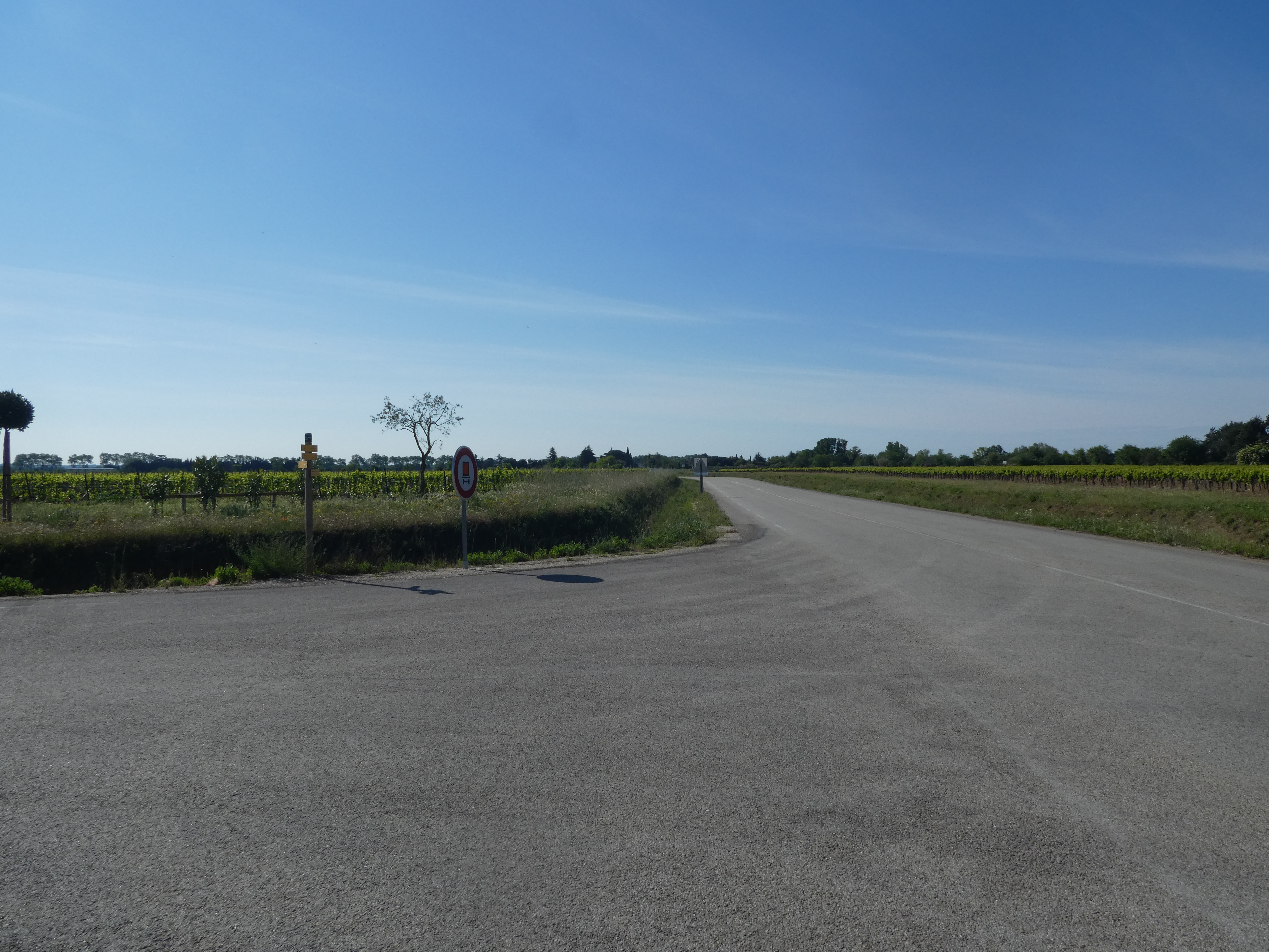 Les Oliviers (50 m) : continuer à suivre la route partant tout droit et longeant l'A9 direction Aigues-Vives, balisé en jaune (ceux qui auraient raccourci la boucle à Gallargues-le-Monteux devraient se retrouver à ce point-là avec 5 kilomètres de moins parcourus)