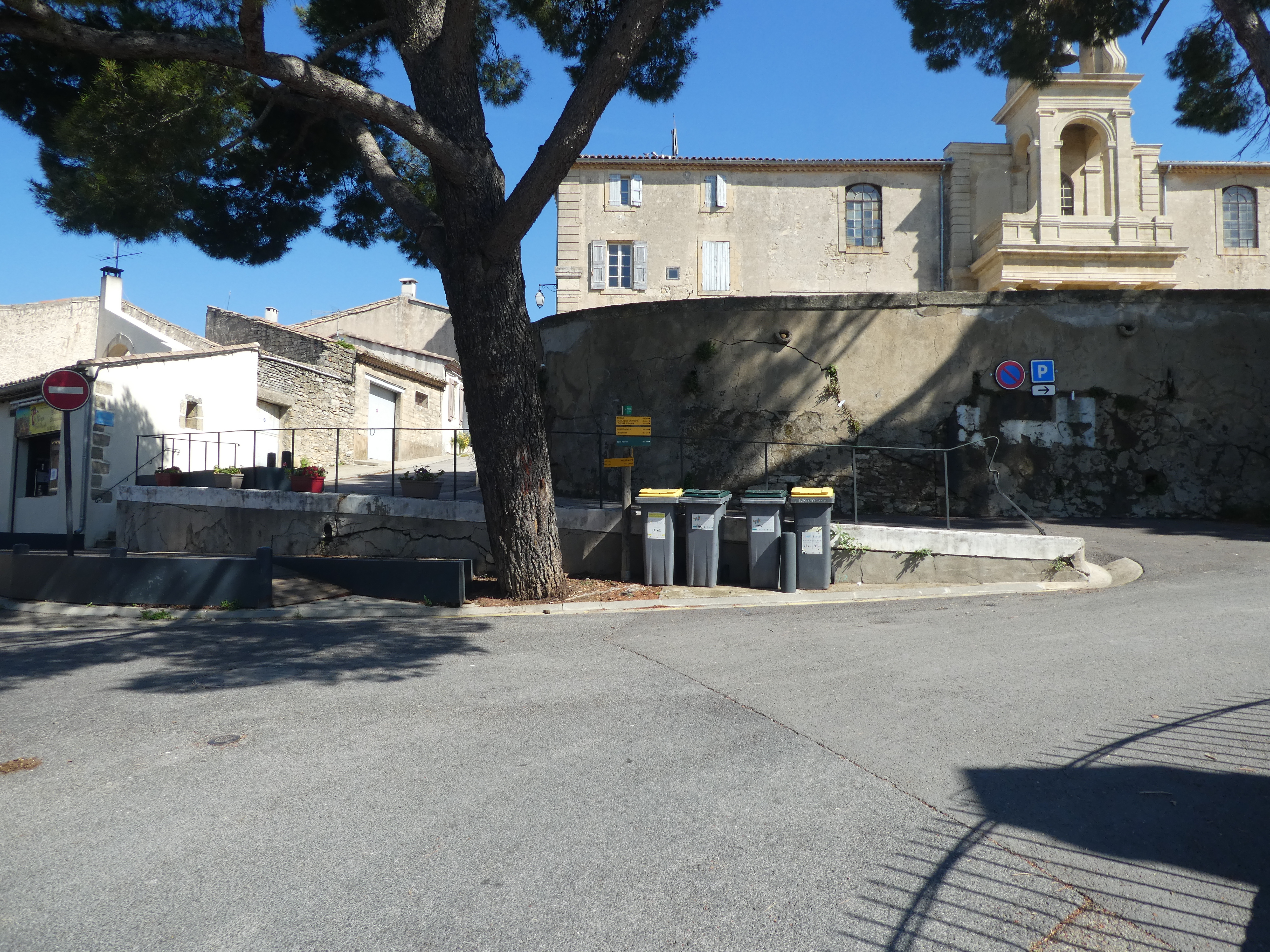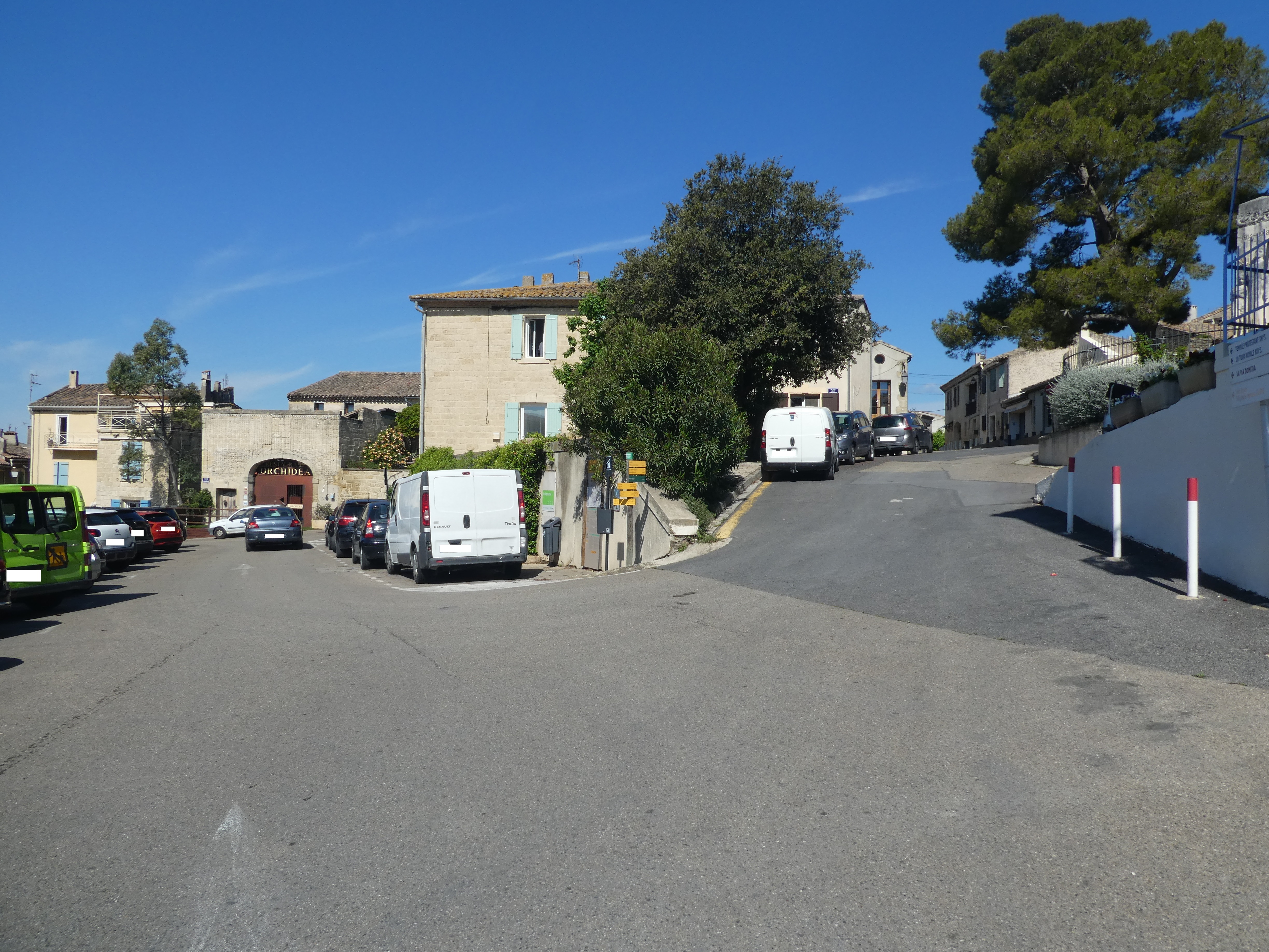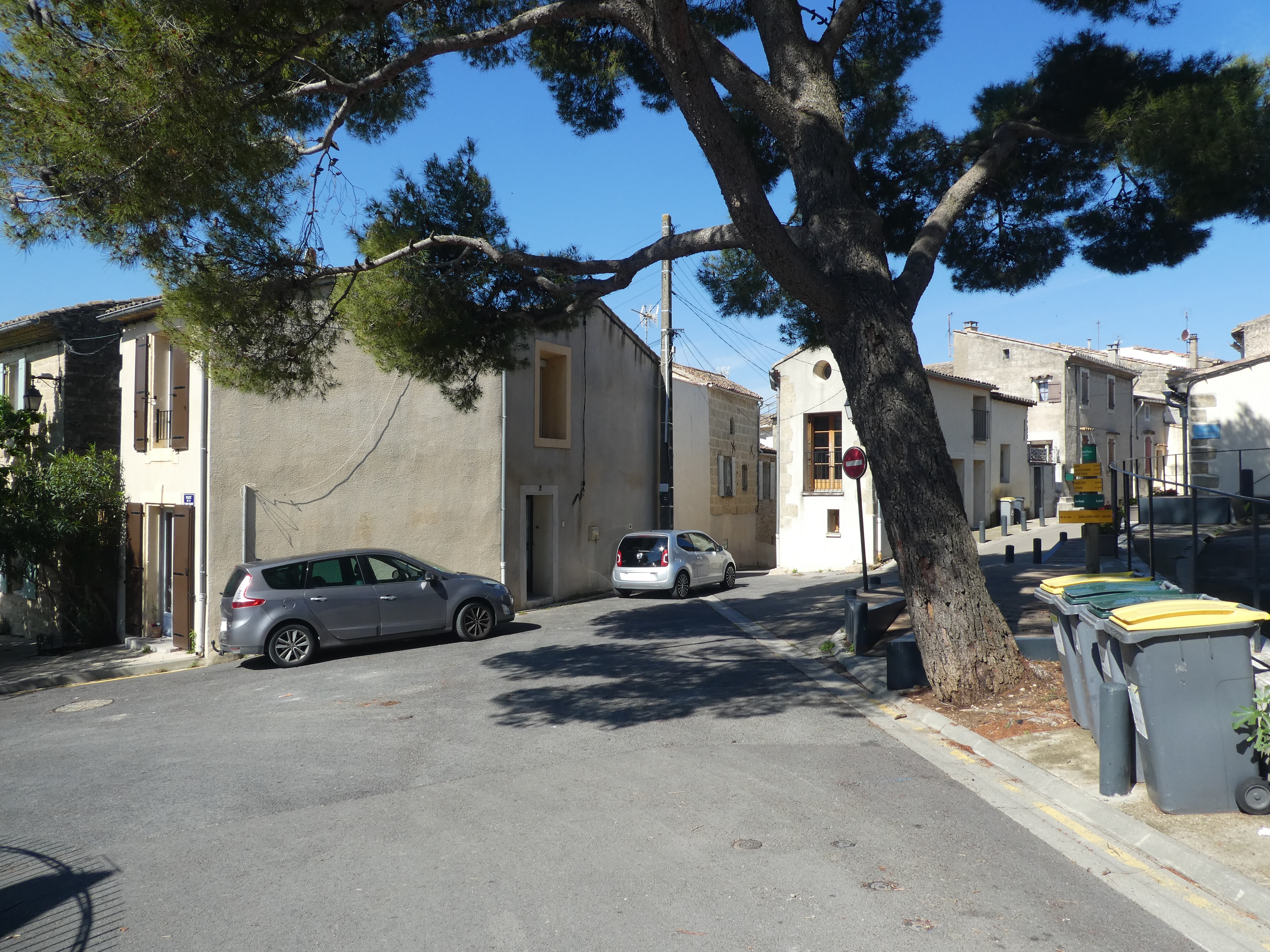 Gallargues-le-Monteux (55 m) : suivre la rue partant sur la droite pour faire un aller-retour vers le temple et la Tour Royale direction Tour Royale, balisé uniquement en jaune dorénavant