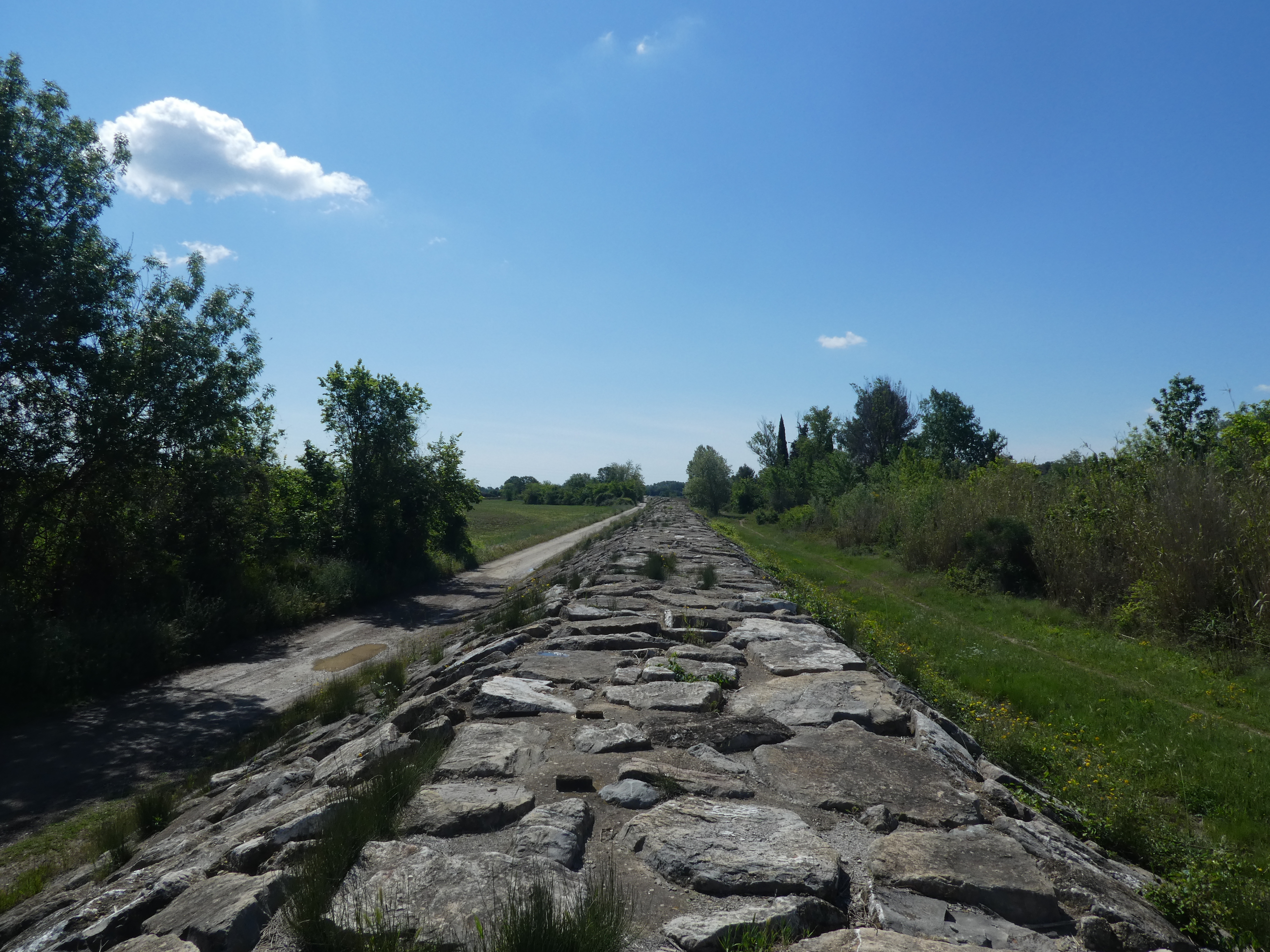 Zoom sur la dernière arche encore debout du Pont Ambroix, les dix autres ayant été emportées par les crues successives du Vidourle au cours de l'histoire appelées Vidourlades ; repartir dans le même sens que celui de l'aller direction Moulin de Carrière