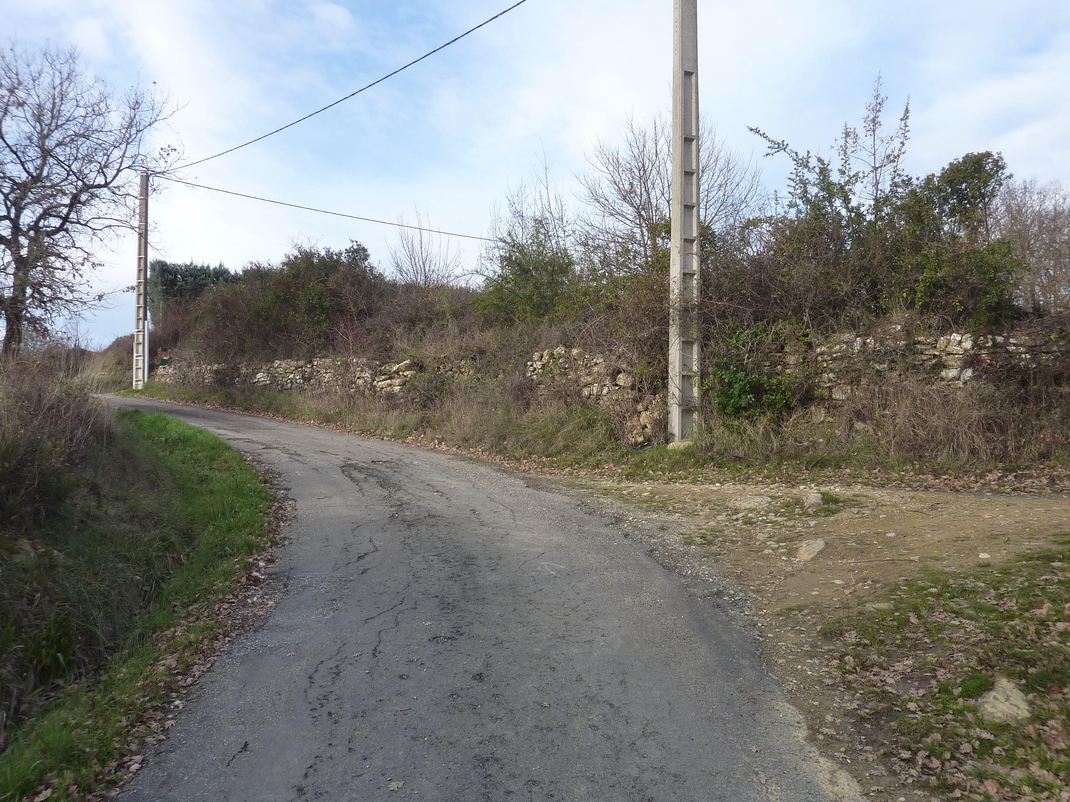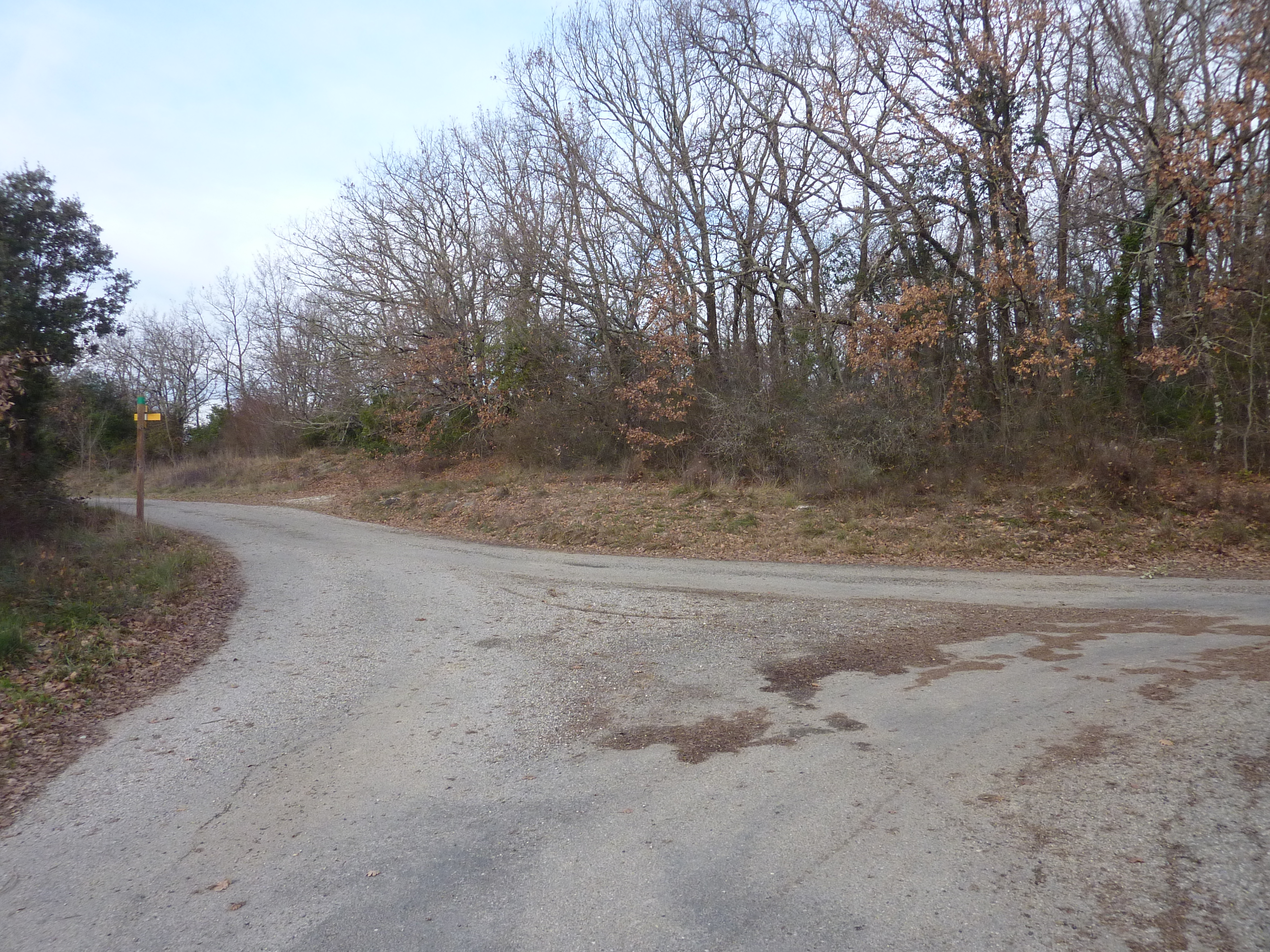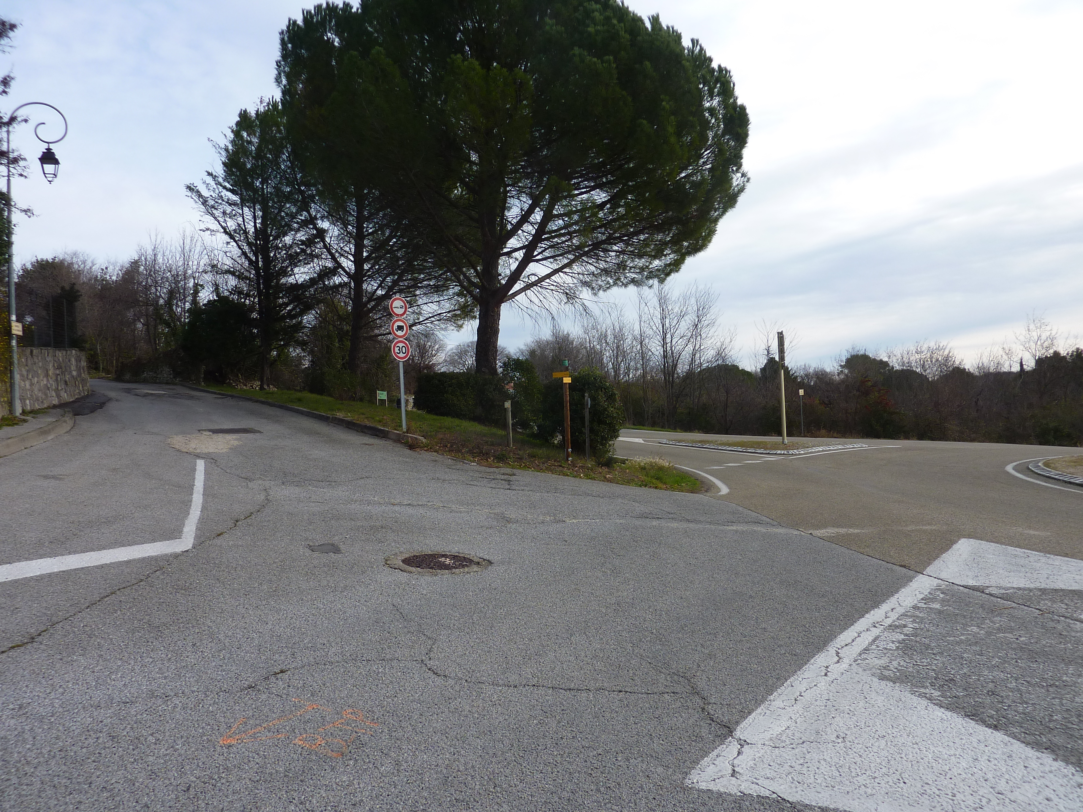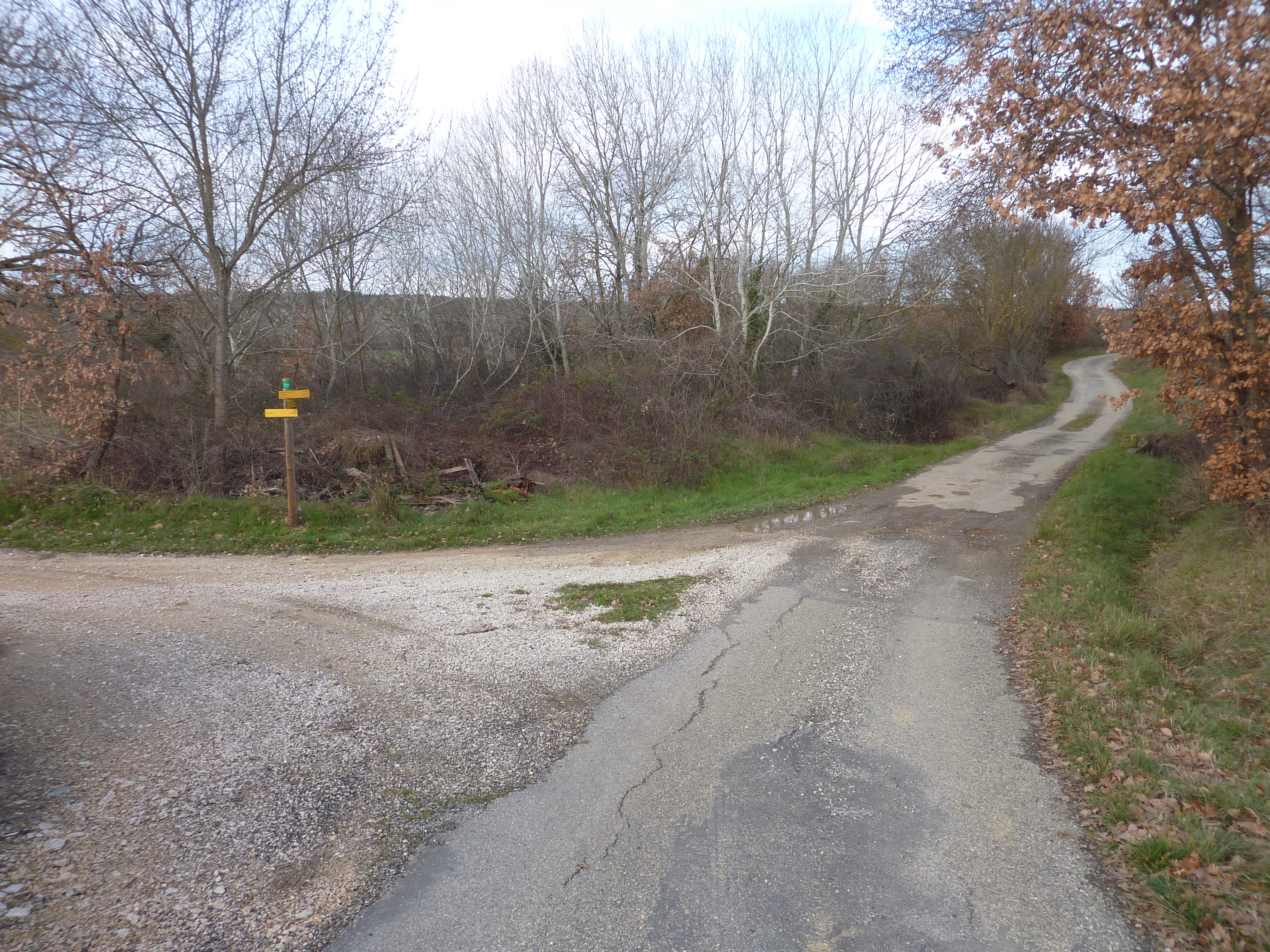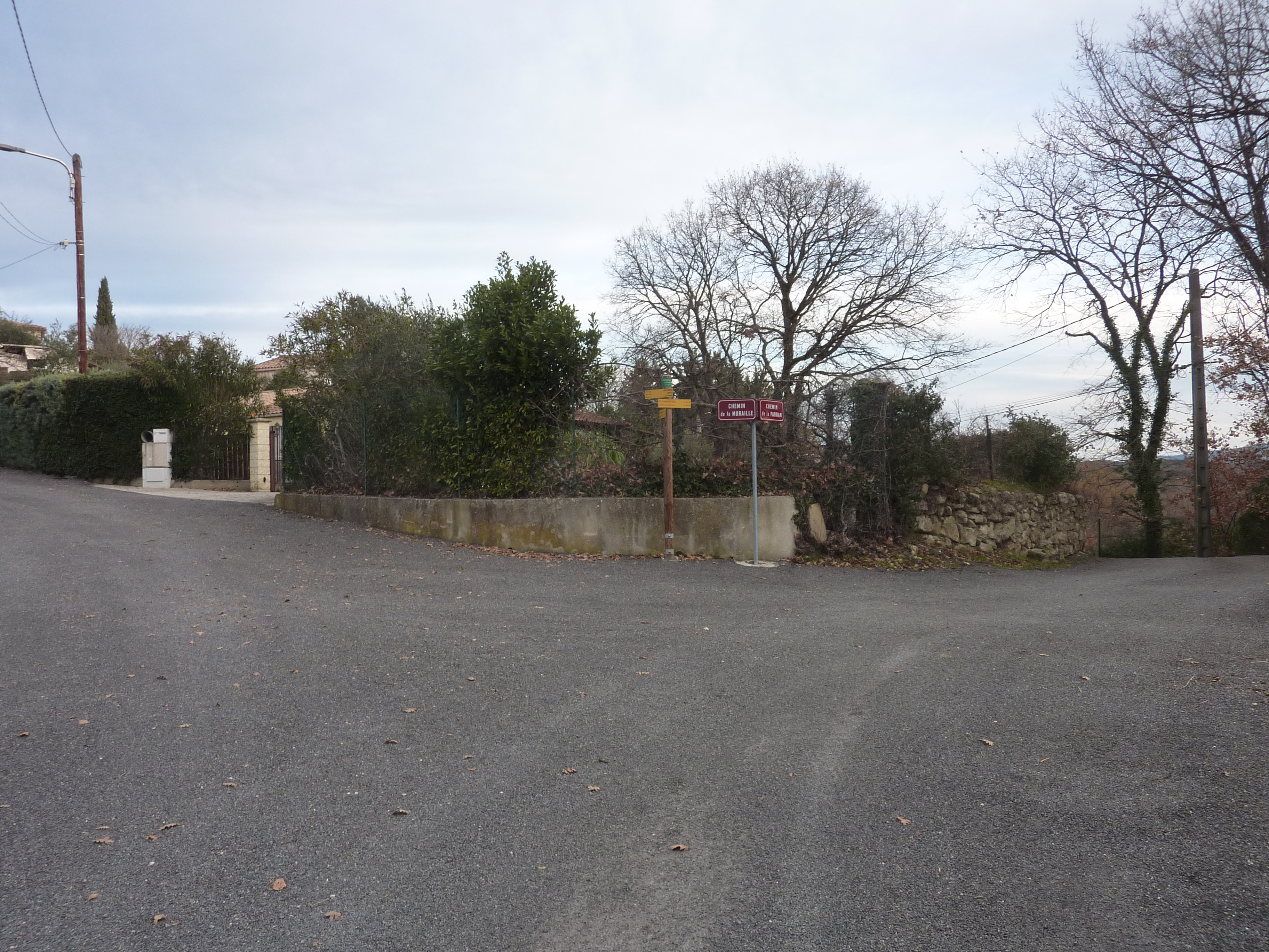 A ce croisement avec une route (400 mètres avant l'arrivée), suivre le chemin partant tout droit direction Martignargues, balisé en jaune