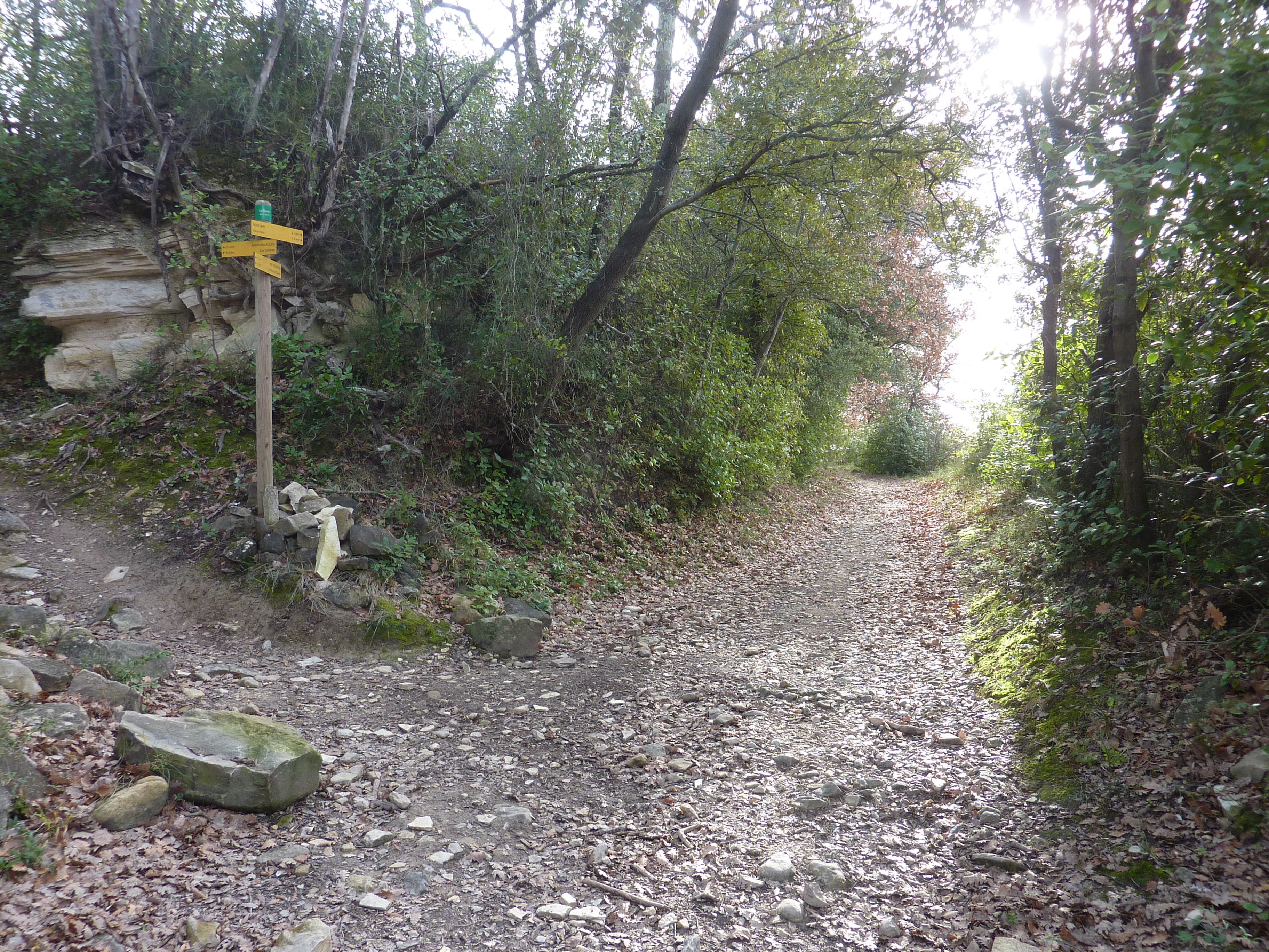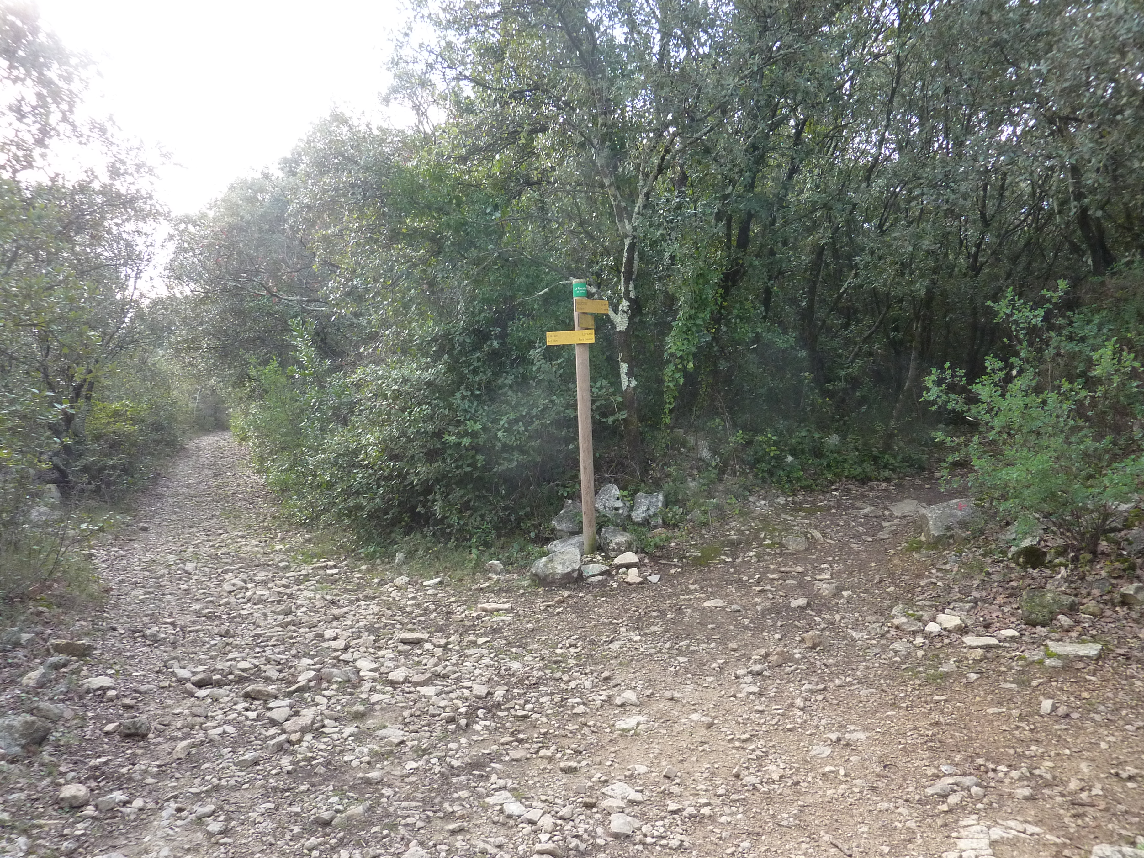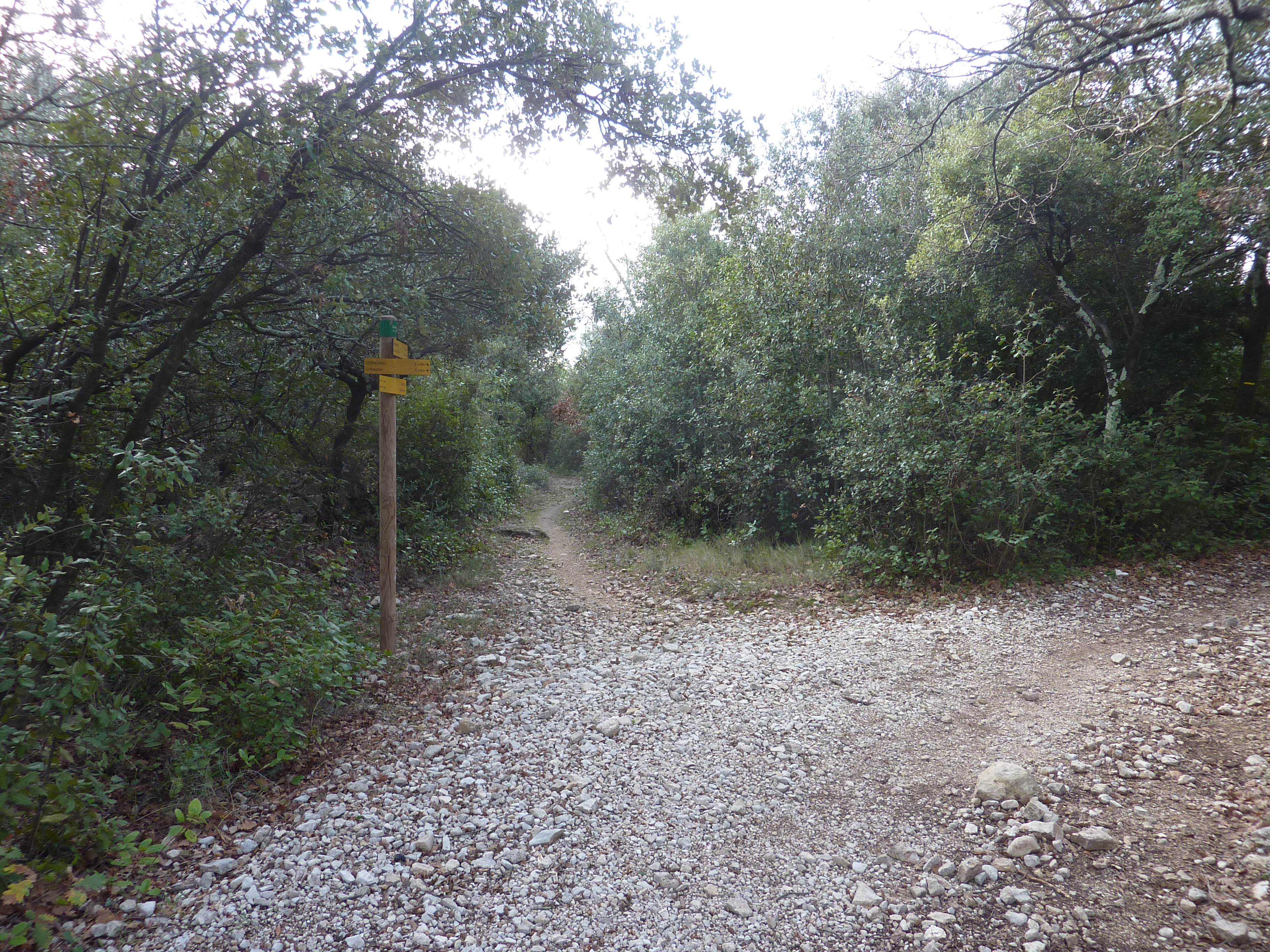 Pateférine (211 m) : suivre le large chemin partant sur la gauche direction Vézénobres, balisé en rouge et blanc, et en jaune dorénavant