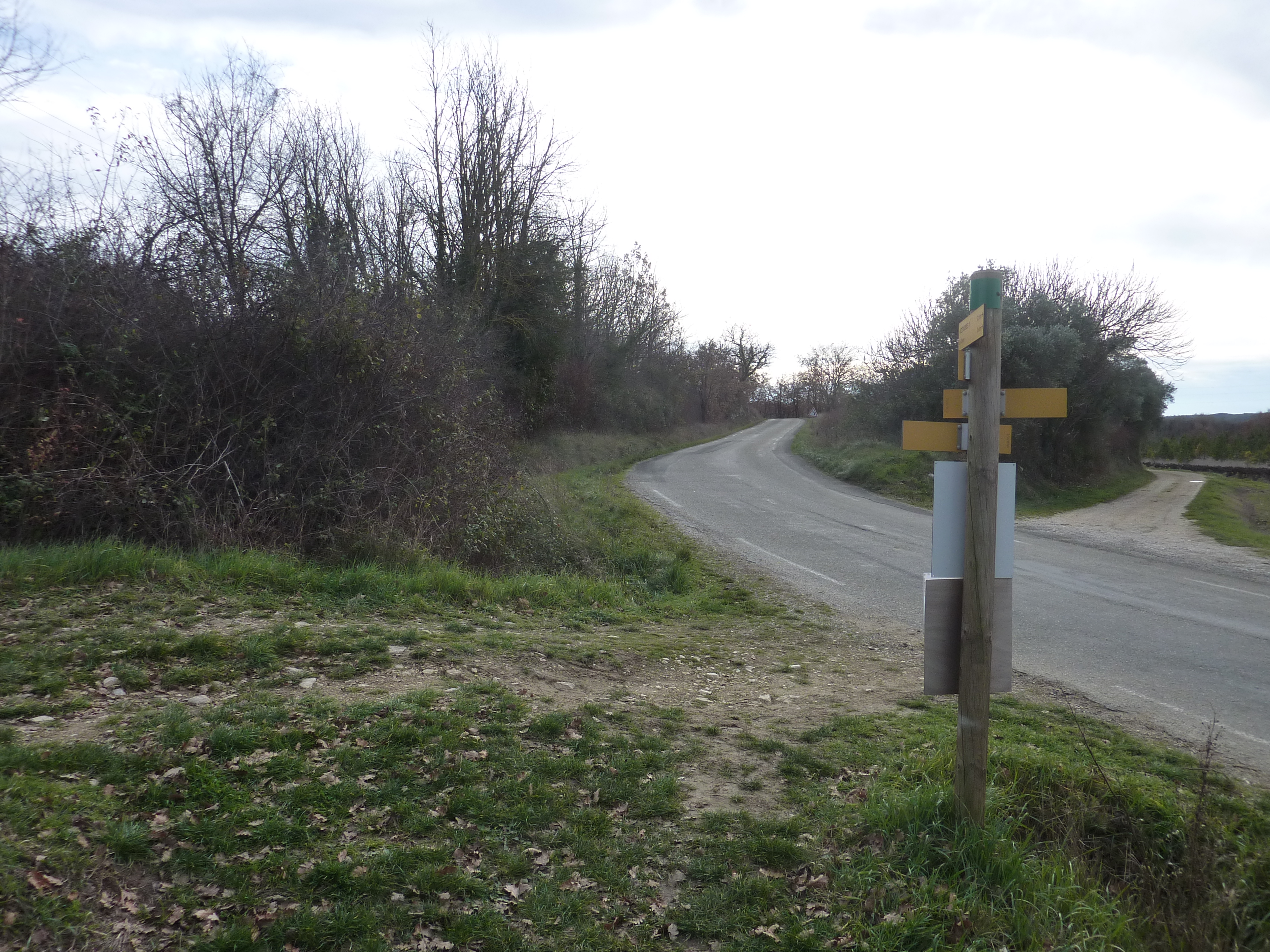 Vacaresse (131 m) : suivre le chemin partant sur la gauche direction Martignargues, balisé uniquement en jaune dorénavant