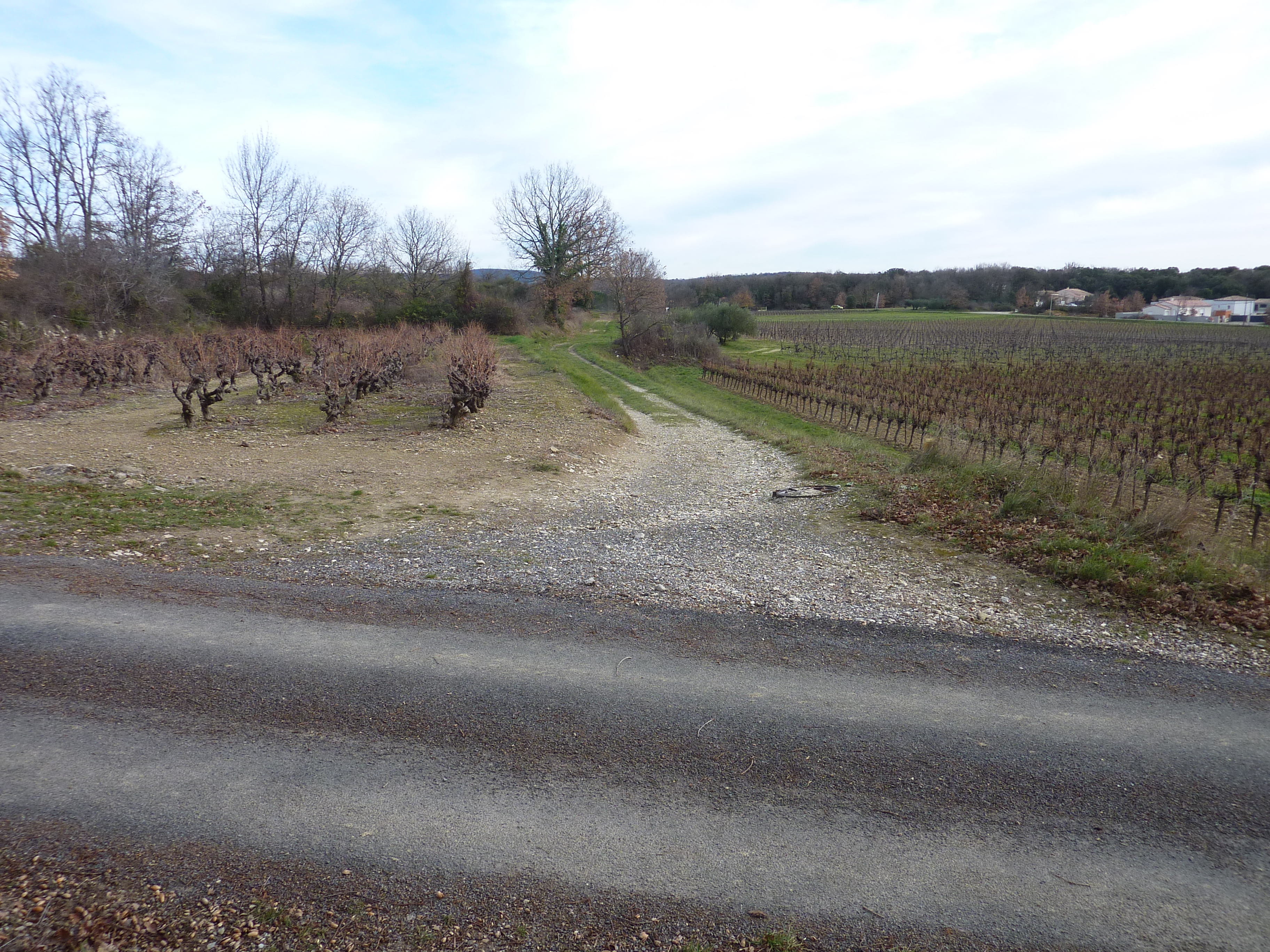 A cette intersection (500 mètres après la précédente) (127 m), suivre la route partant sur la gauche puis le large chemin partant sur la droite 20 mètres après direction Martignargues, balisé en rouge et blanc, et en jaune
