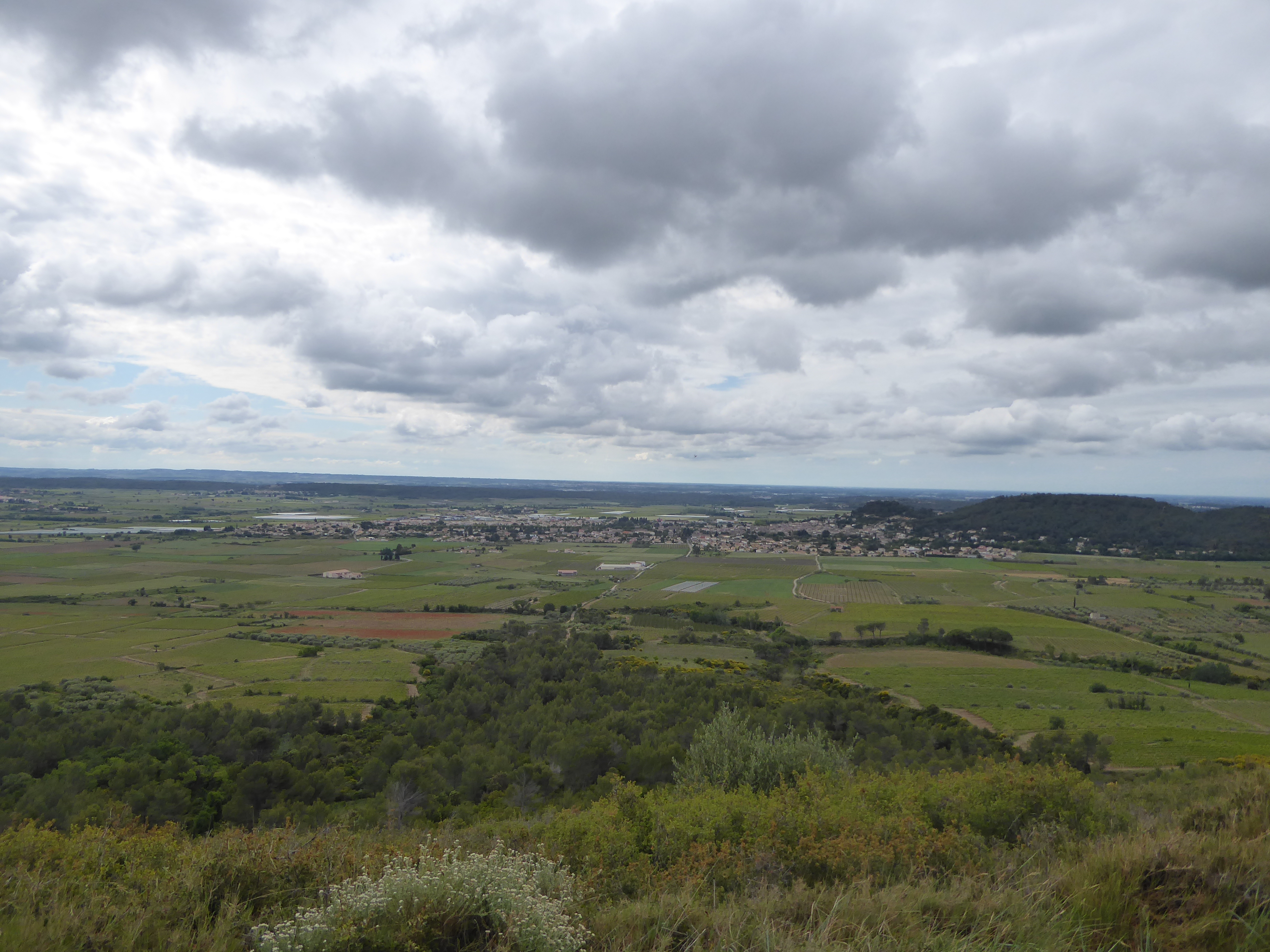 Arrivée au sommet de la Liquière (211 m) : belle vue sur la plaine du Vaunage et les différentes communes qui la composent ... la vue vers les Cévennes est bouchée par la végétation sommitale !