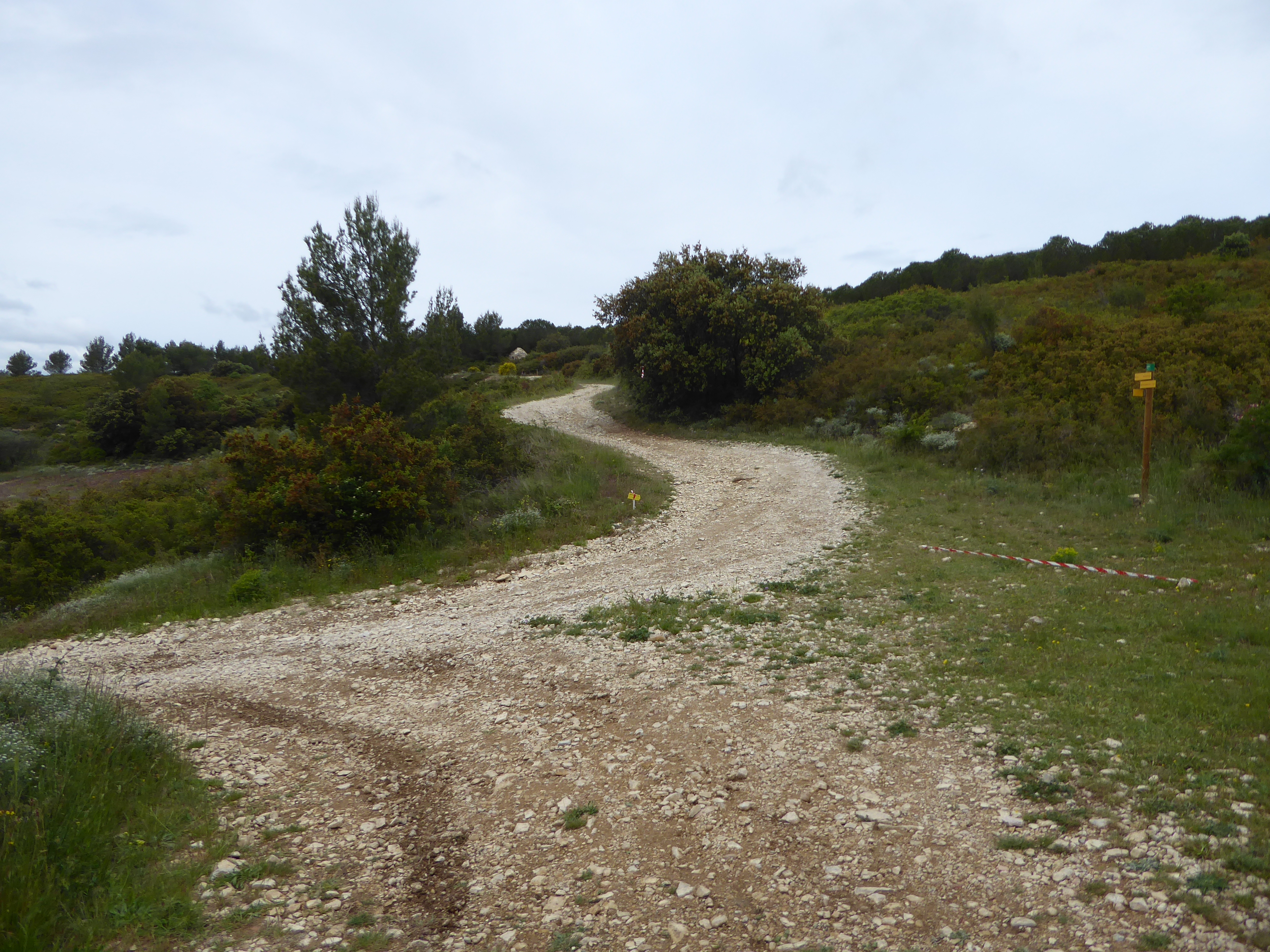 A ce croisement (150 mètres après le Roc de Gachone), suivre le chemin partant sur la gauche direction Calvisson, balisé en jaune (bien suivre les balises jaunes sur le parcours sportif)