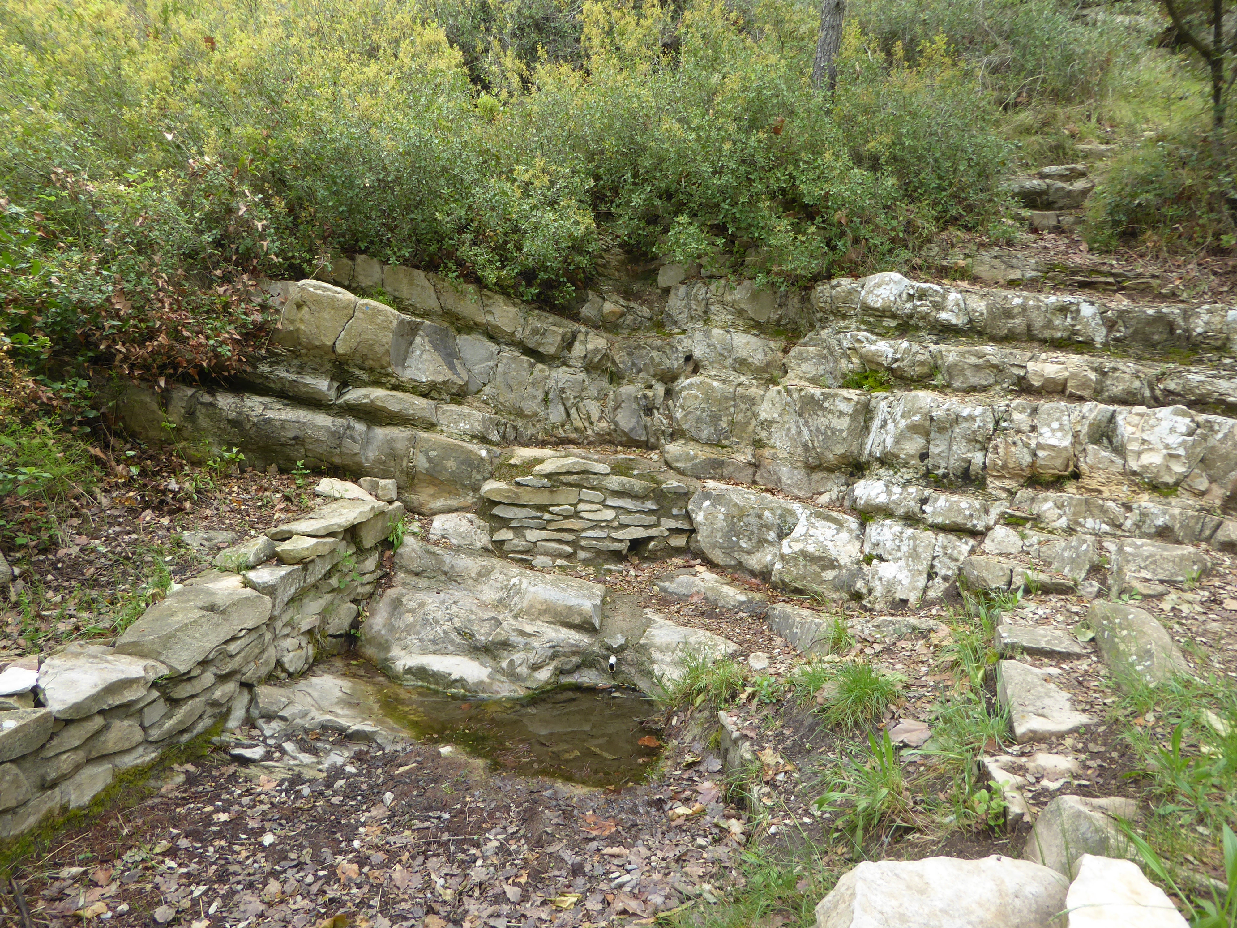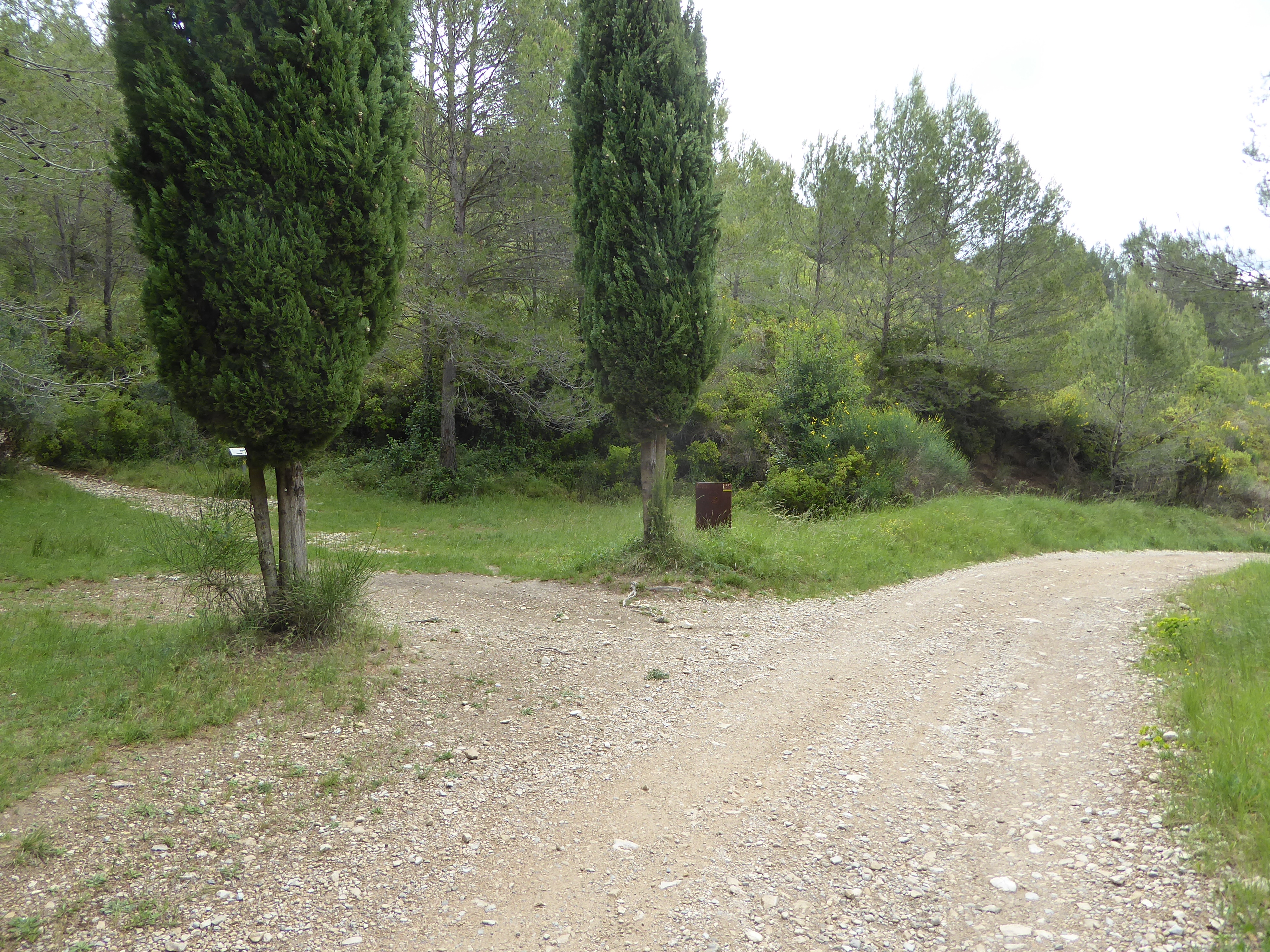 A ce croisement marqué par deux cyprès (150 mètres après la Queyrolle), suivre le chemin partant sur la gauche direction Source de Font de Coucou, aucun balisage dorénavant (pour ceux qui ne veulent pas visiter la source, continuer à suivre la piste partant légèrement sur la droite)