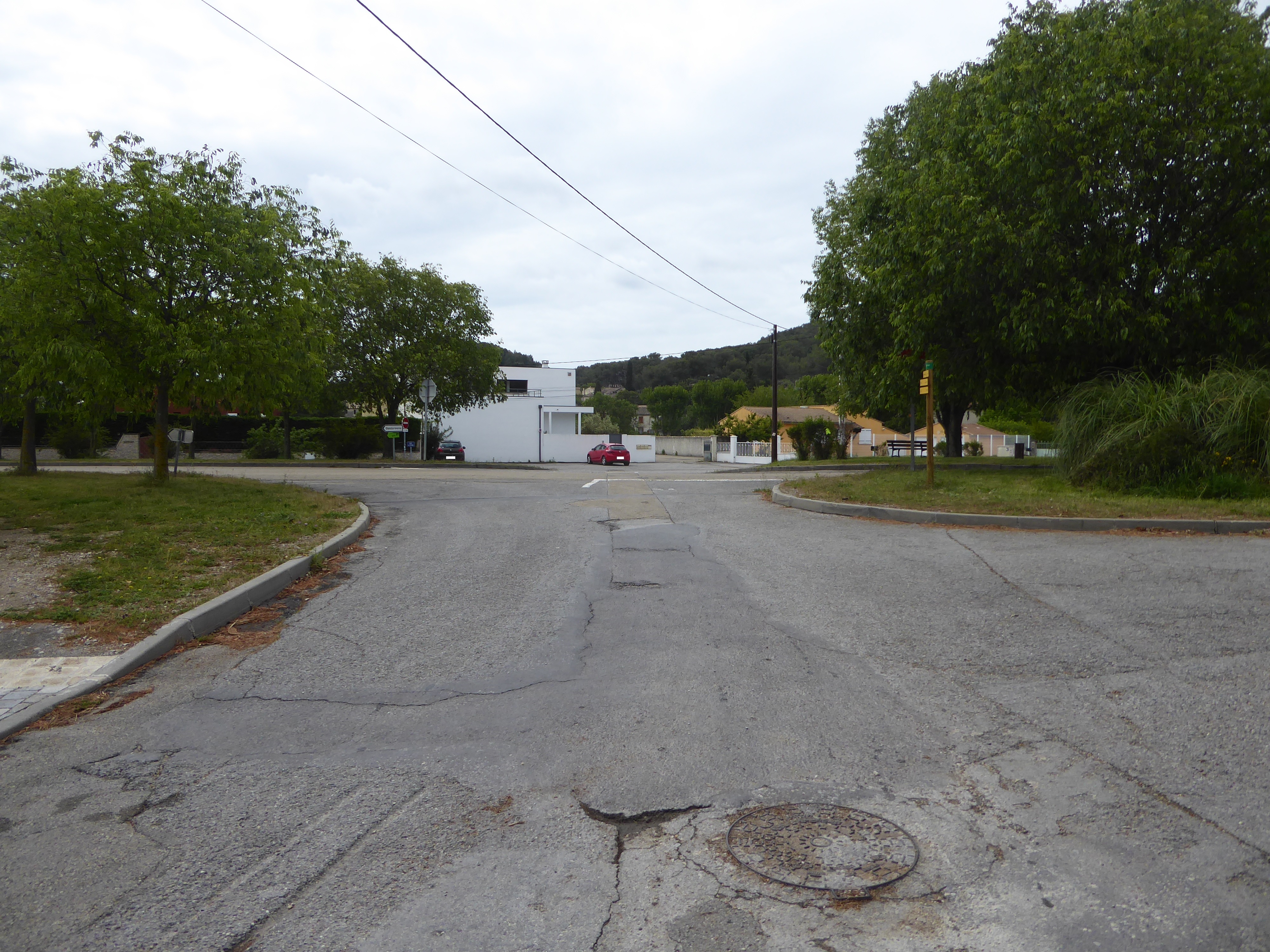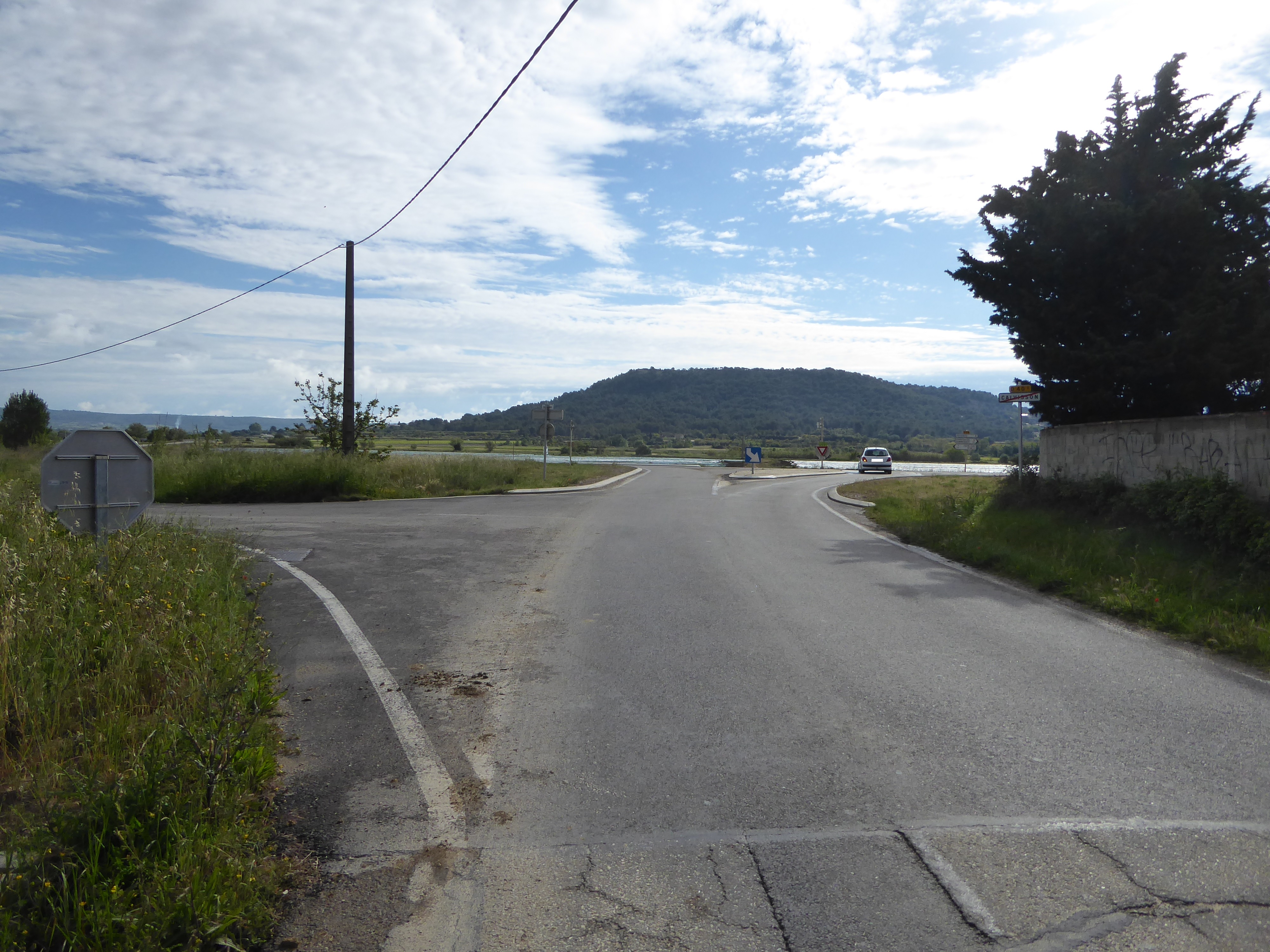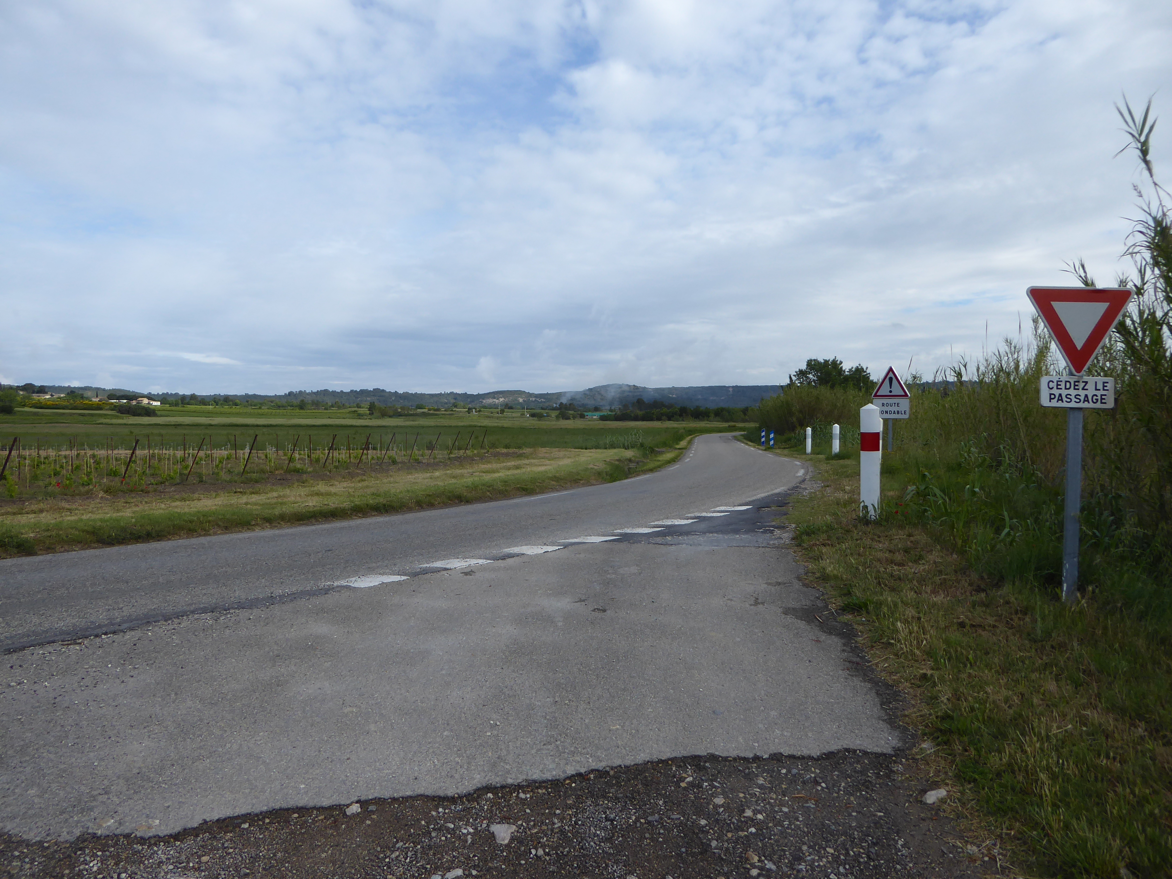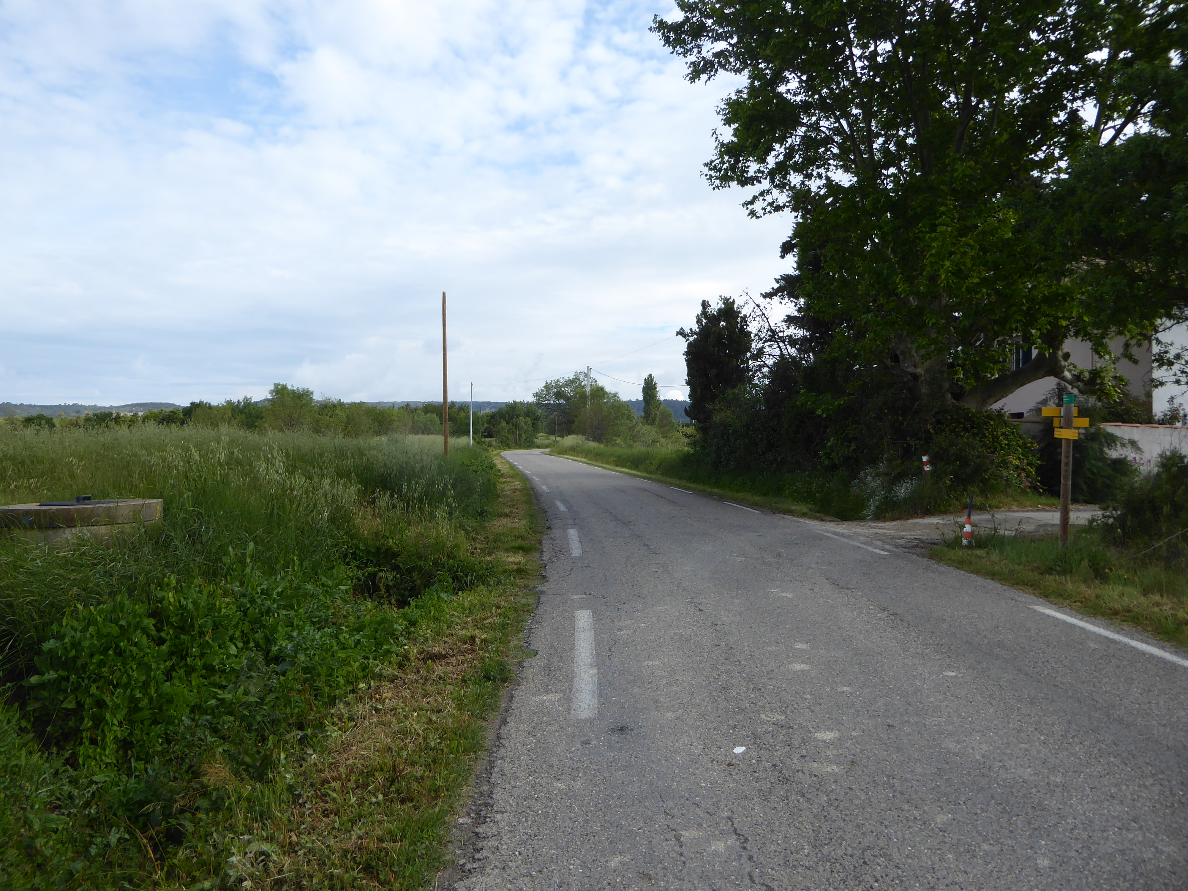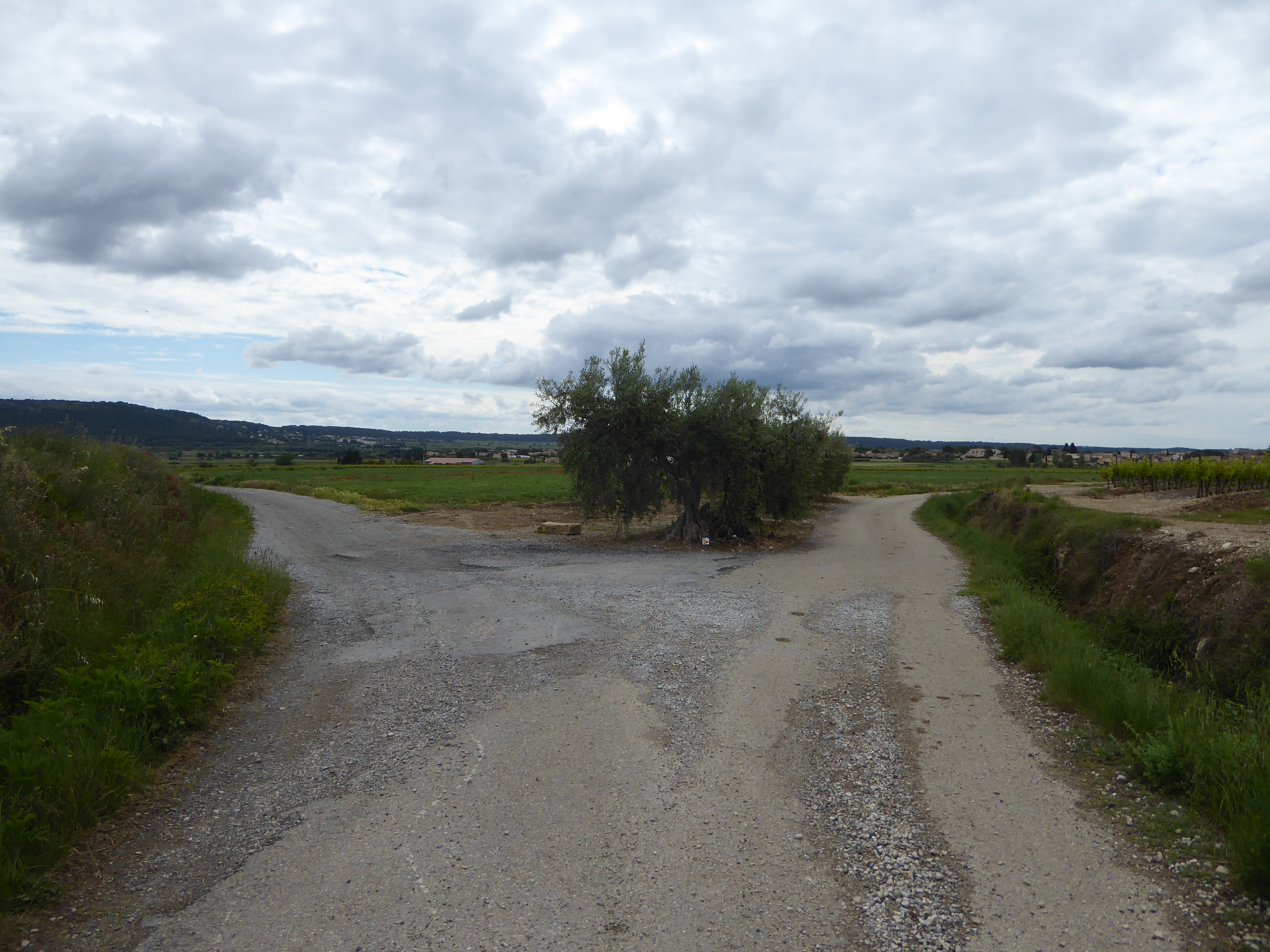 A ce croisement marqué par cet olivier (200 mèters après le lieu-dit "Ournèzes"), suivre la route goudronnée partant légèrement sur la droite direction Calvisson, balisé sporadiquement en jaune