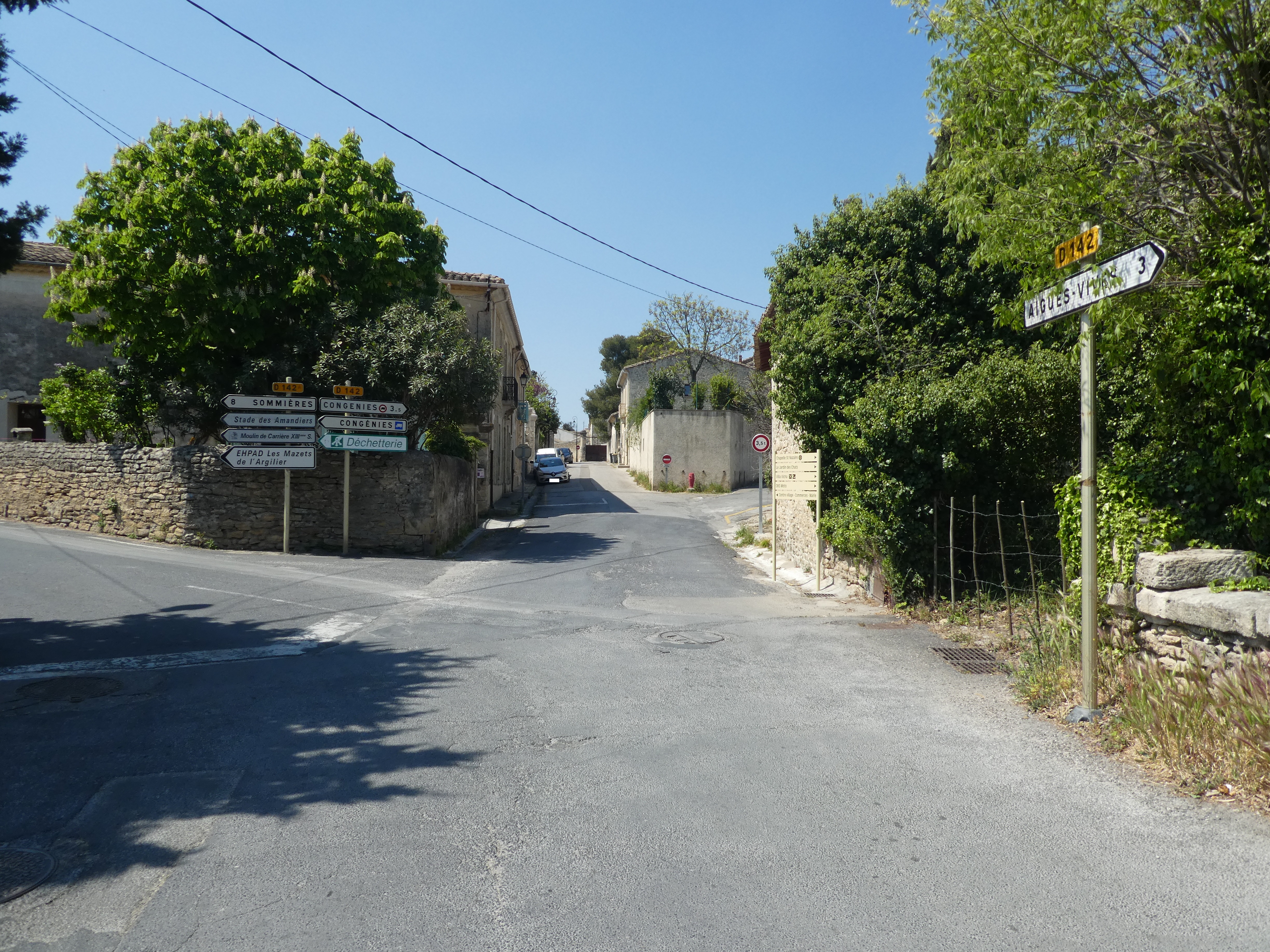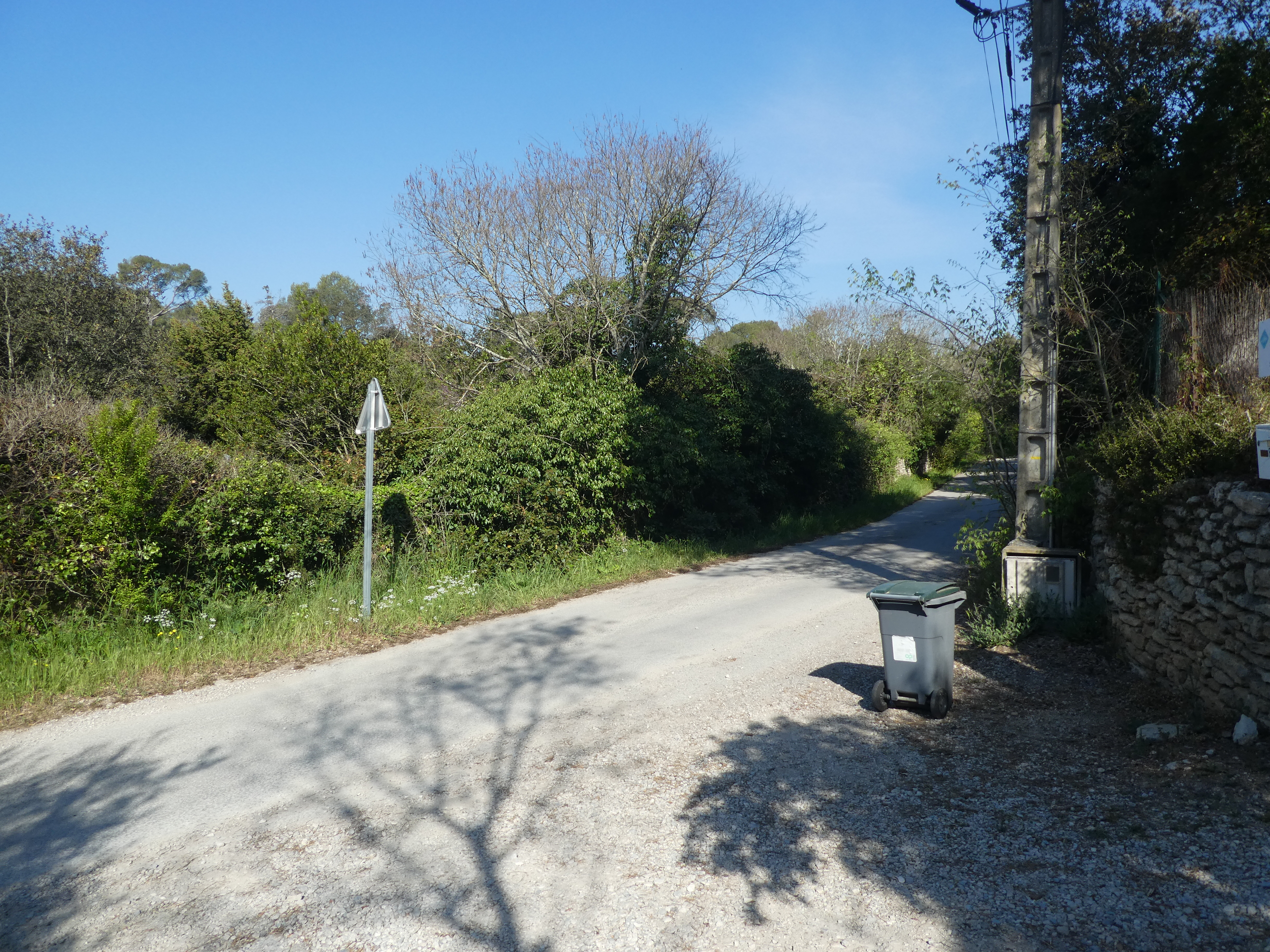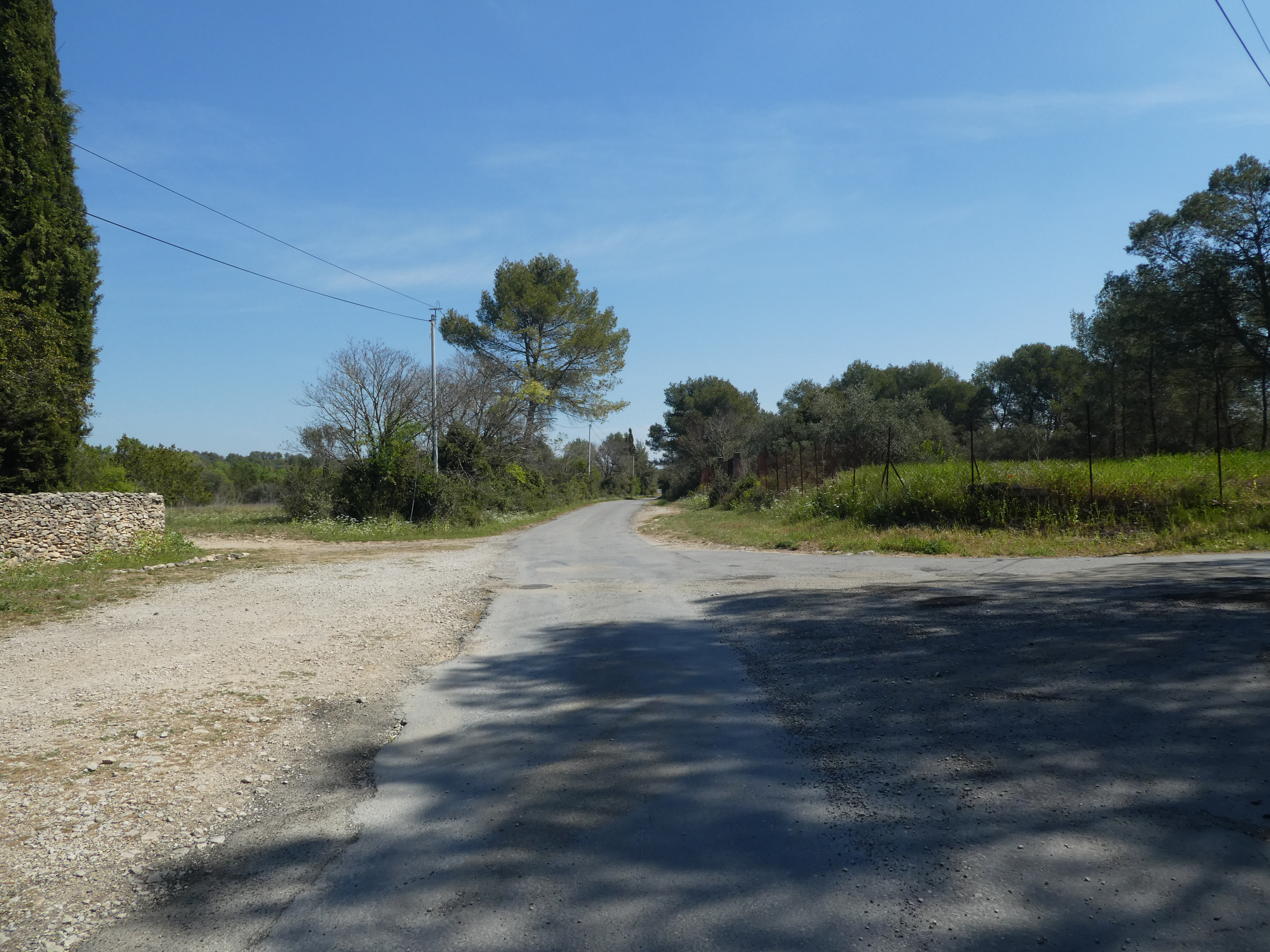 A cette intersection (500 mètres après le lieu-dit "Chapelle Saint-Nazaire"), suivre la route partant sur la gauche direction Aubais - Mairie