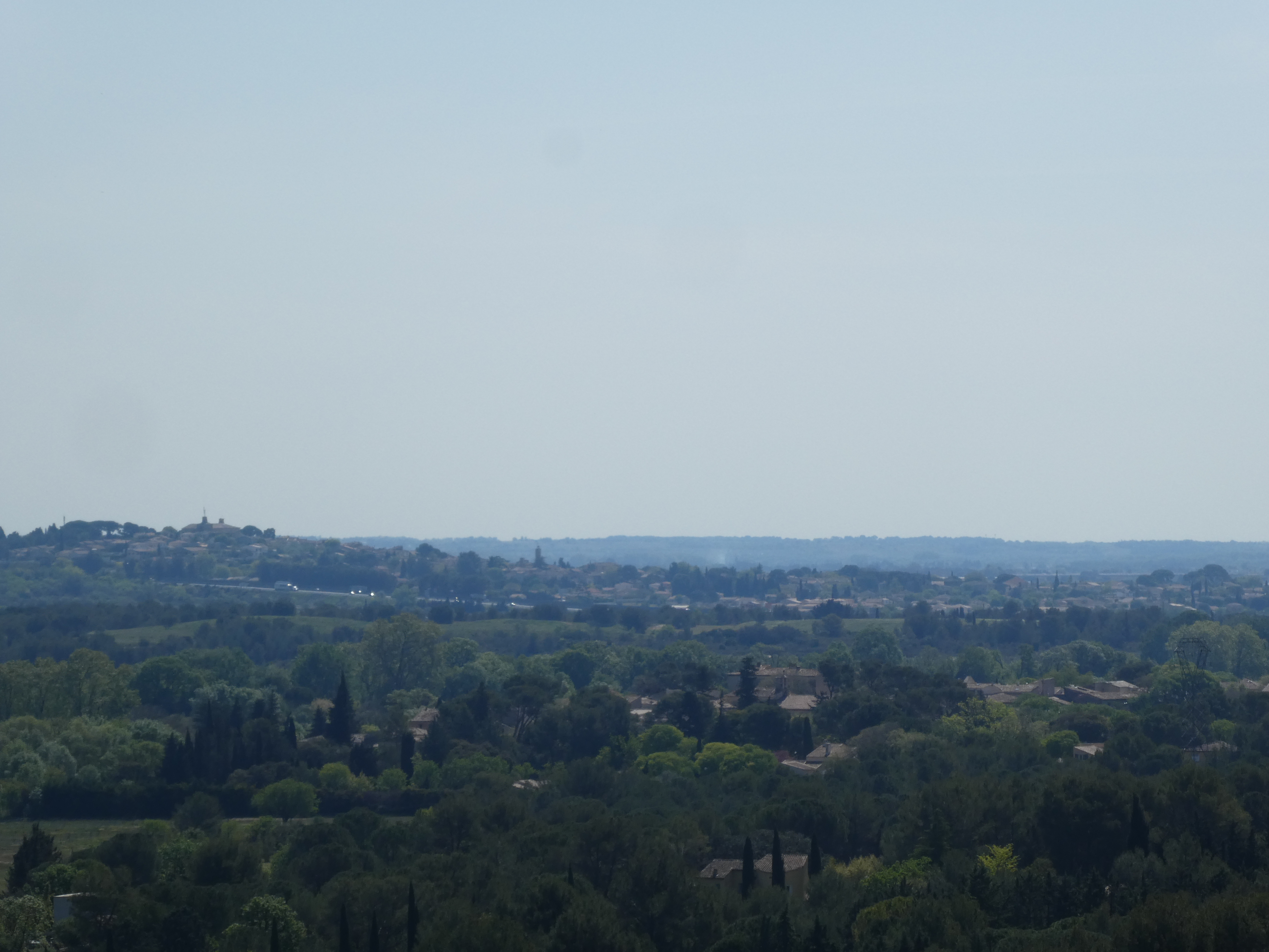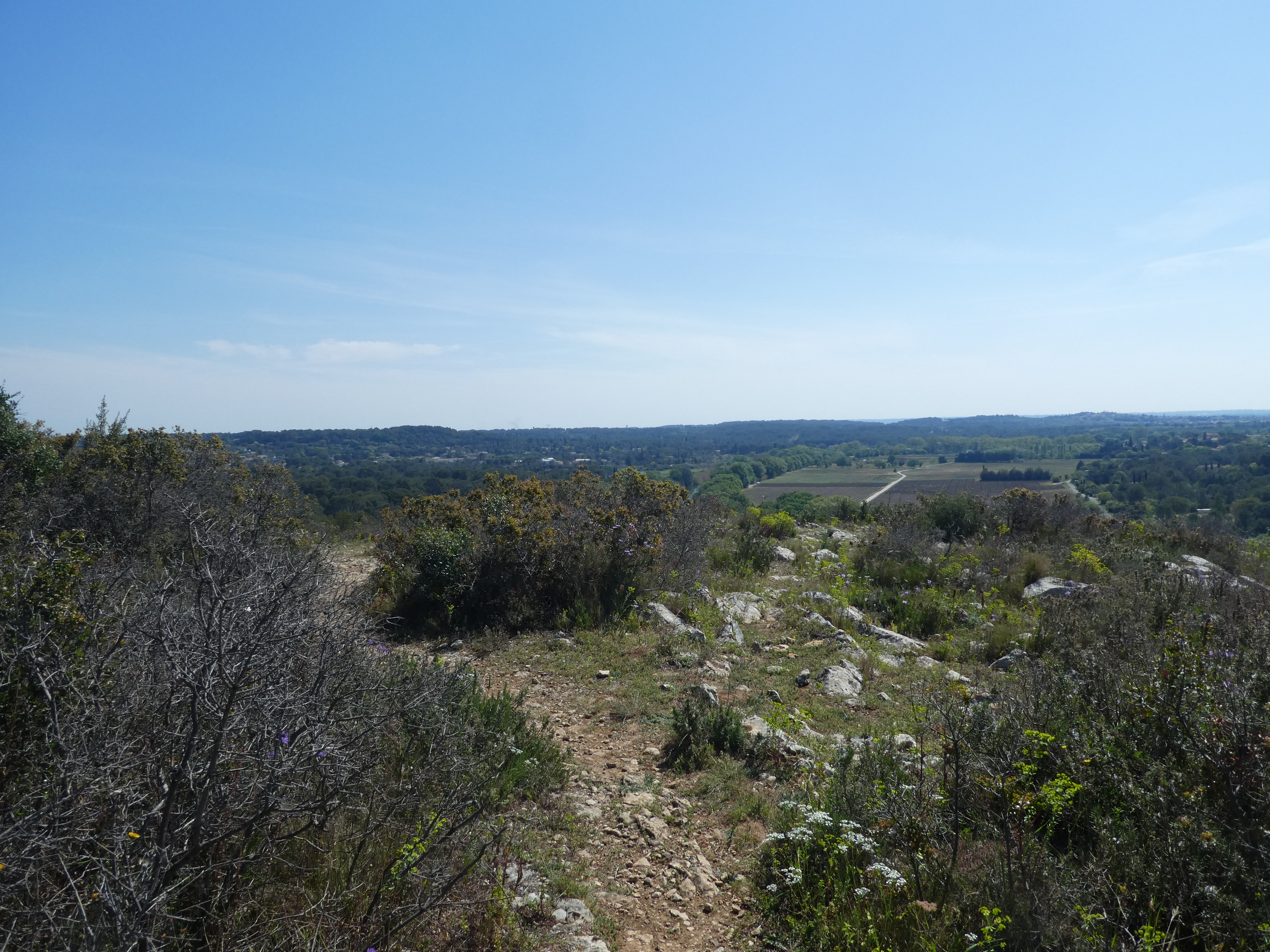 Arrivée au sommet de la Roque d'Aubais (67 m) : belle vue sur la Moyenne et Basse Vallée du Vidourle ainsi que sur les villages d'Aubais, Gallargues-le-Monteux, Villetelle, Saturargues et Saint-Sériès