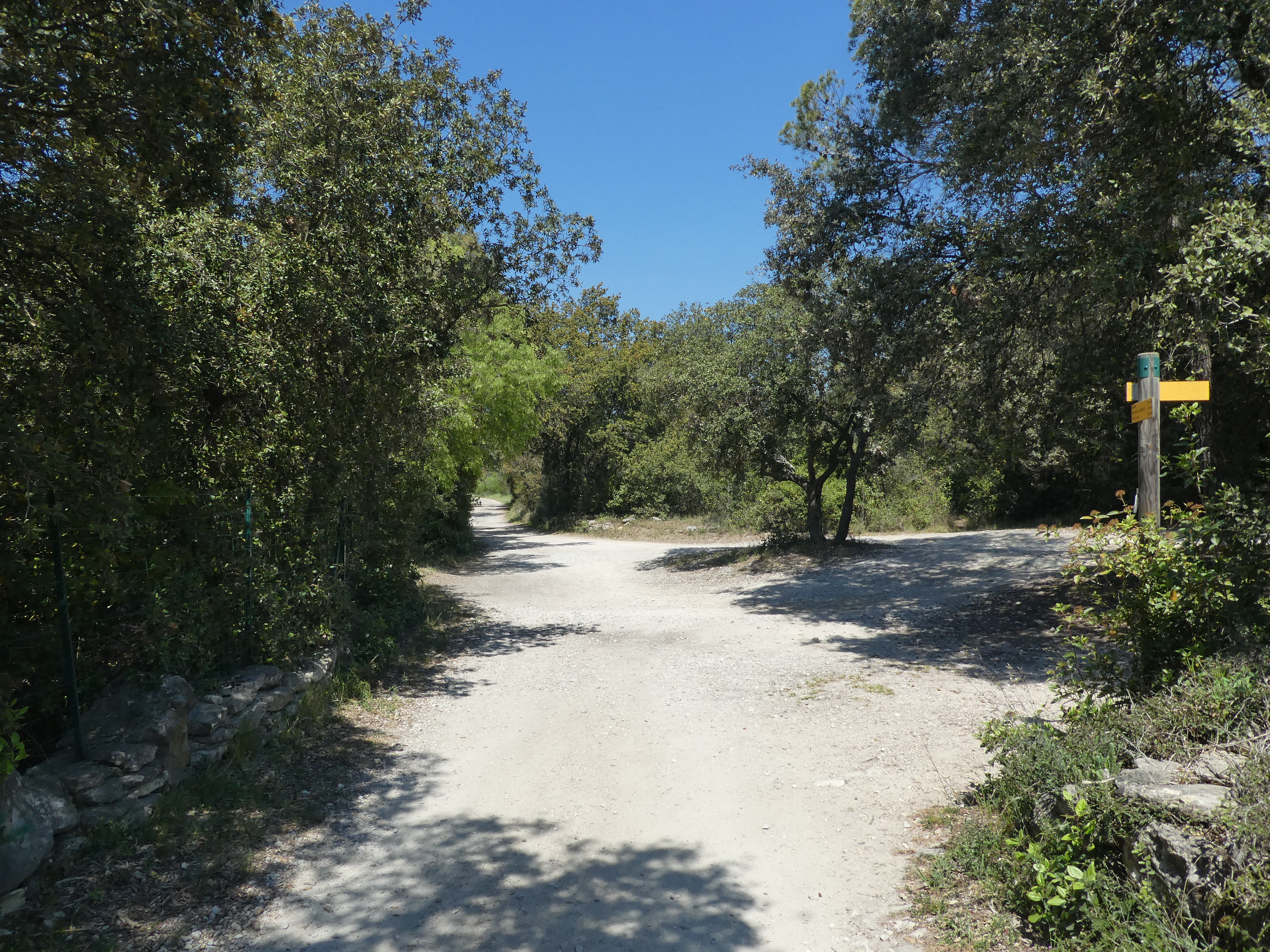 A ce croisement avec le chemin balisé en jaune venant du lieu-dit "la Roque d'Aubais" (300 mètres après avoir quitté le sommet), suivre ce dernier sur la gauche direction la Roque d'Aubais, balisé en jaune dorénavant