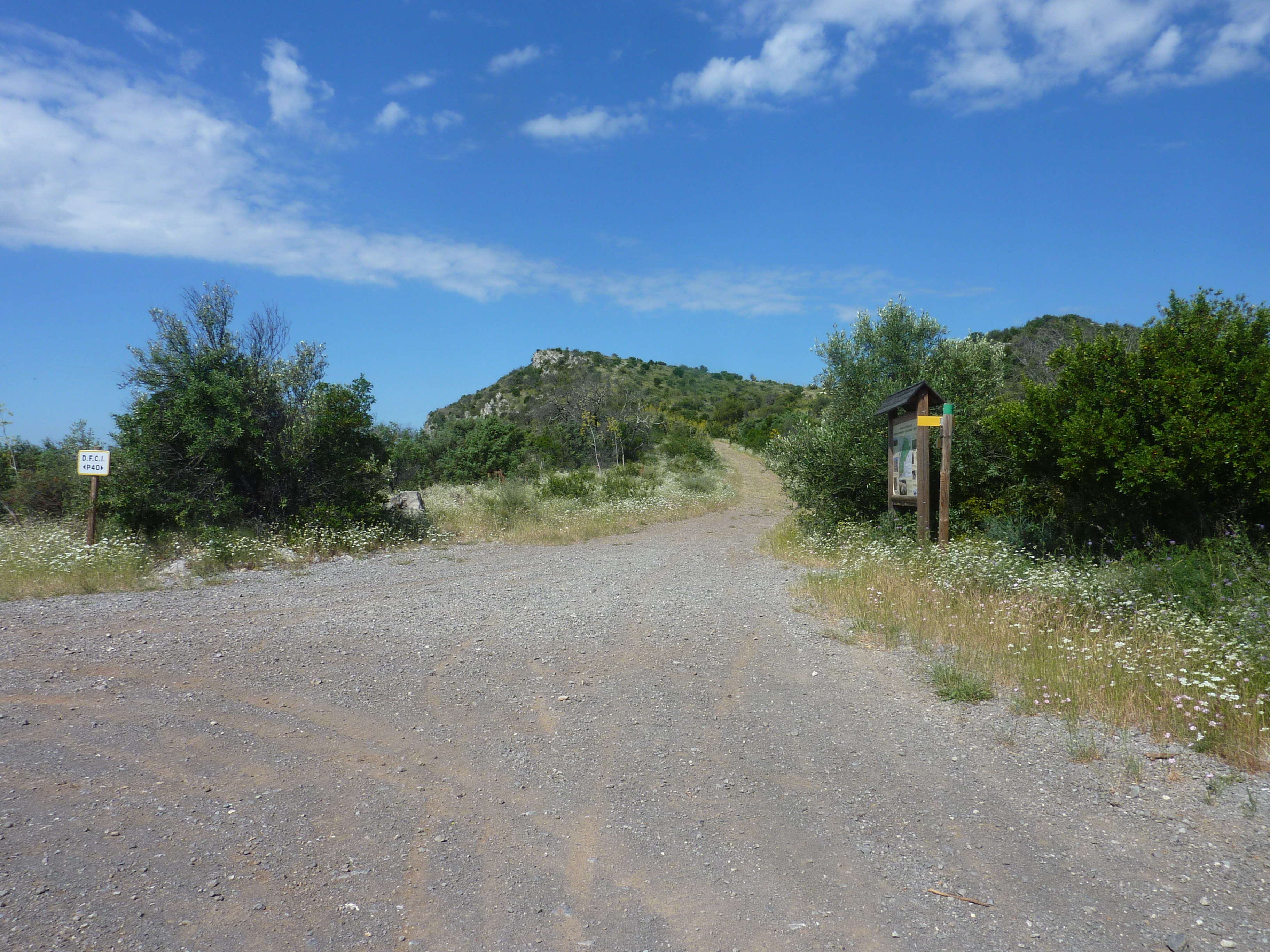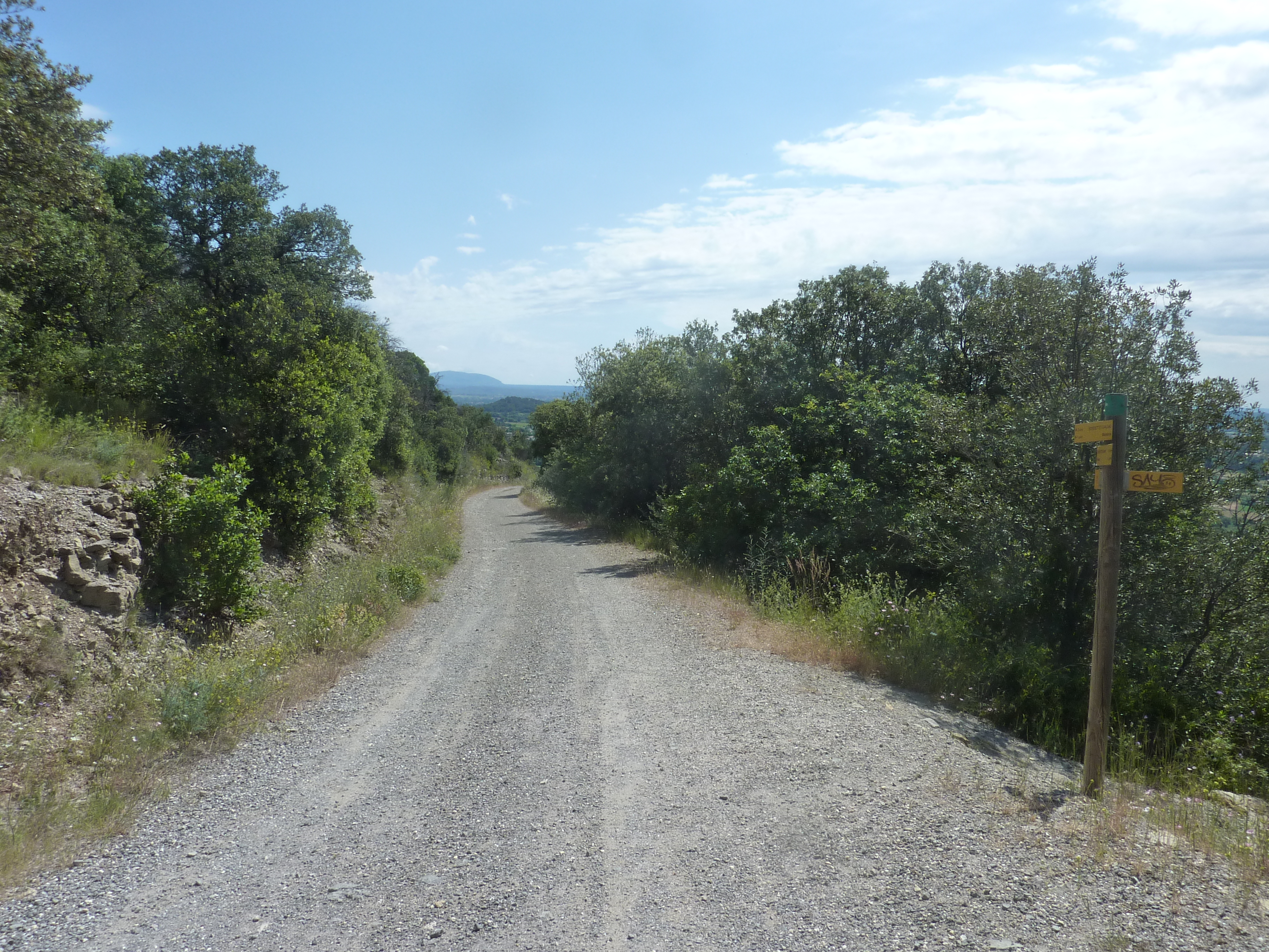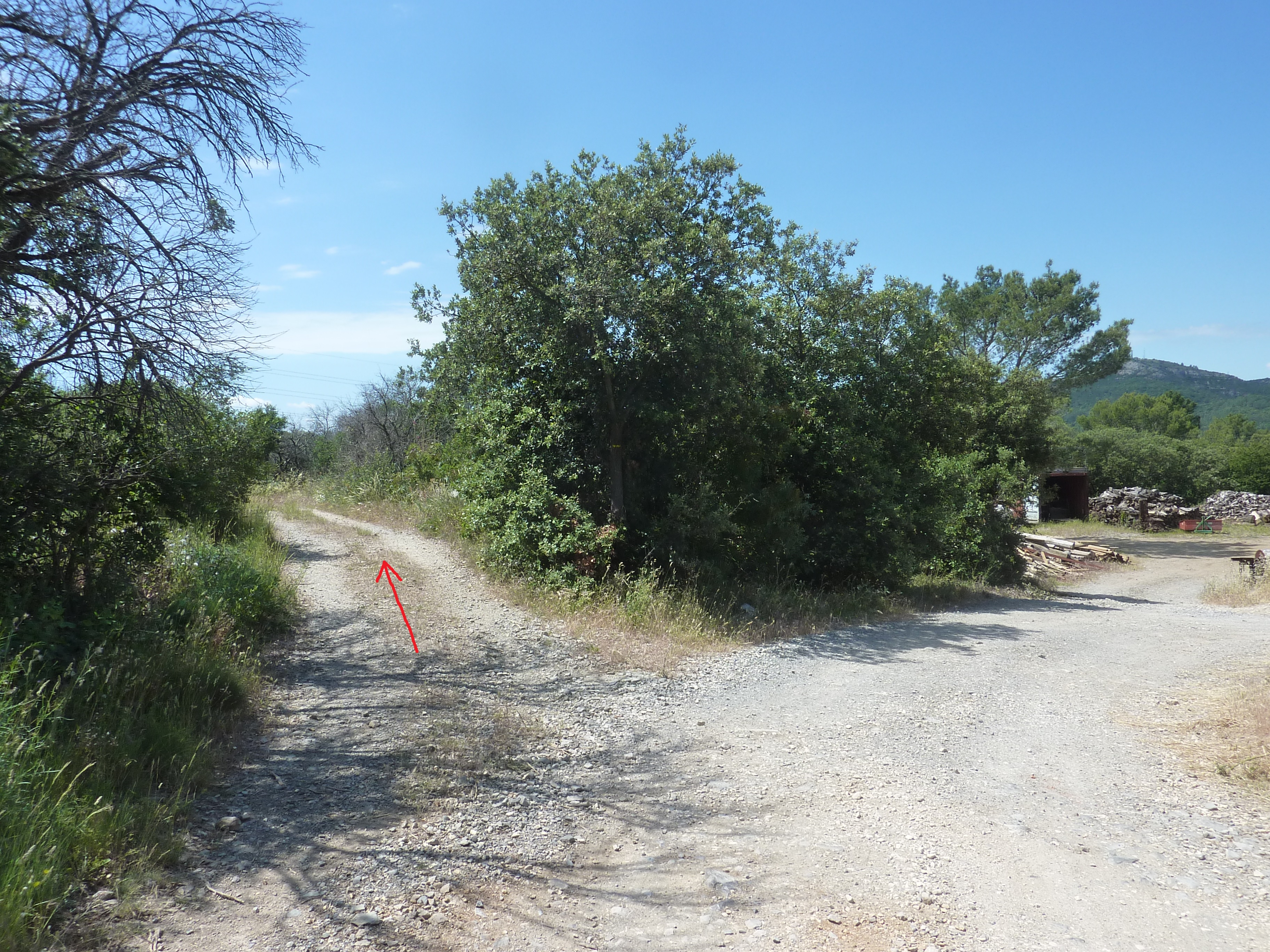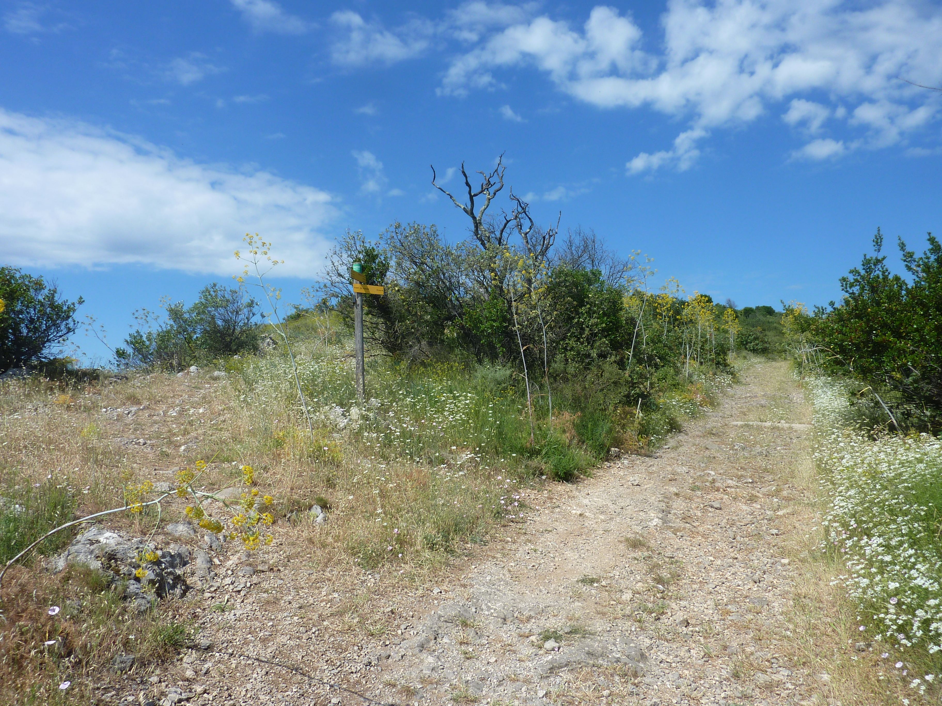 A ce croisement (550 mètres après le lieu-dit "L'Arbousset"), suivre le chemin partant légèrement sur la gauche direction Pouillan, balisé en jaune