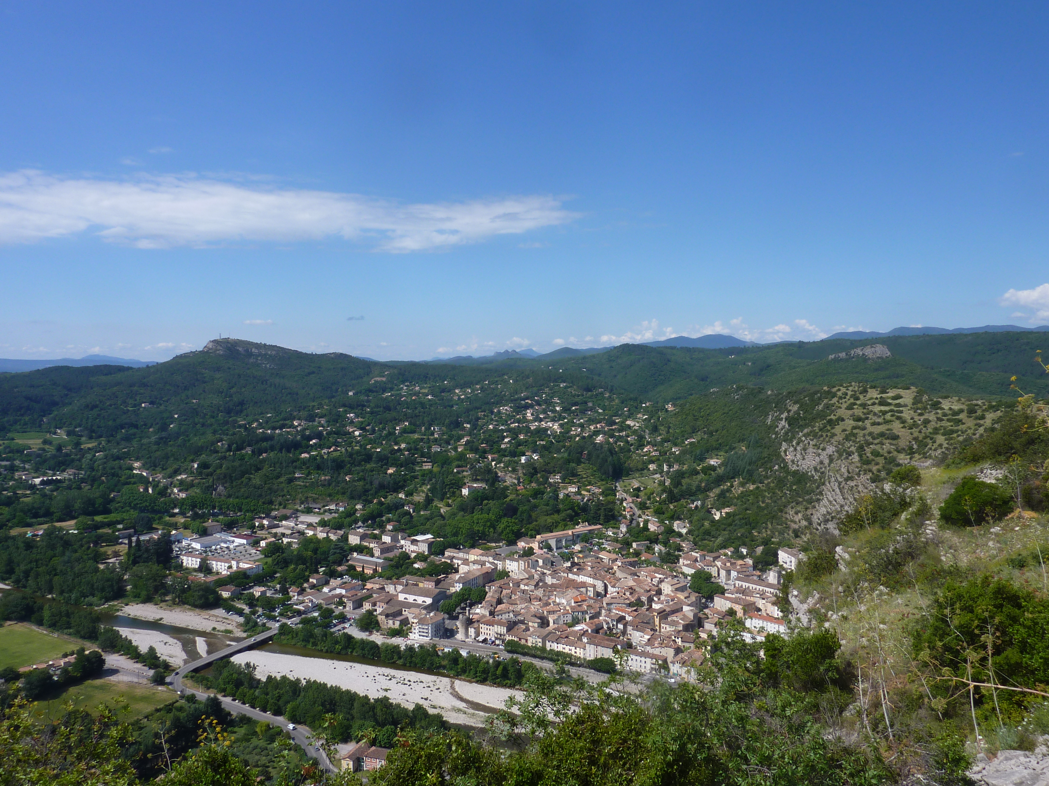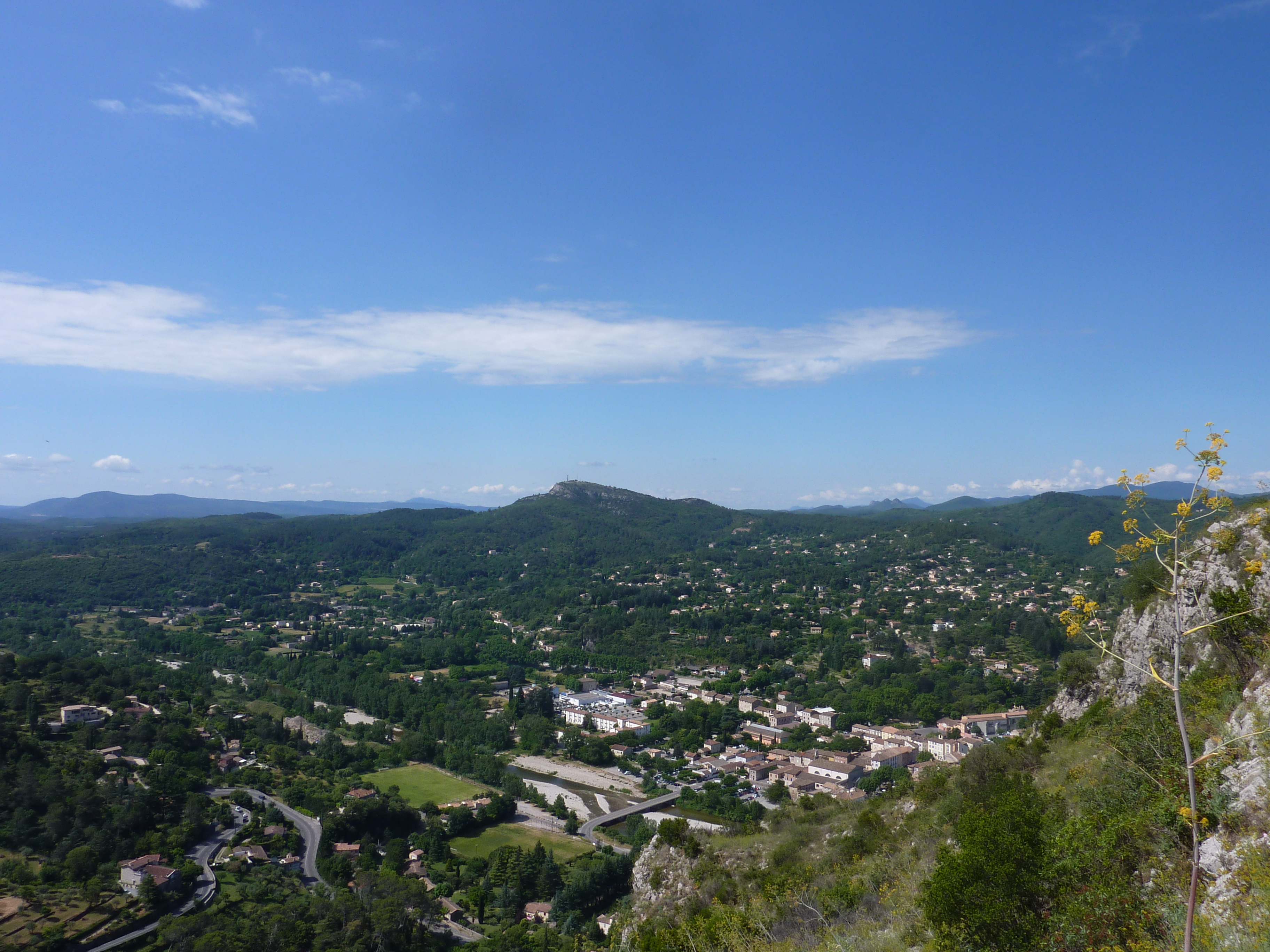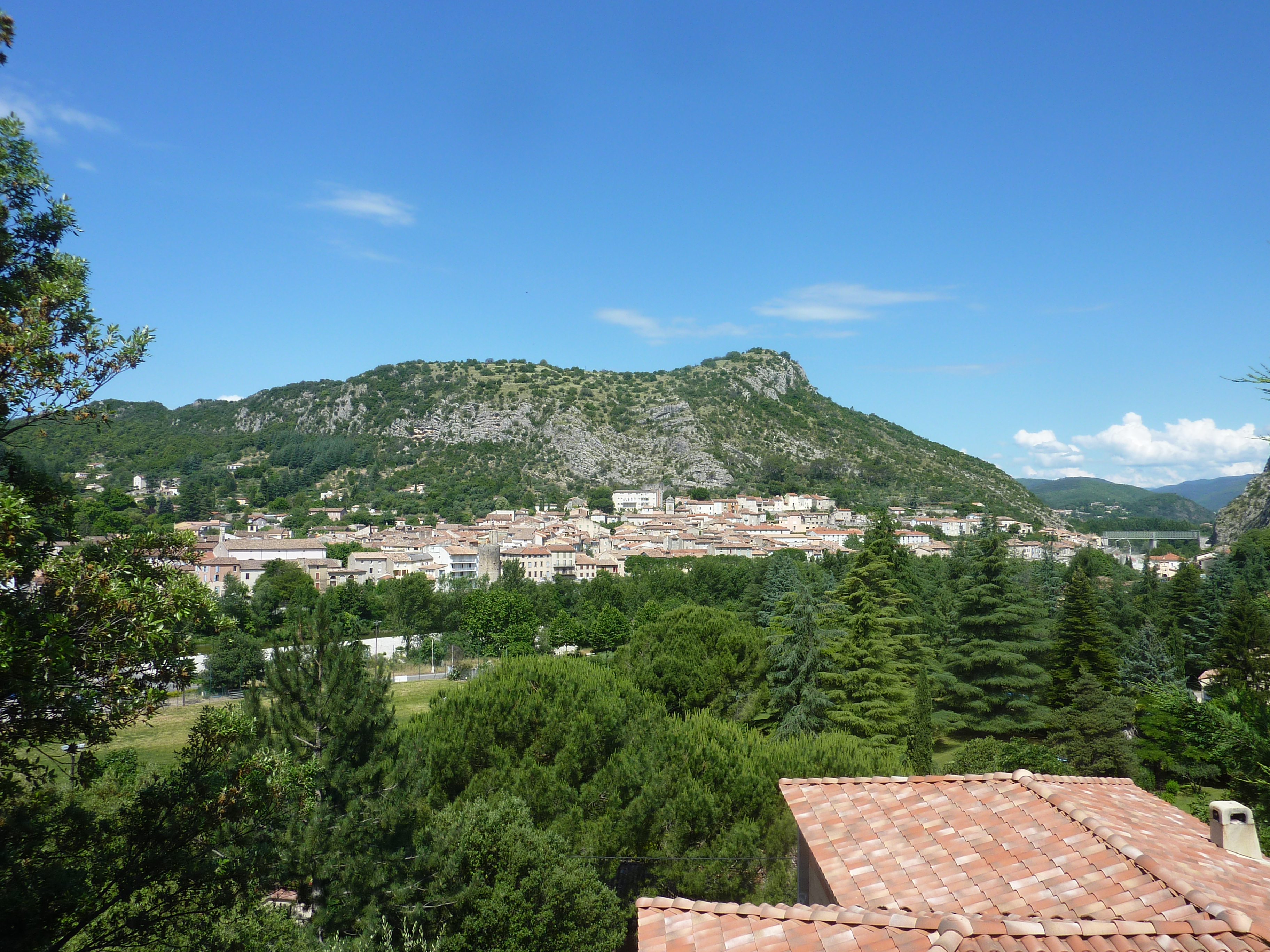Belle vue sur Anduze et le Rocher de Saint-Julien, falaise occidentale de la Porte des Cévennes