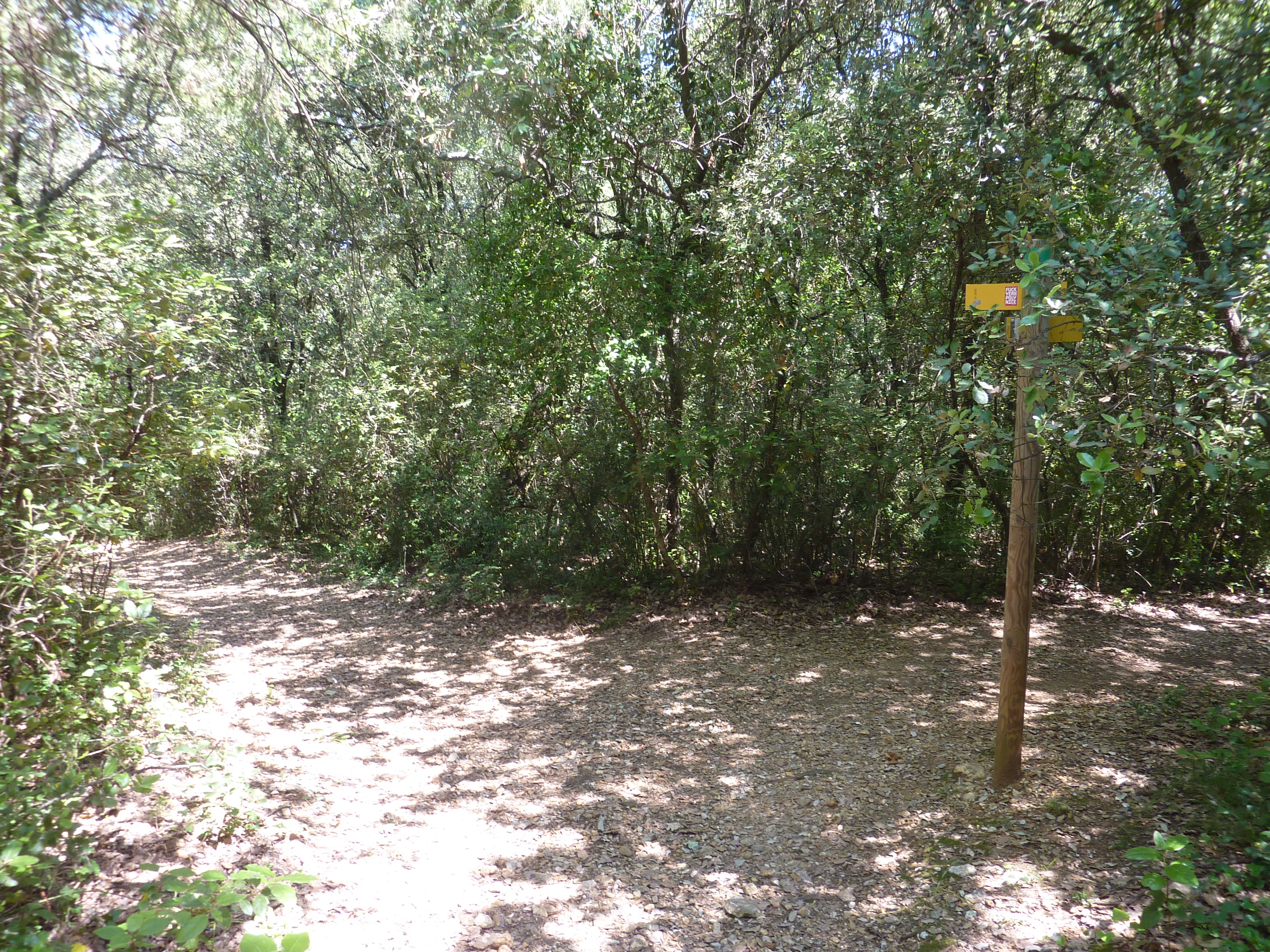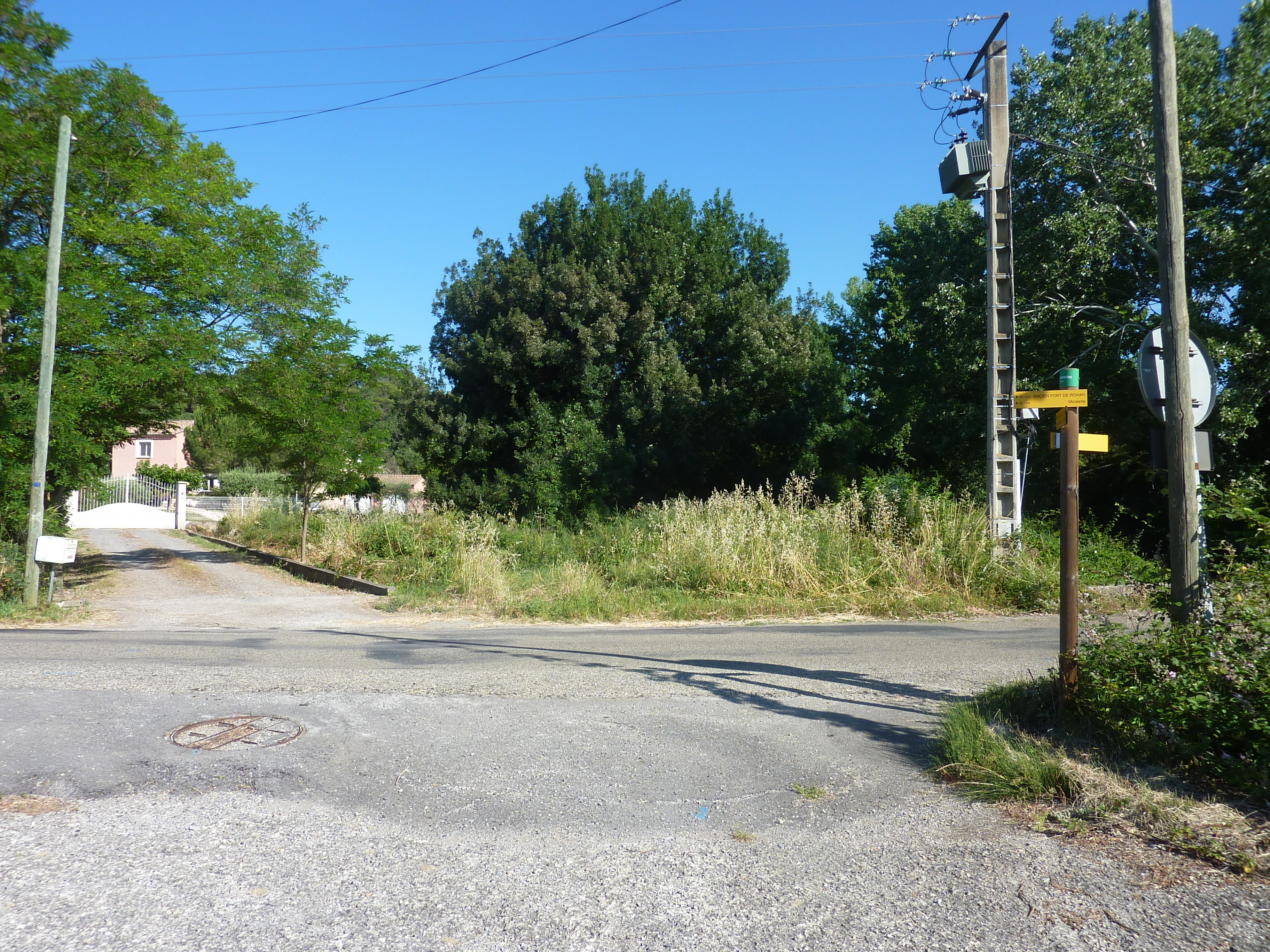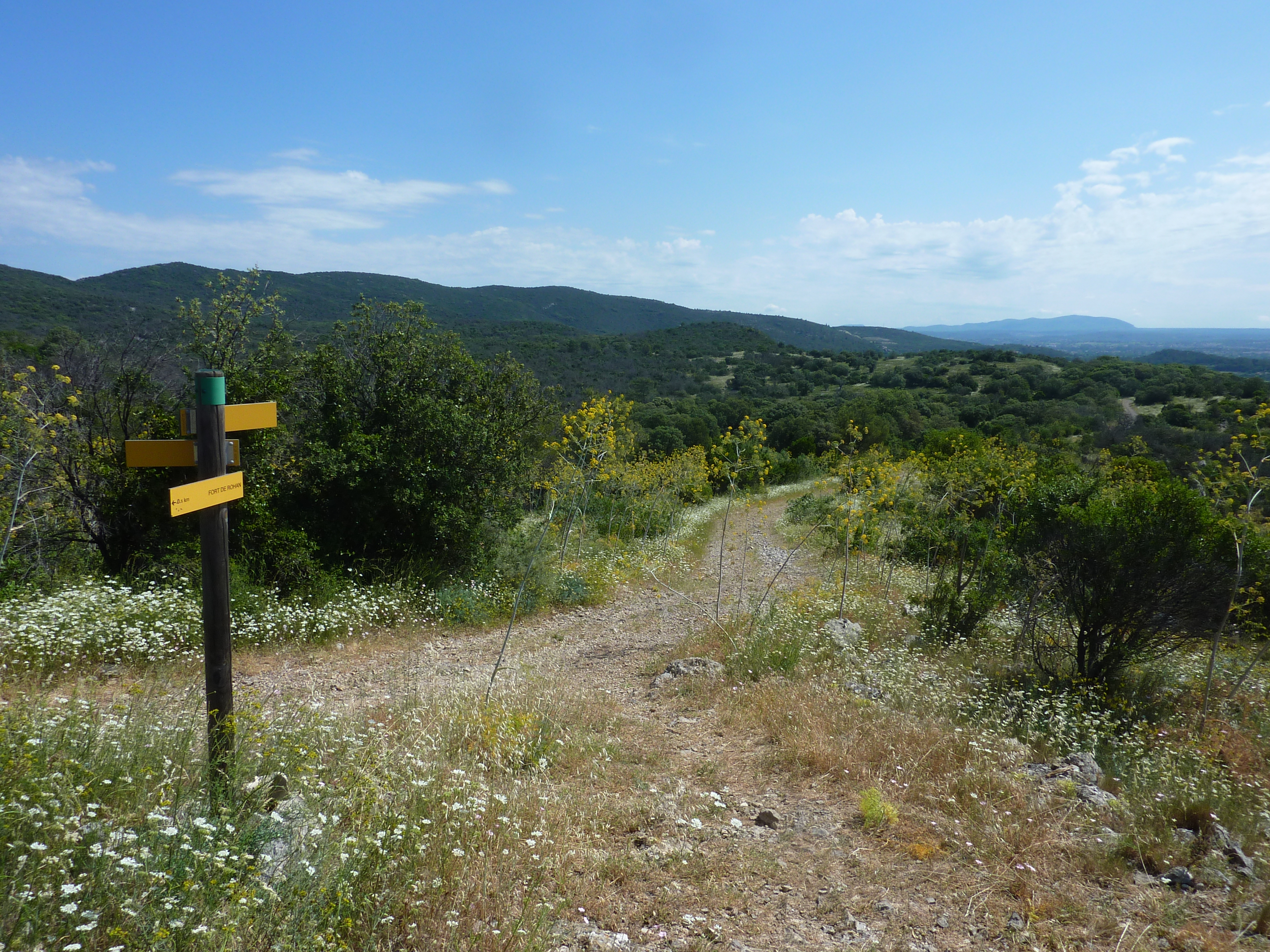 Peyremale (284 m) : suivre le chemin montant sur la gauche direction Ancien Fort de Rohan, balisé en jaune (le large chemin partant légèrement sur la droite mène également au Fort de Rohan)