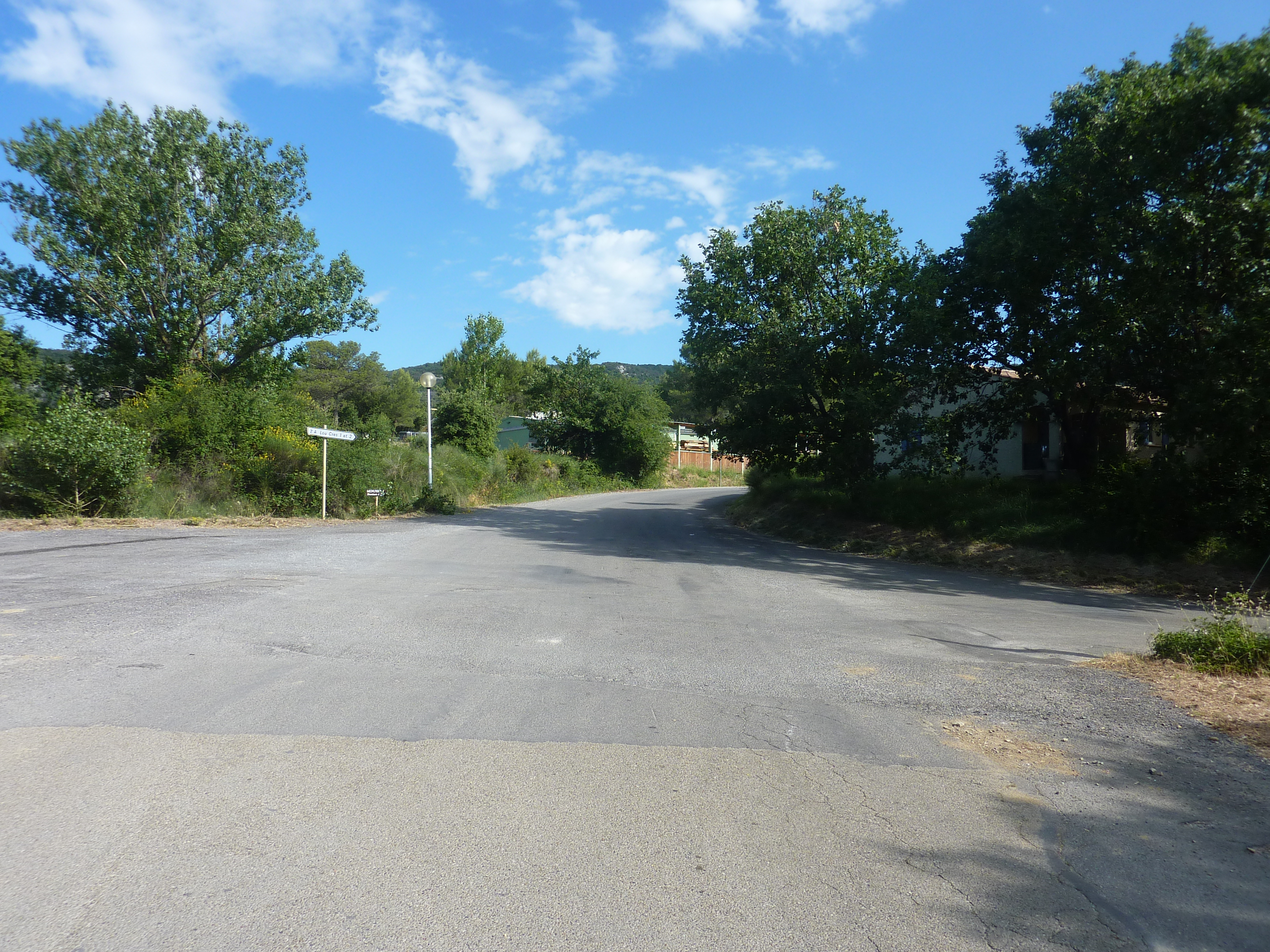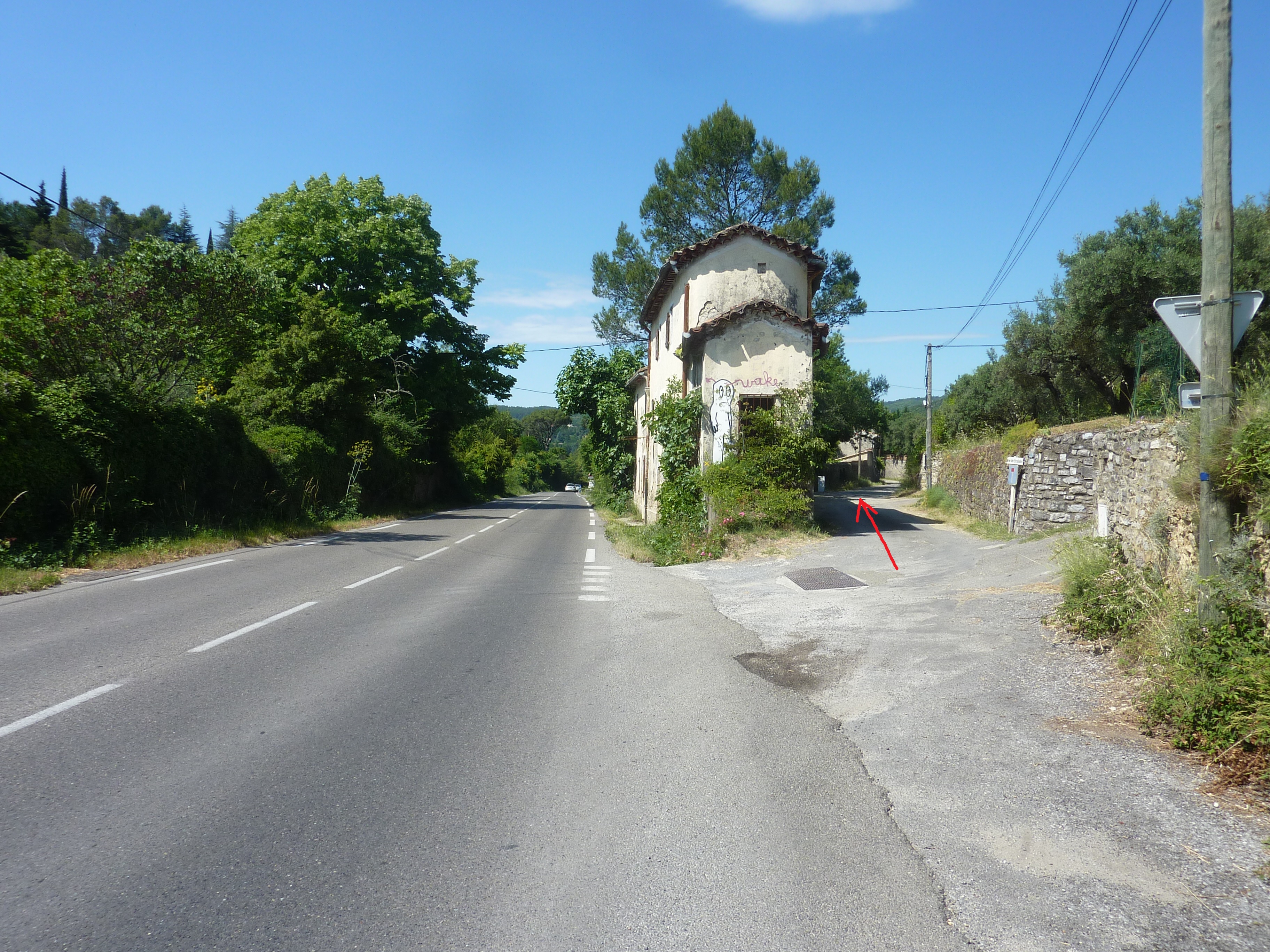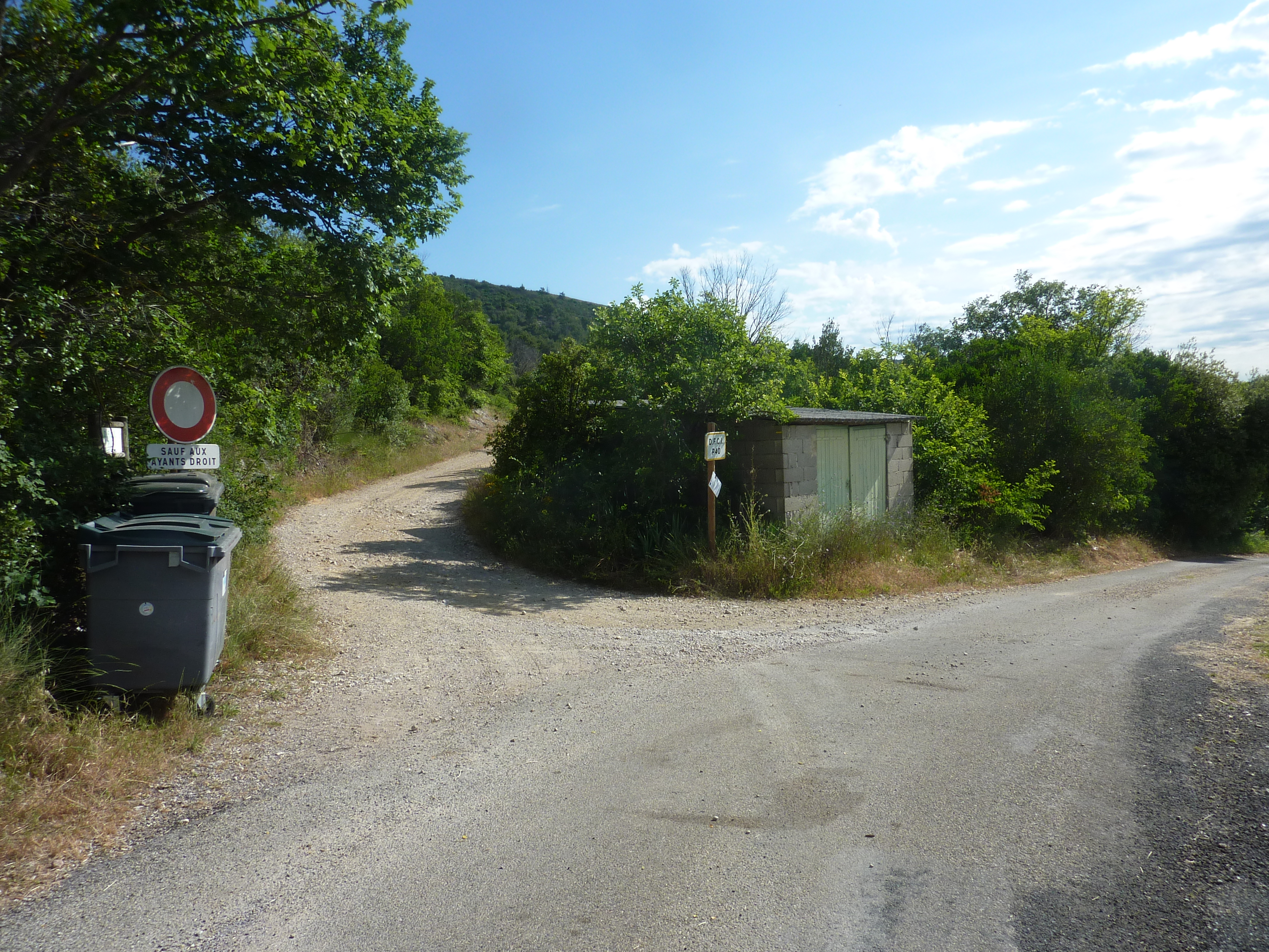A cette intersection (300 mètres après le lieu-dit "Les Escalades"), quitter la D910A pour suivre la route partant sur la droite et montant raidement par la suite direction Pouillan, balisé en jaune
