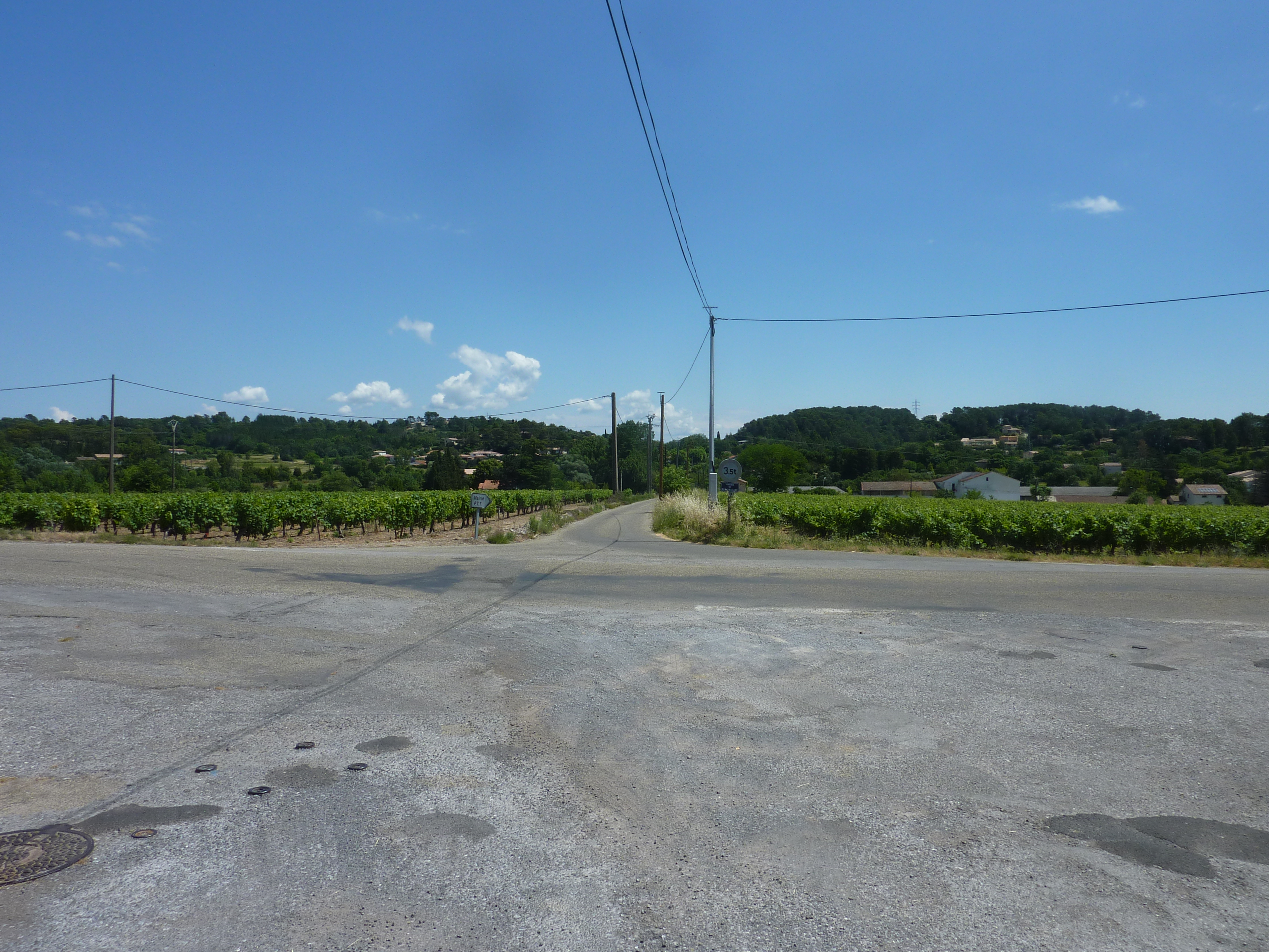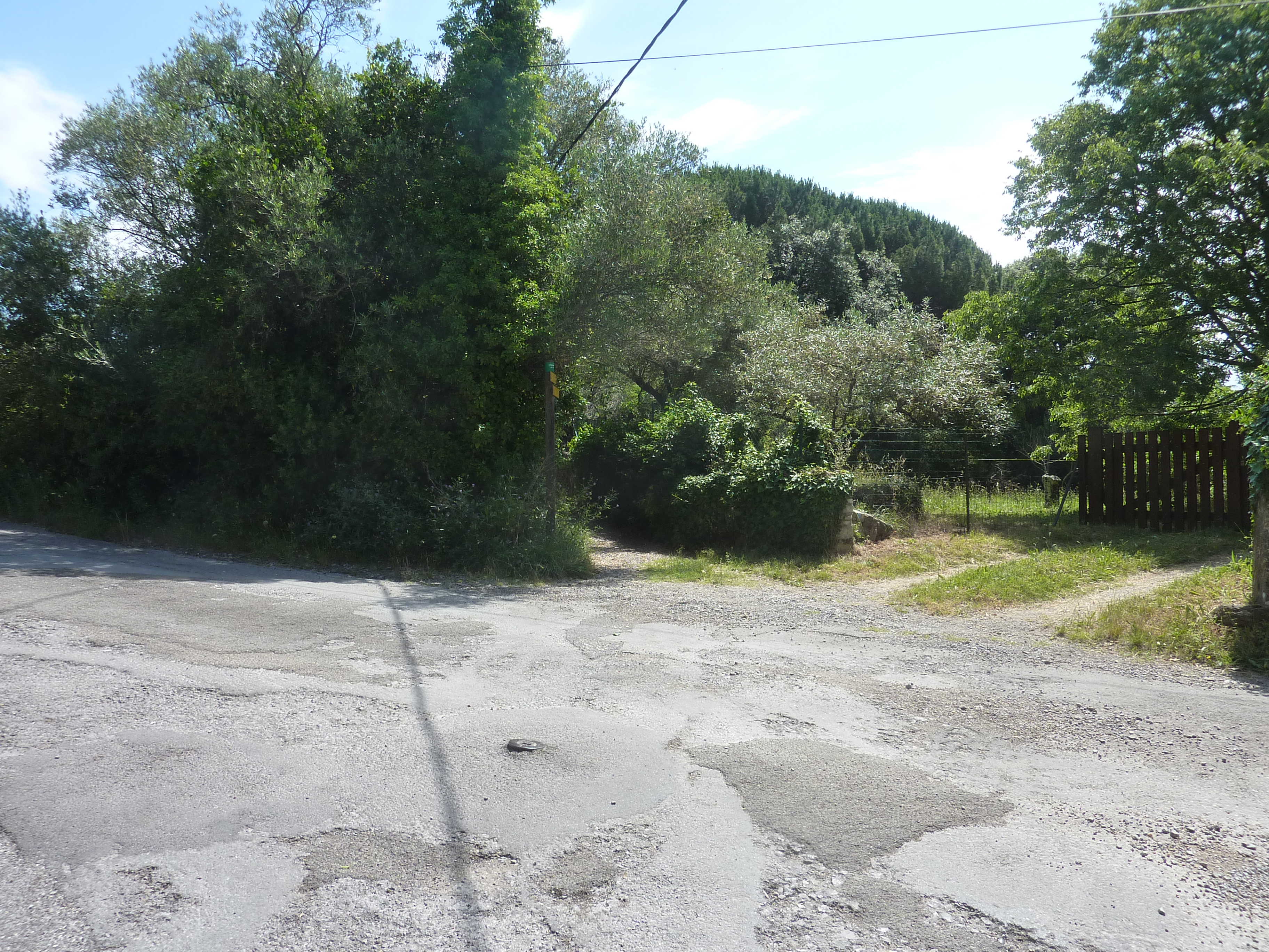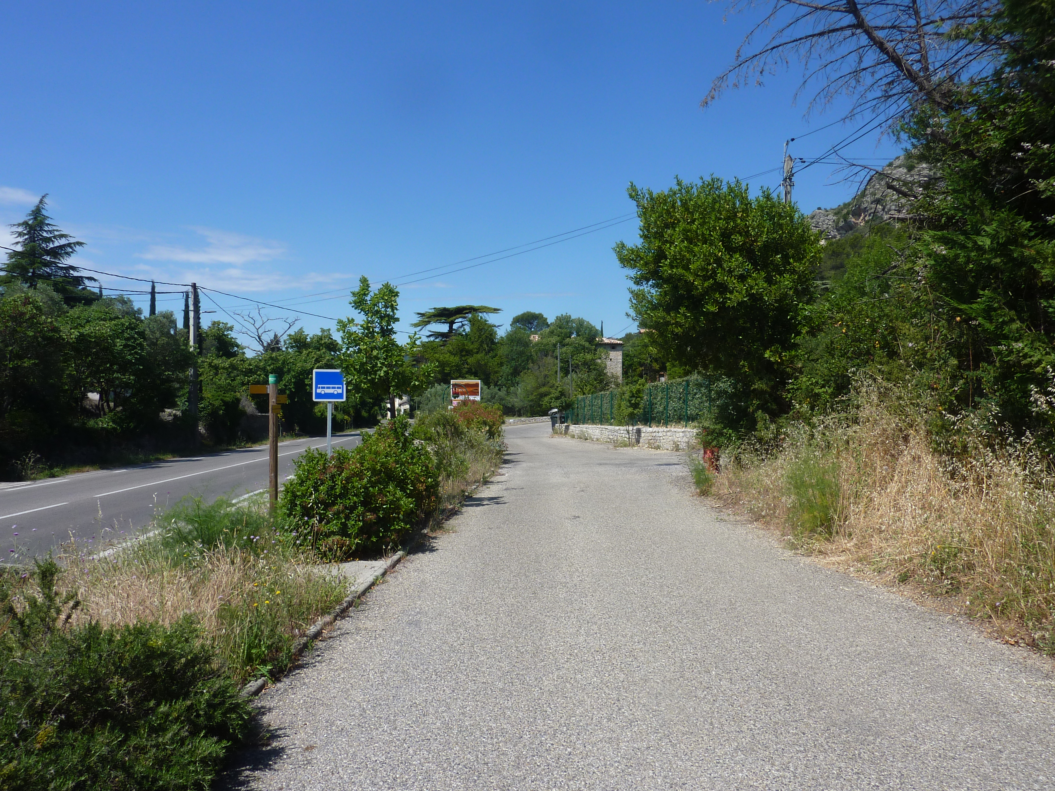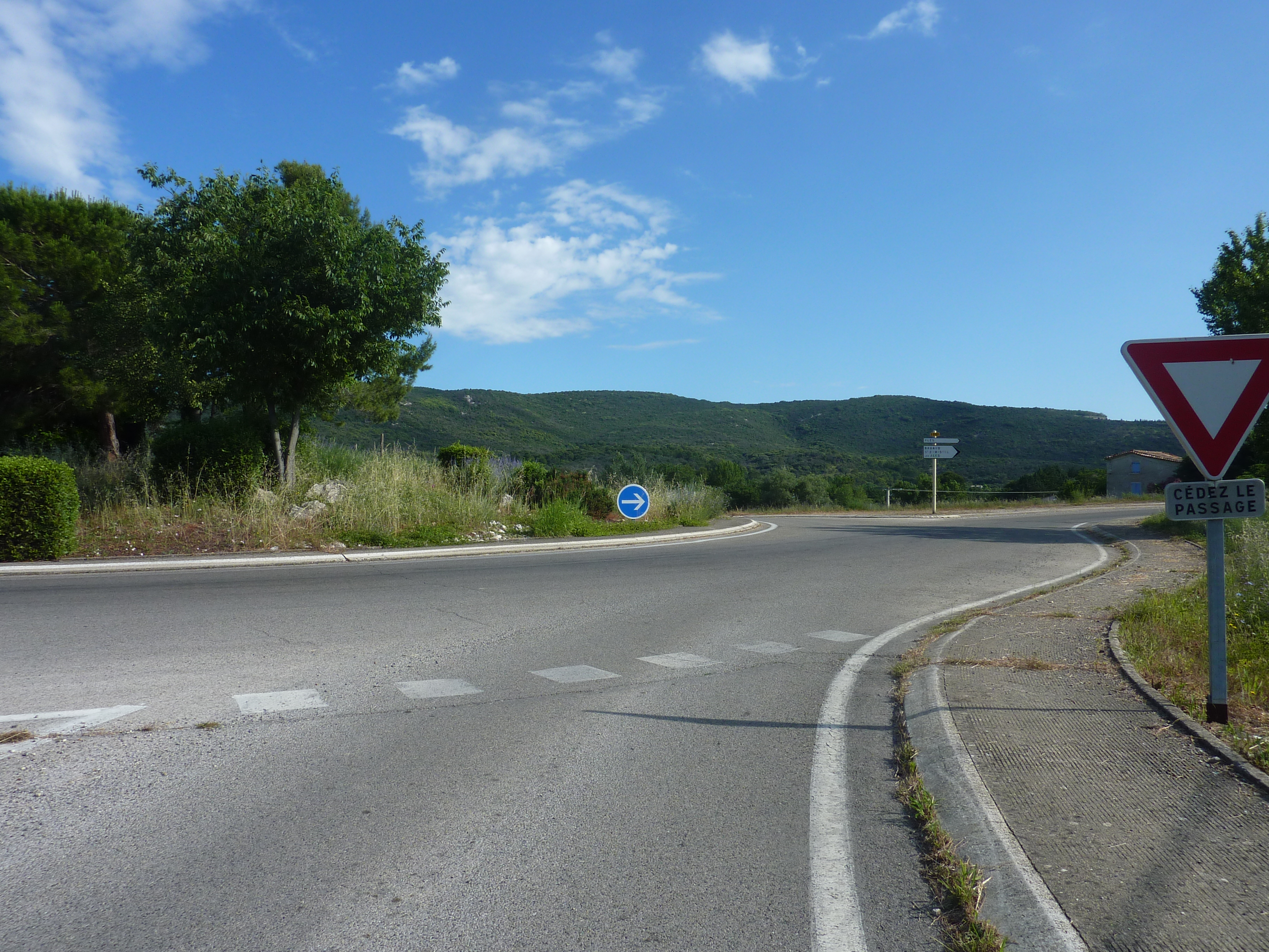 A cette intersection (300 mètres après le lieu-dit "Les Escalades"), quitter la D910A pour suivre la route partant sur la droite et montant raidement par la suite direction Pouillan, balisé en jaune