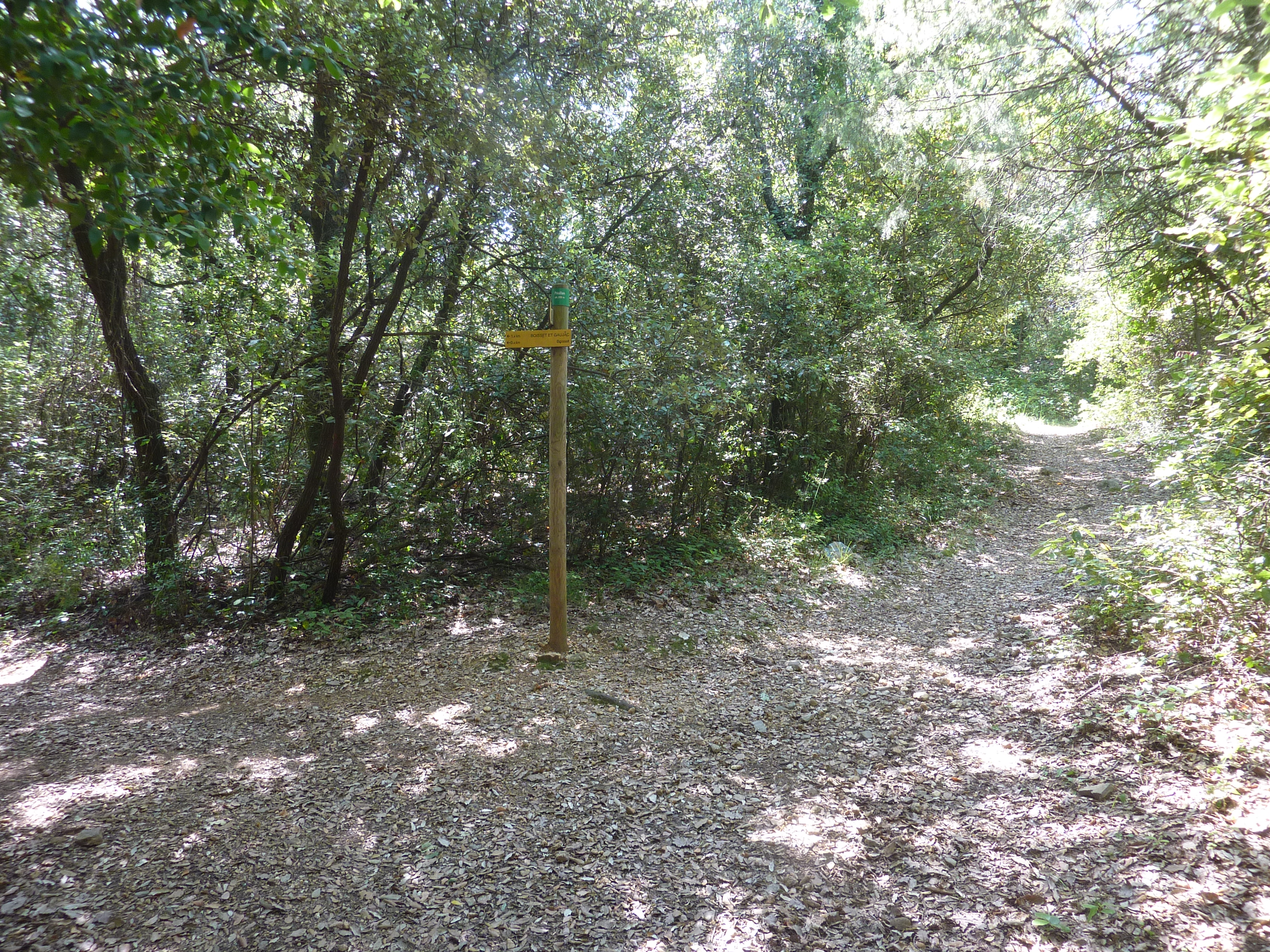 Pouillan (220 m) : suivre le chemin partant sur la droite direction Boisset-et-Gaujac, balisé en jaune dorénavant
